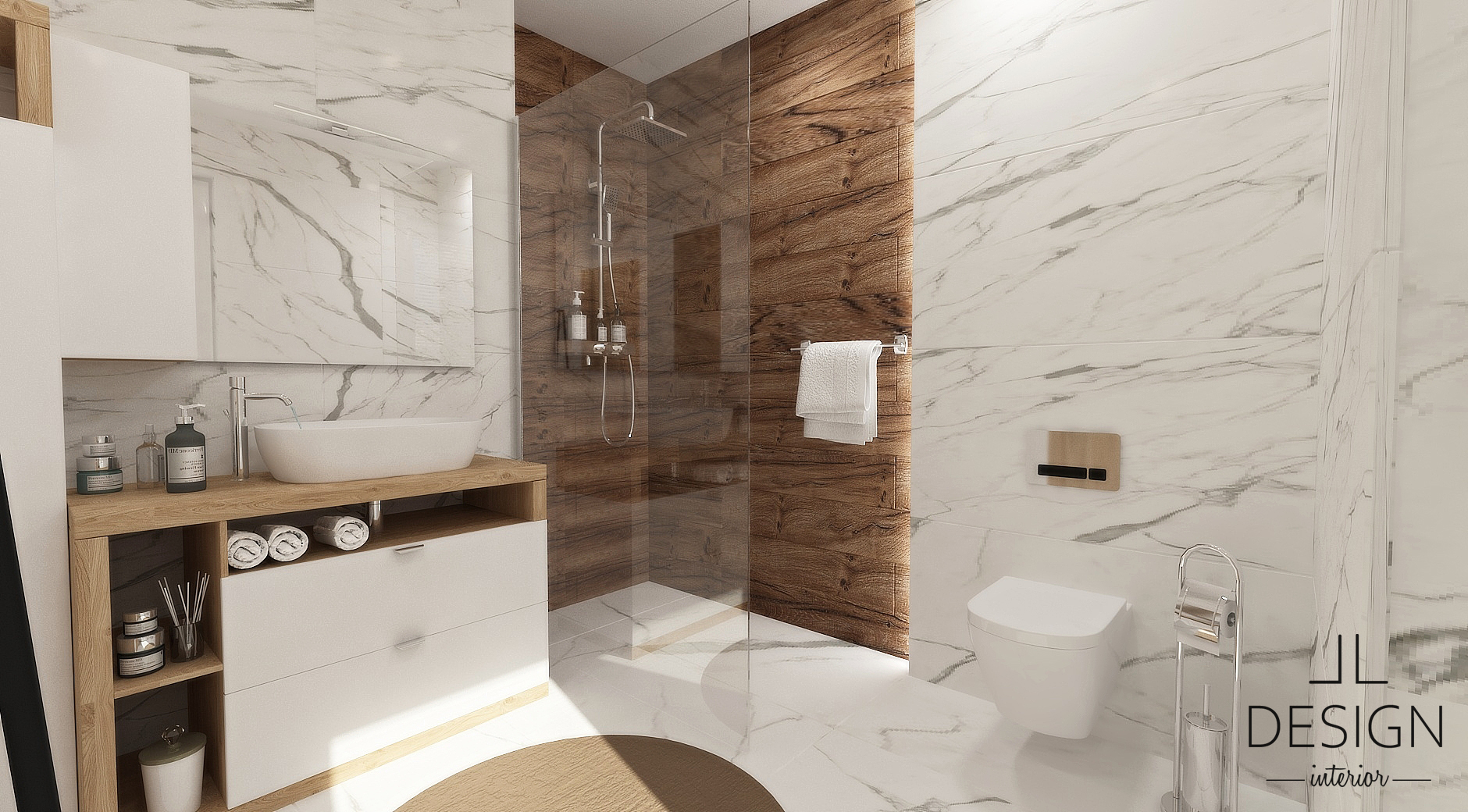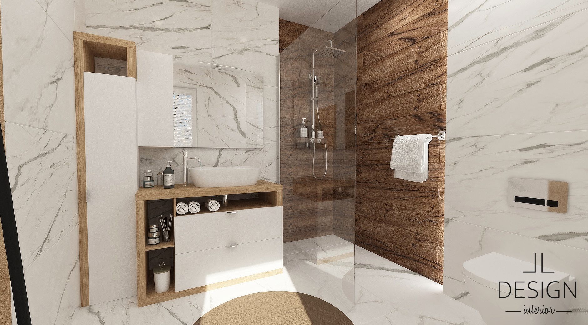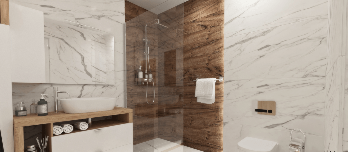 Pokud toužíte po elegantní koupelně, skvělou volbou je mramor (respektive obklad s mramorovým dekorem), ať už v bílé a šedé, nebo i v tmavších odstínech. Aby prostor nepůsobil jednotvárně, doporučujeme kombinovat zvolený obklad s jiným odstínem nebo odlišným dekorem. Interiér tak získá na útulnosti, opticky se rozčlení a vytvoří se jednotlivé zóny. My jsme zkombinovali mramorový dekor s obkladem v imitaci dřeva, kterým jsme vizuálně oddělili sprchový kout. Zvolili jsme velkoformátový obklad, který díky menšímu množství spár působí estetičtěji a zároveň je praktičtější.