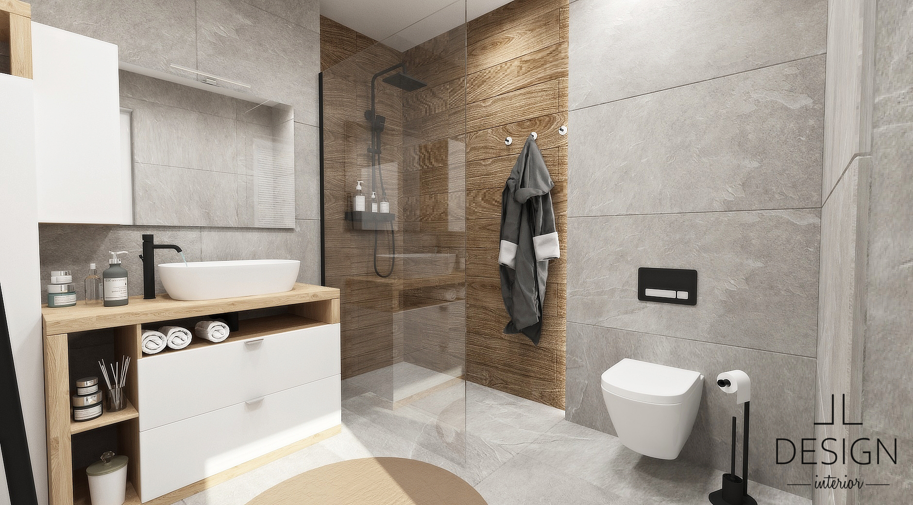 Pokud dáváte před elegancí přednost modernímu minimalistickému stylu, skvělou volbou může být obklad v imitaci betonu, který je typický svou surovostí a strukturou. Šedý odstín působí neutrálně a nadčasově, samotný materiál však může vyznít chladně, proto je vhodné jej doplnit dalším obkladem. Stejně jako u elegantního stylu jsme i zde použili obklad v dekoru dřeva k vymezení sprchové zóny.