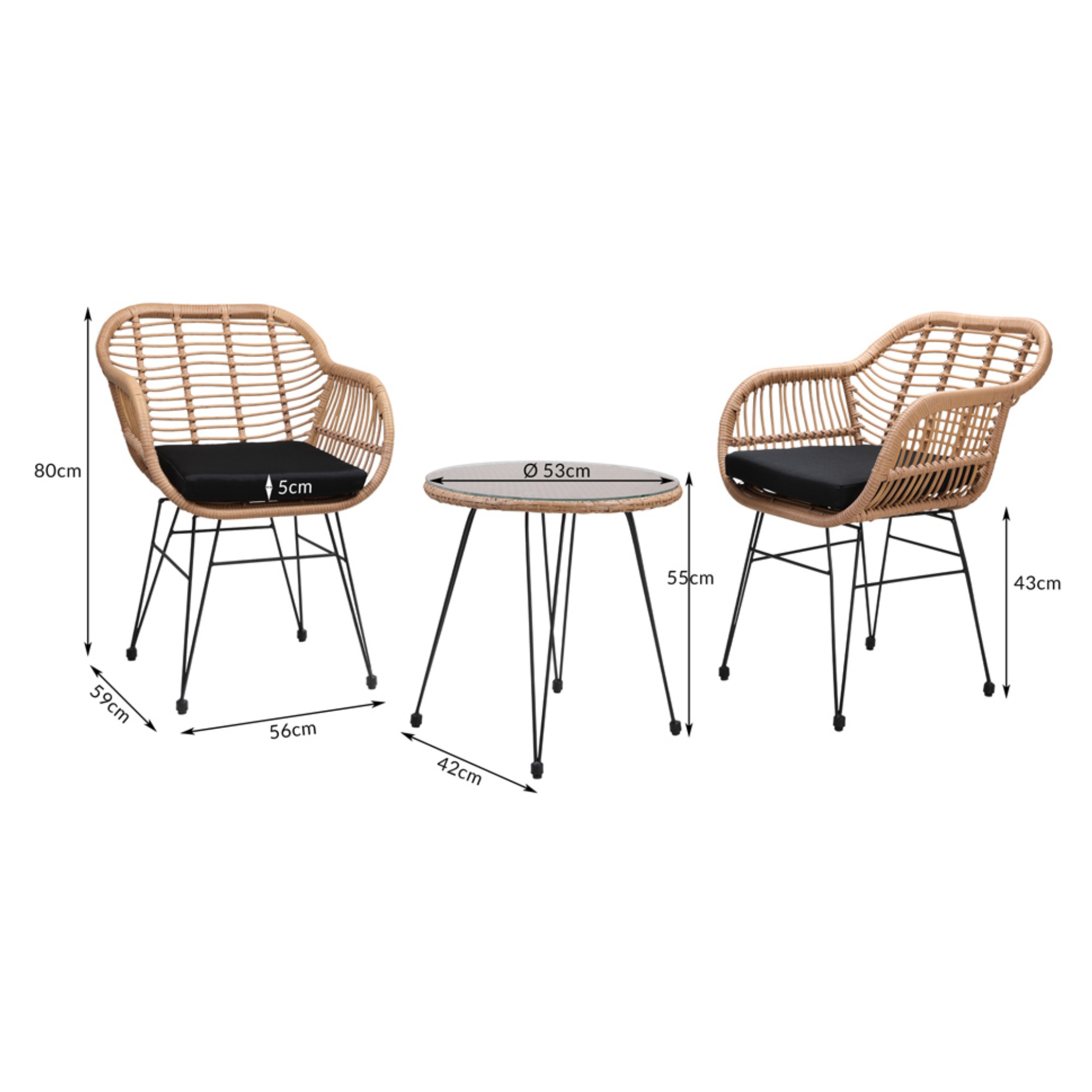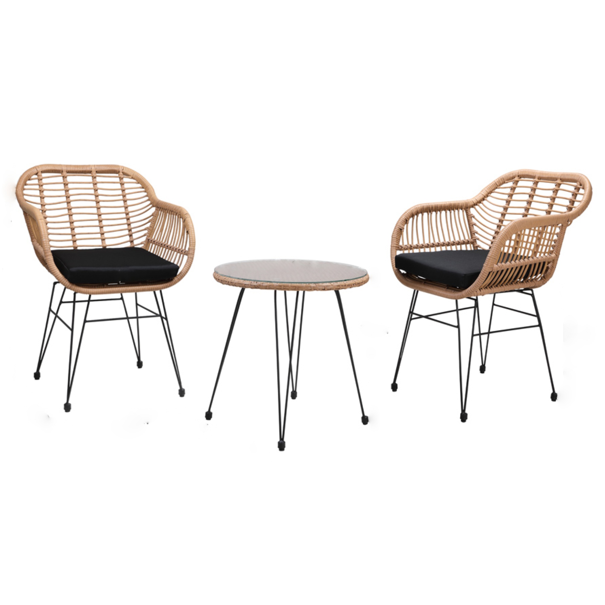 Moderní balkonový set BALI se skládá ze stolu a 2 židlí s područkami.
