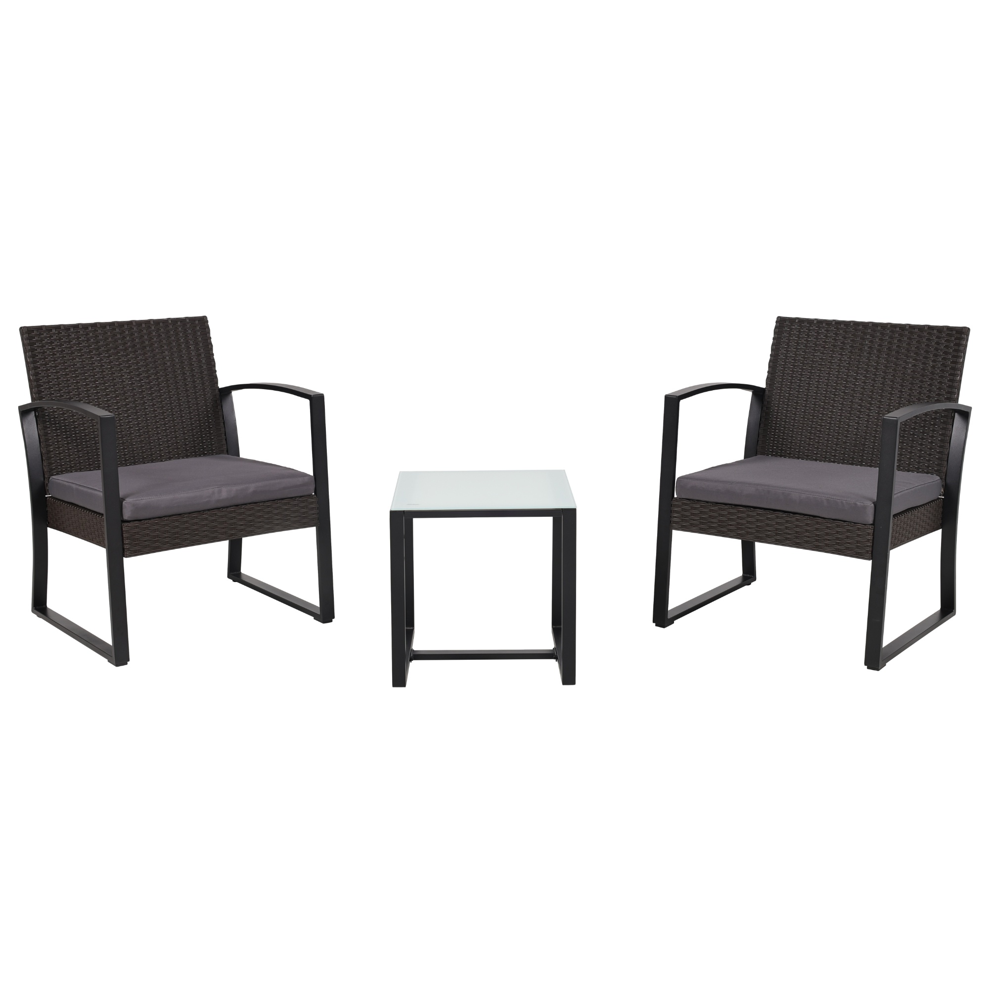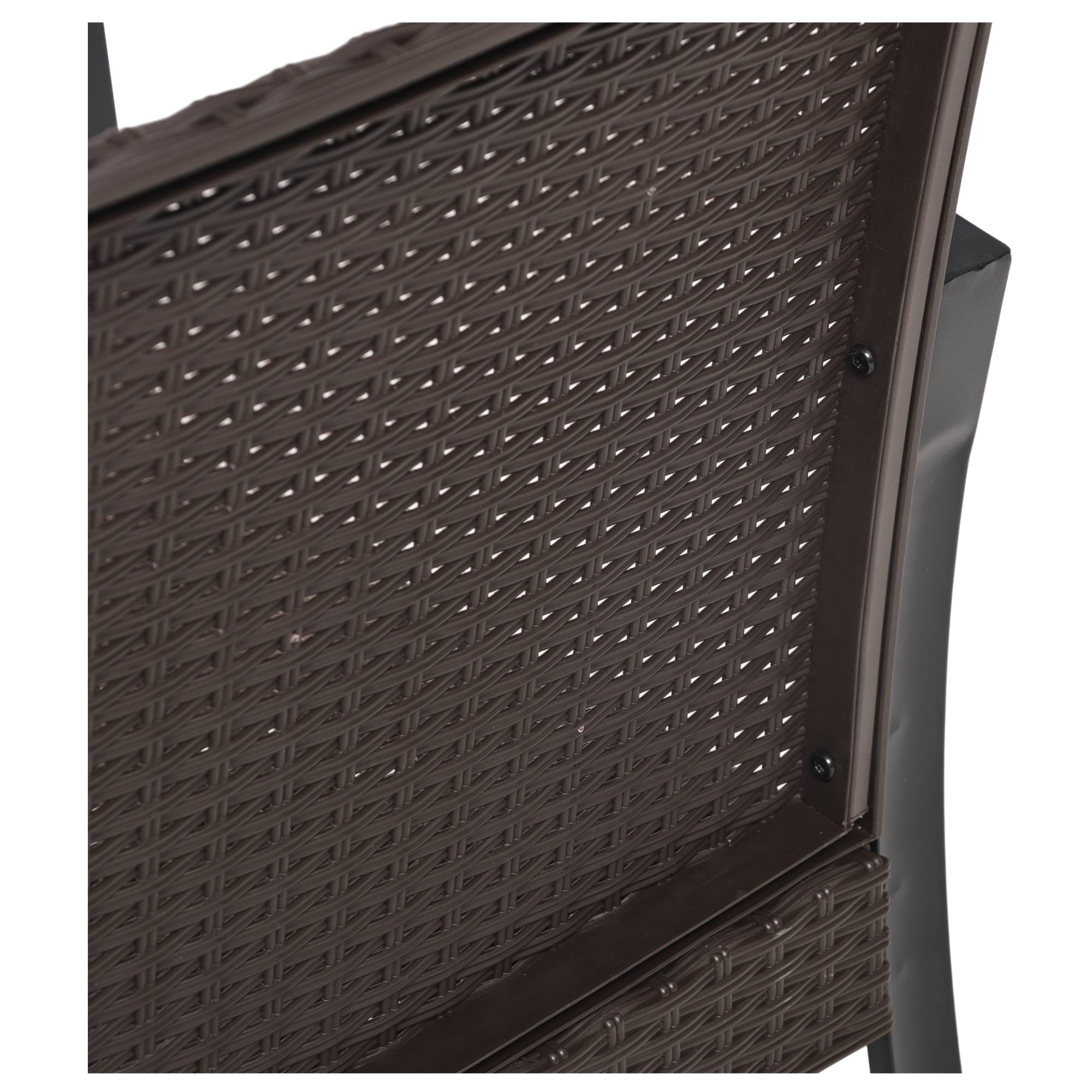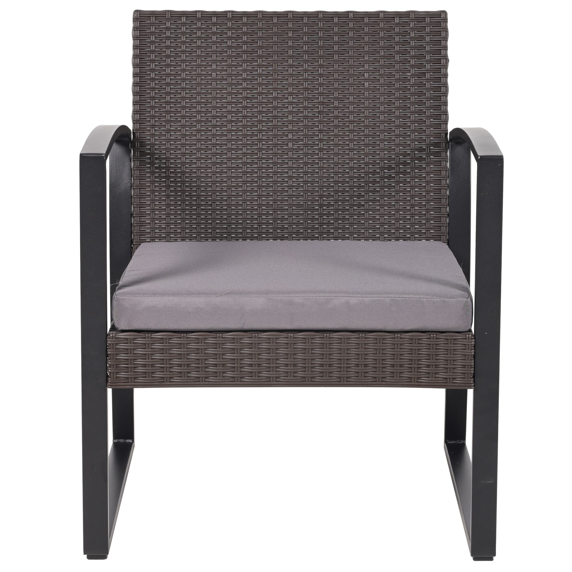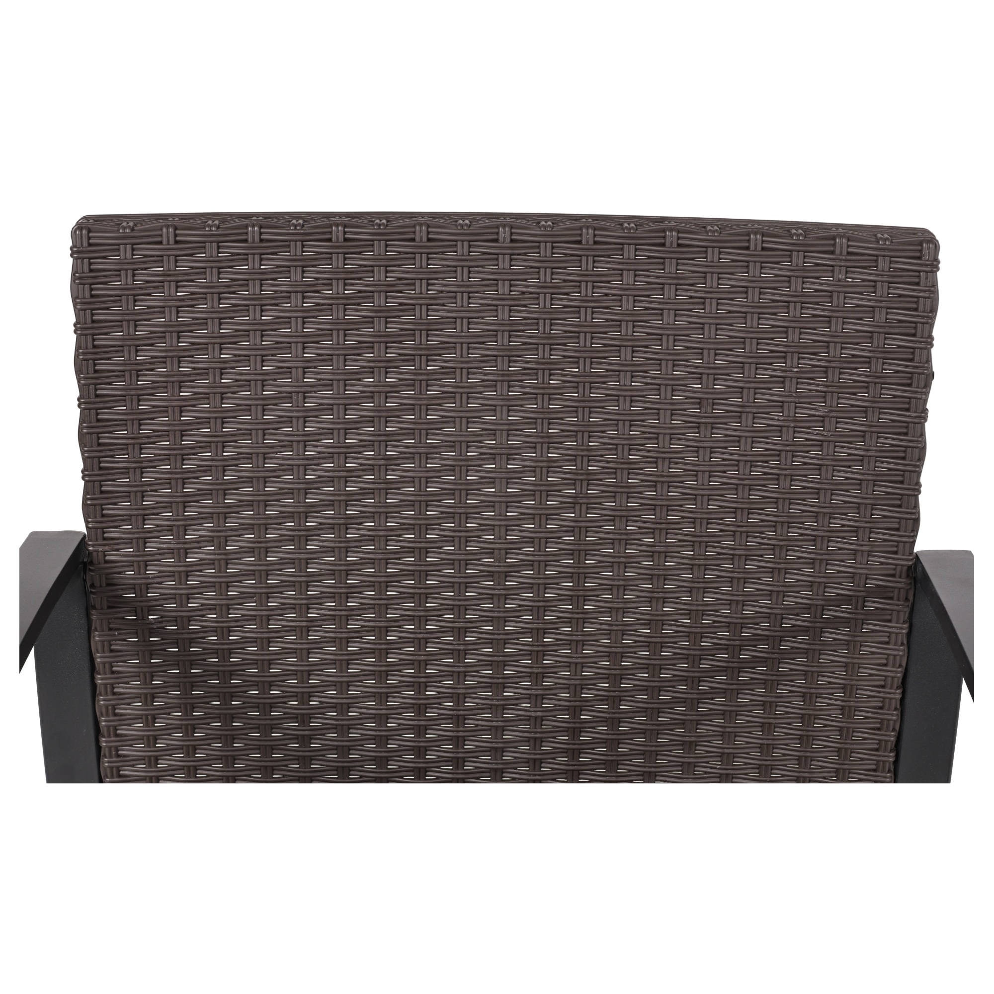 Tento set zahrnuje stolek a dvě křesla. Jeho černá kovová konstrukce je opletena polyratanem v hnědé barvě, což nejen podtrhuje jeho elegantní vzhled, ale zároveň zajišťuje vysokou odolnost, dlouhou životnost a minimální nároky na údržbu.