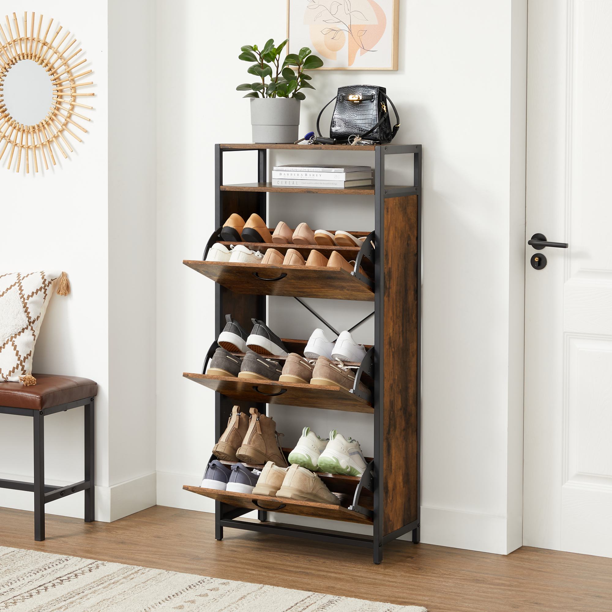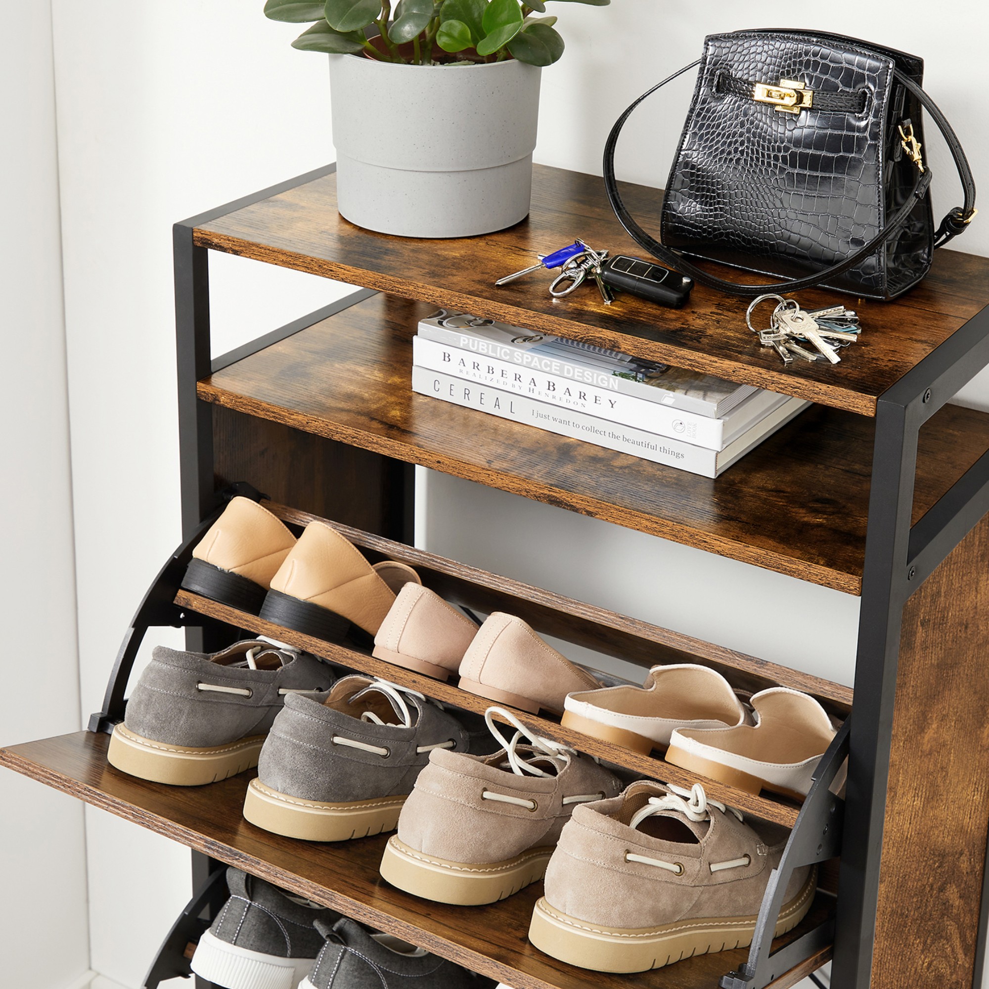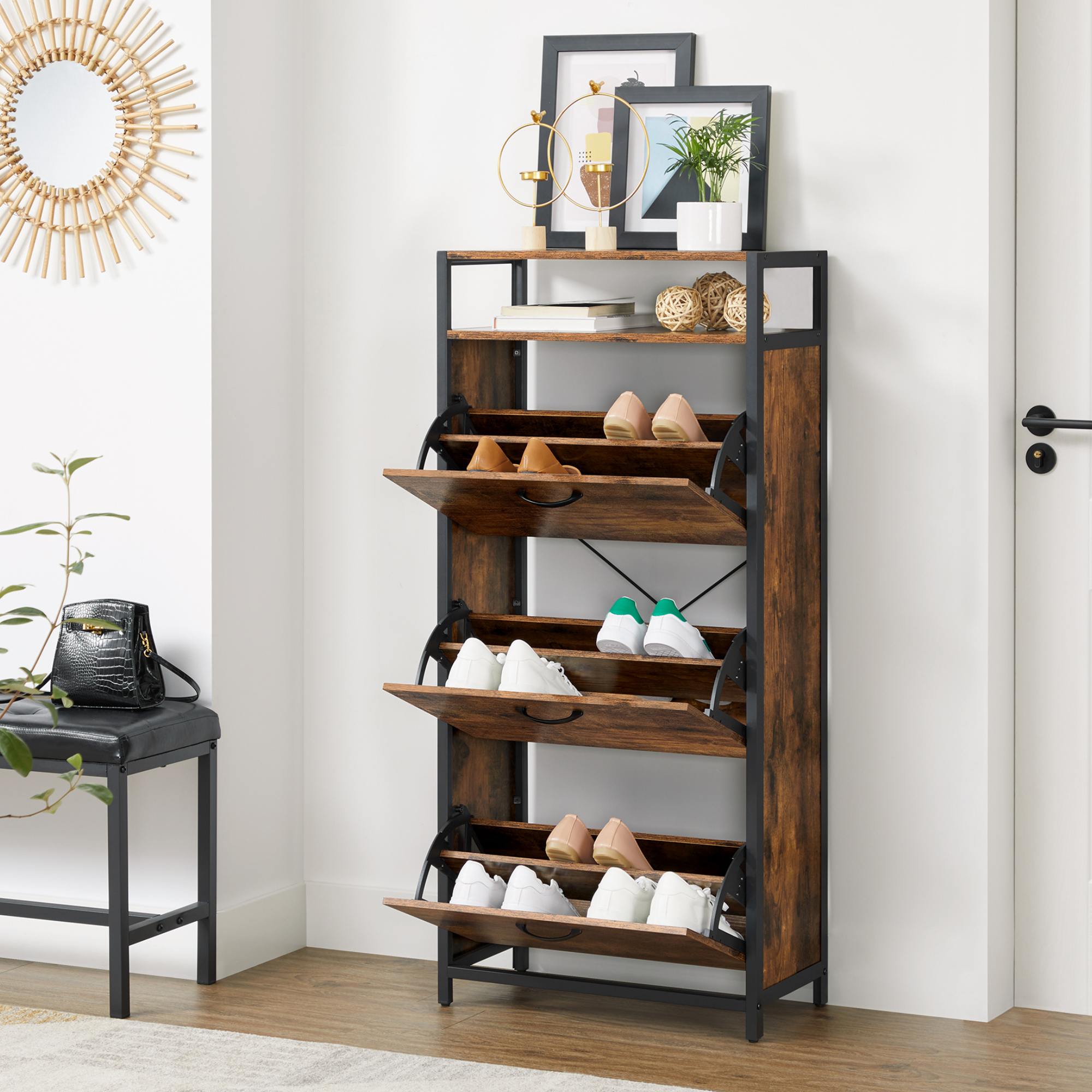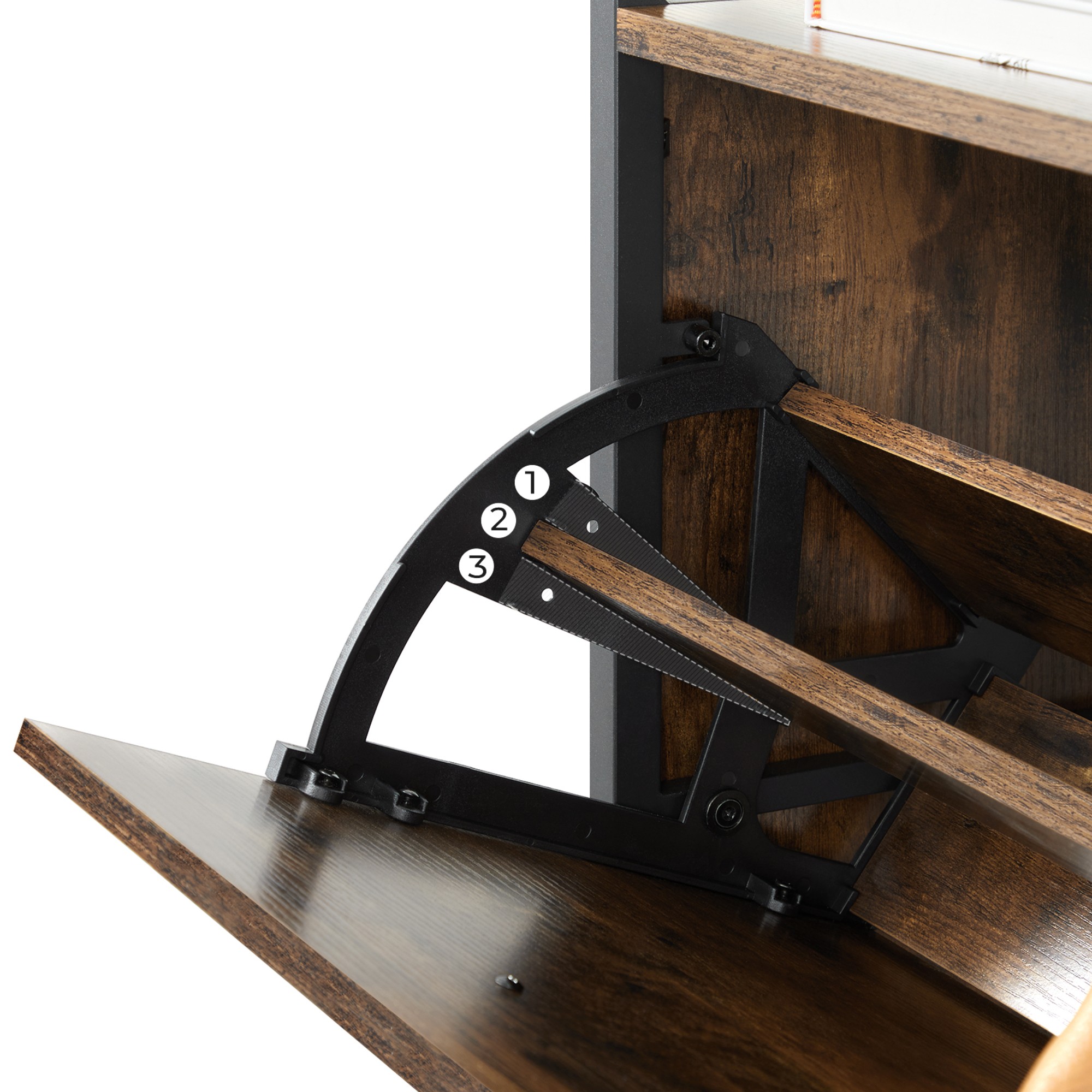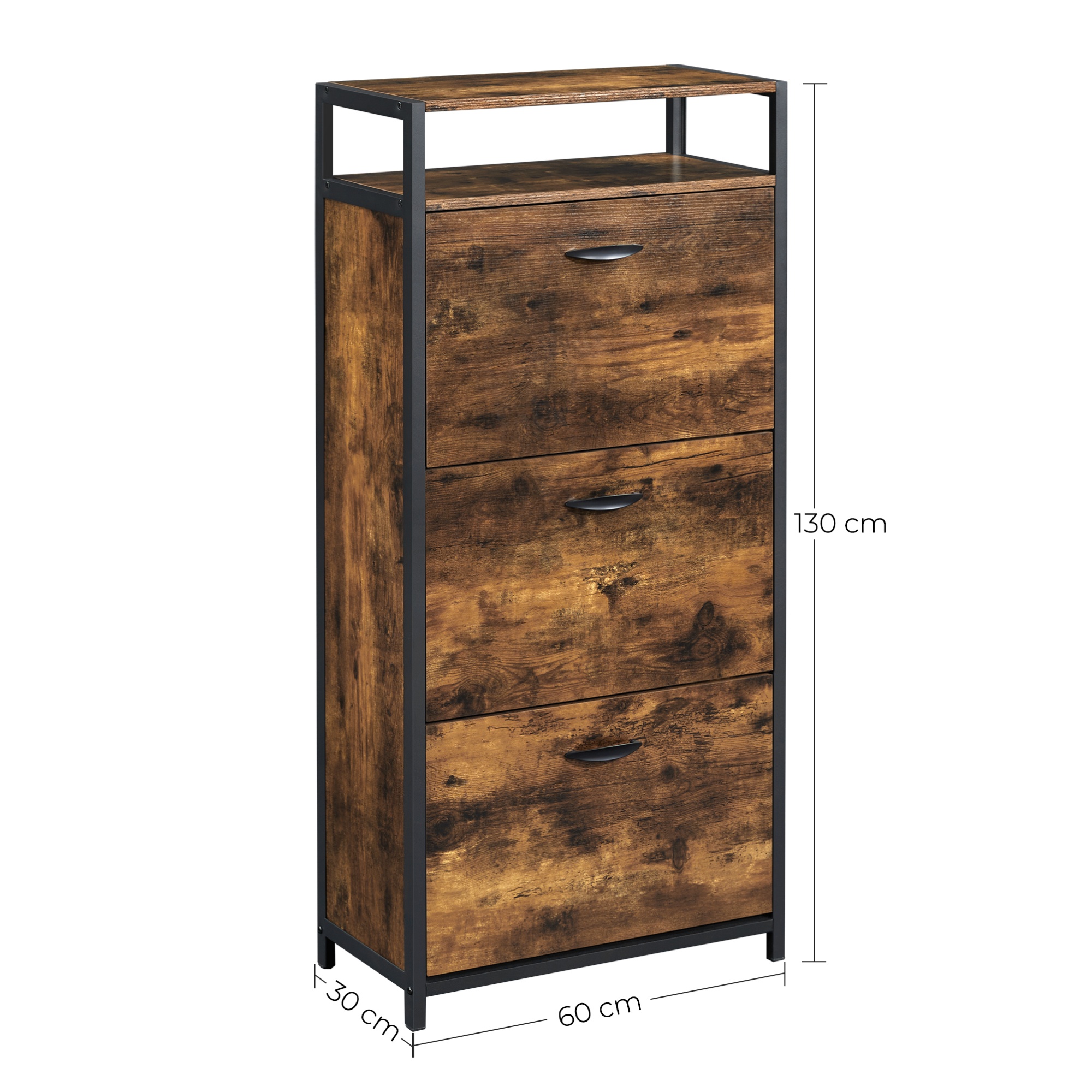 Kombinace kovu a dekoru dřeva se bude vyjímat v moderní nebo lehce industriálně zařízené domácnosti. Do boxů za výklopnými dvířky snadno umístíte cca 15 párů a vaše předsíň bude působit uklizeně a vy budete mít o vašich botách přehled. Police lze variabilně nastavit dle velikosti bot. Horní desku a otevřený odkládací prostor zase nabízí místo pro klíče nebo neroztříděnou poštu. S případnými nerovnostmi podlahy si poradí nastavitelné nožky. Pro lepší stabilitu doporučujeme botník připevnit ke zdi příchytkou pro upevnění ke zdi, která je součástí botníku.