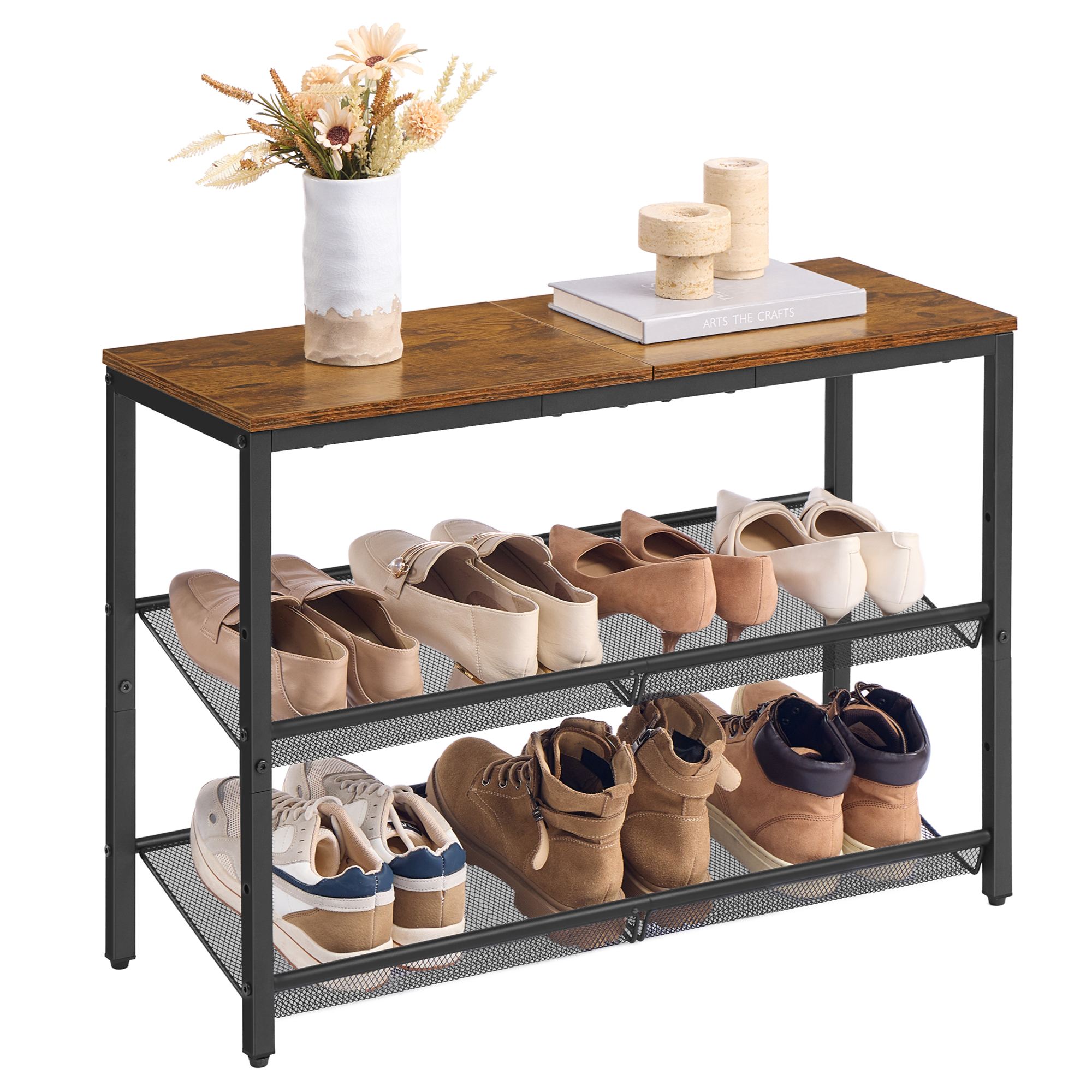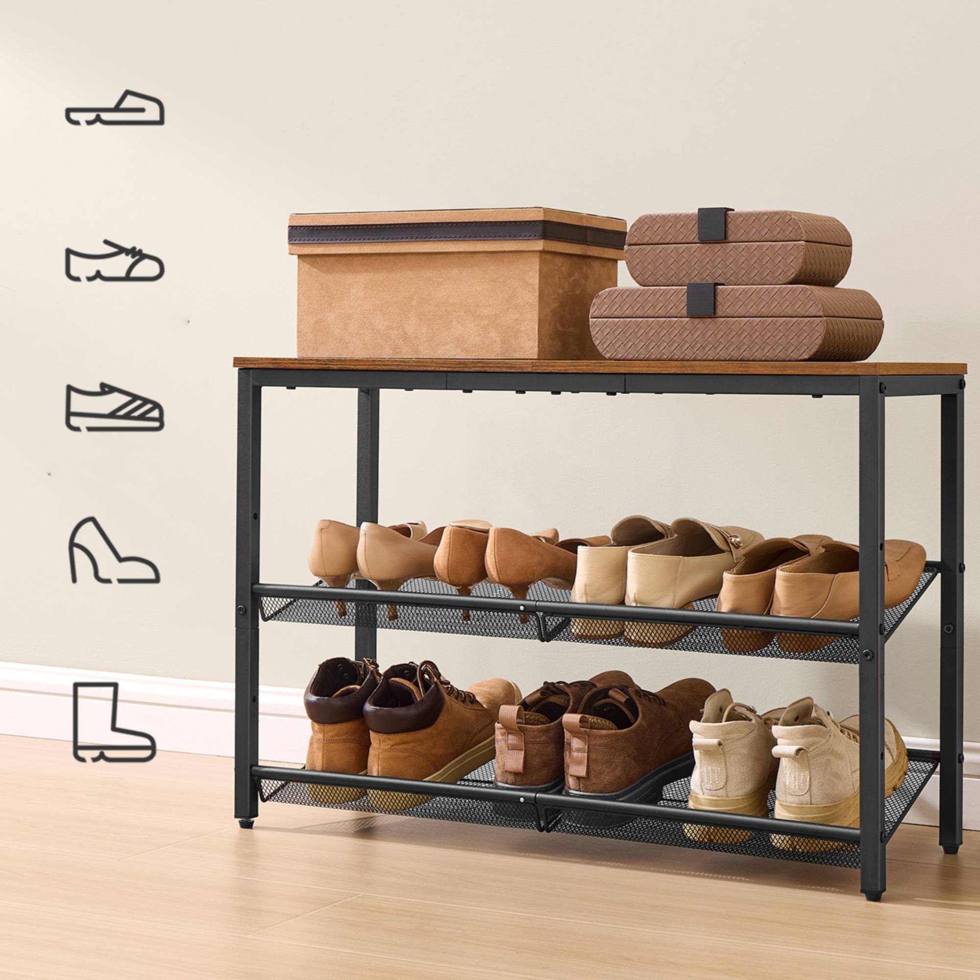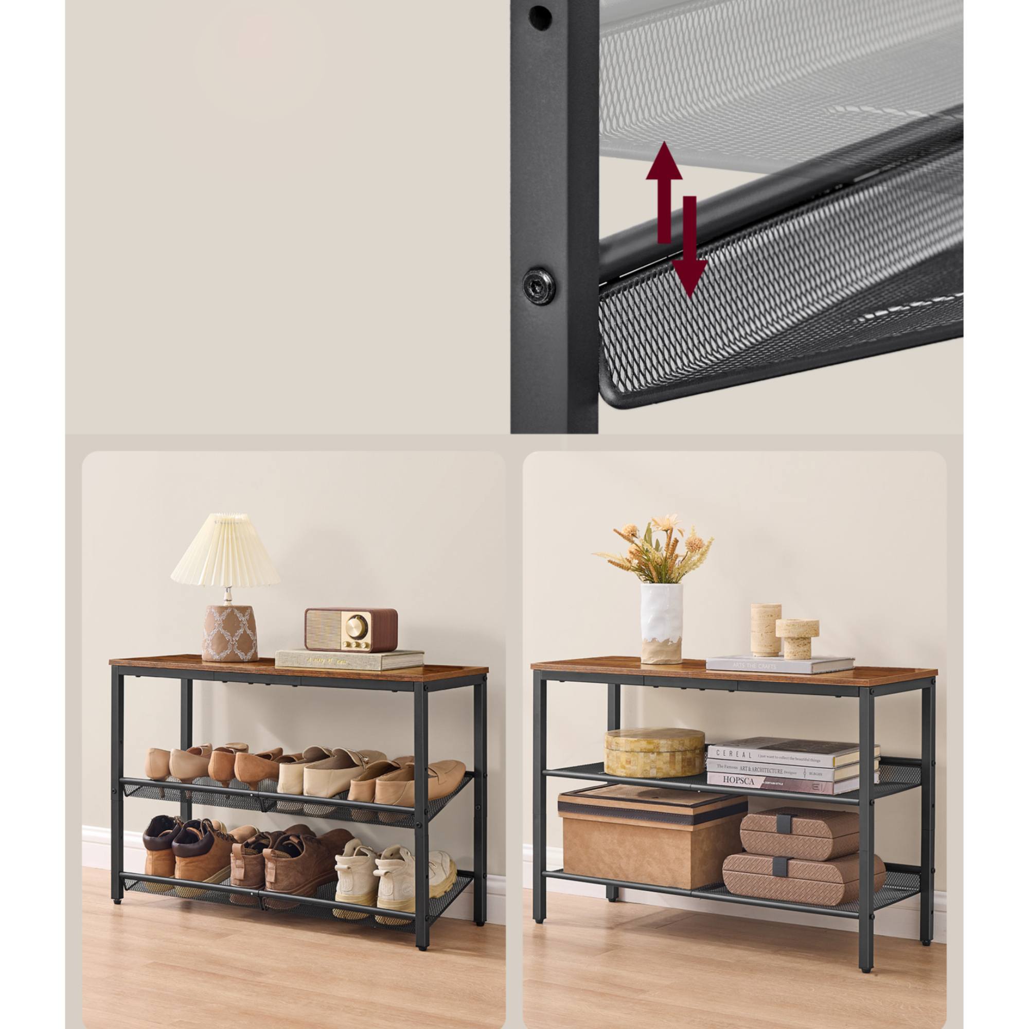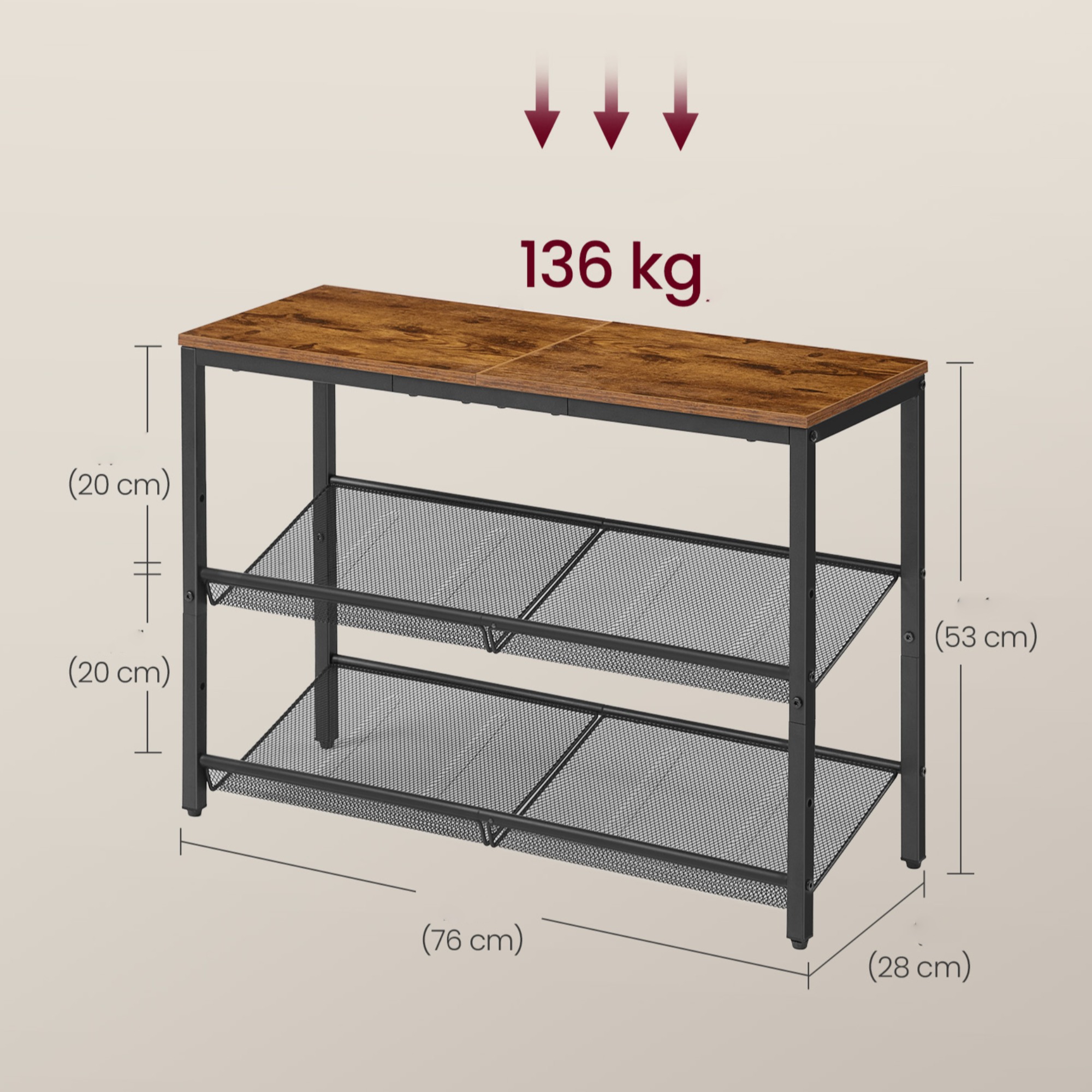 Pevná a stabilní konstrukce tohoto botníku je vyrobena z ocele. Horní deska je ze snadno udržovatelného laminovaného dřevotřískového materiálu.