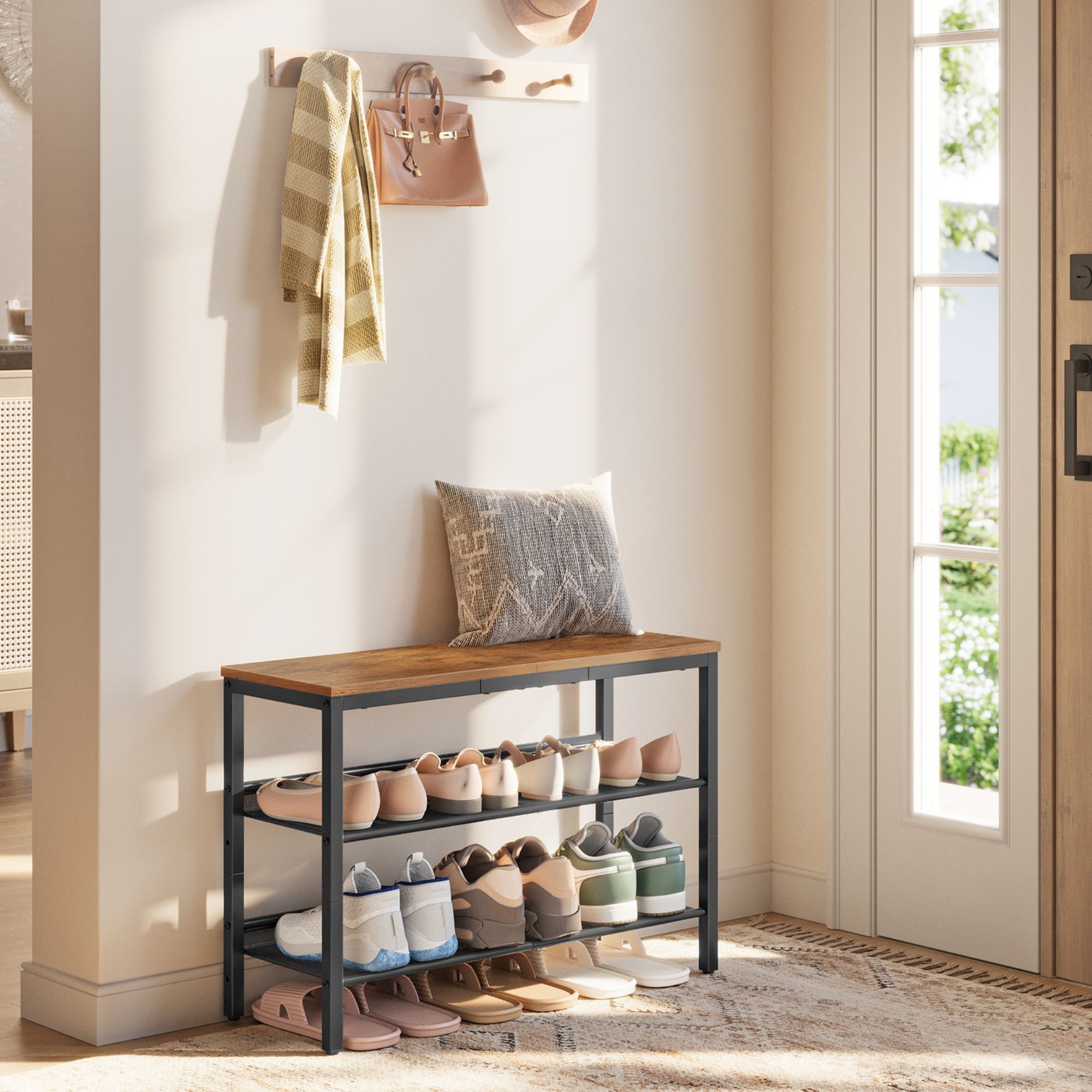 Botník s lavicí ENTRY 2 vyhotovený v industriálním stylu v sobě kombinuje místo na sezení a úložný prostor.