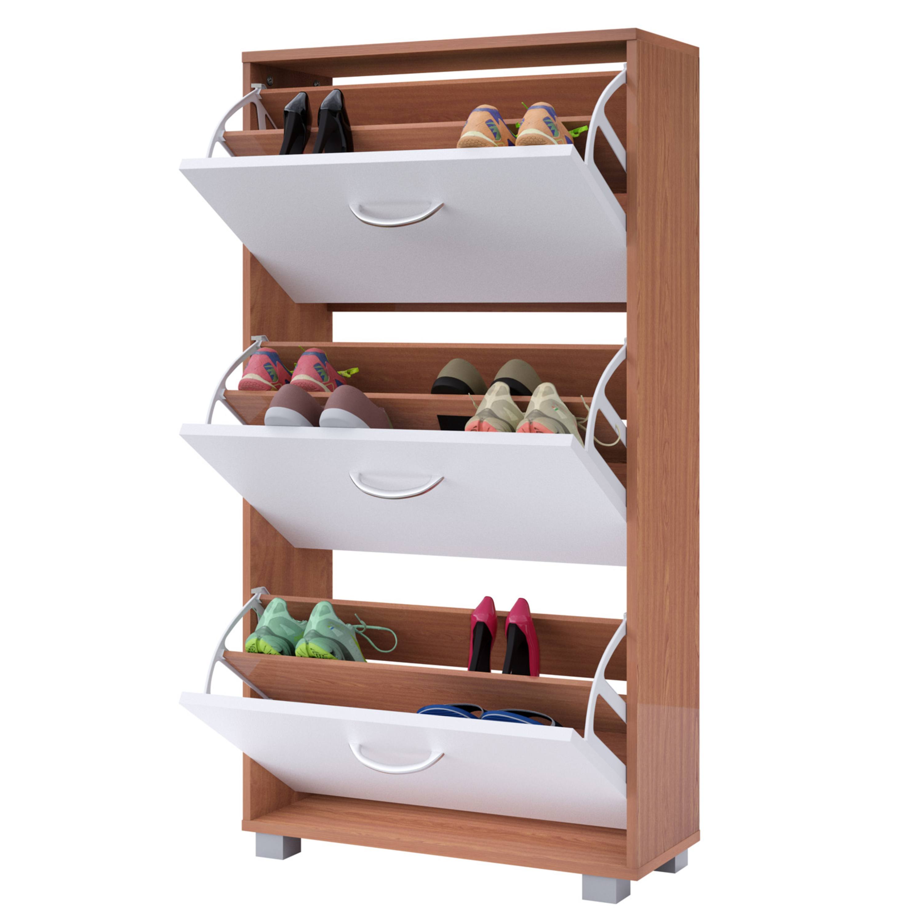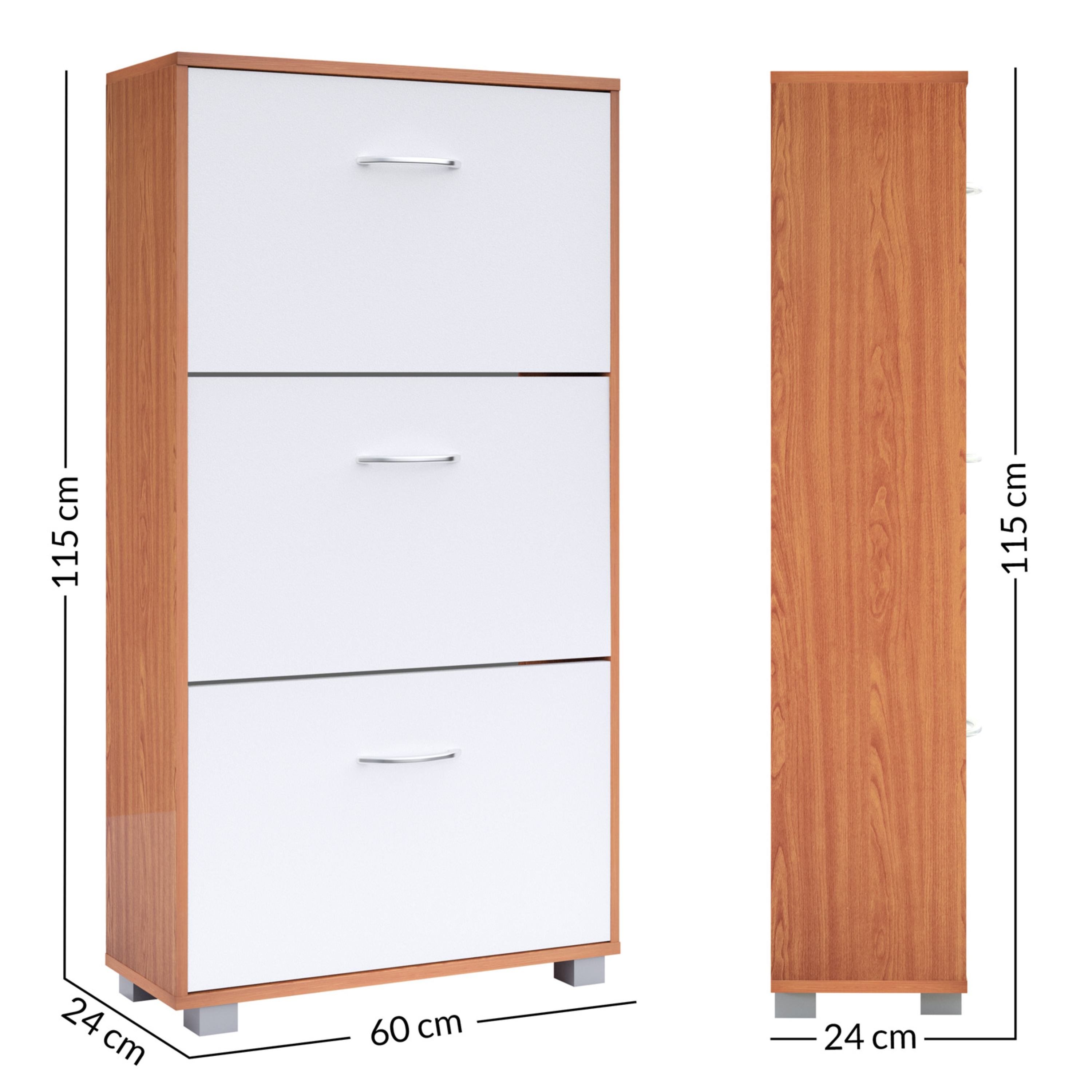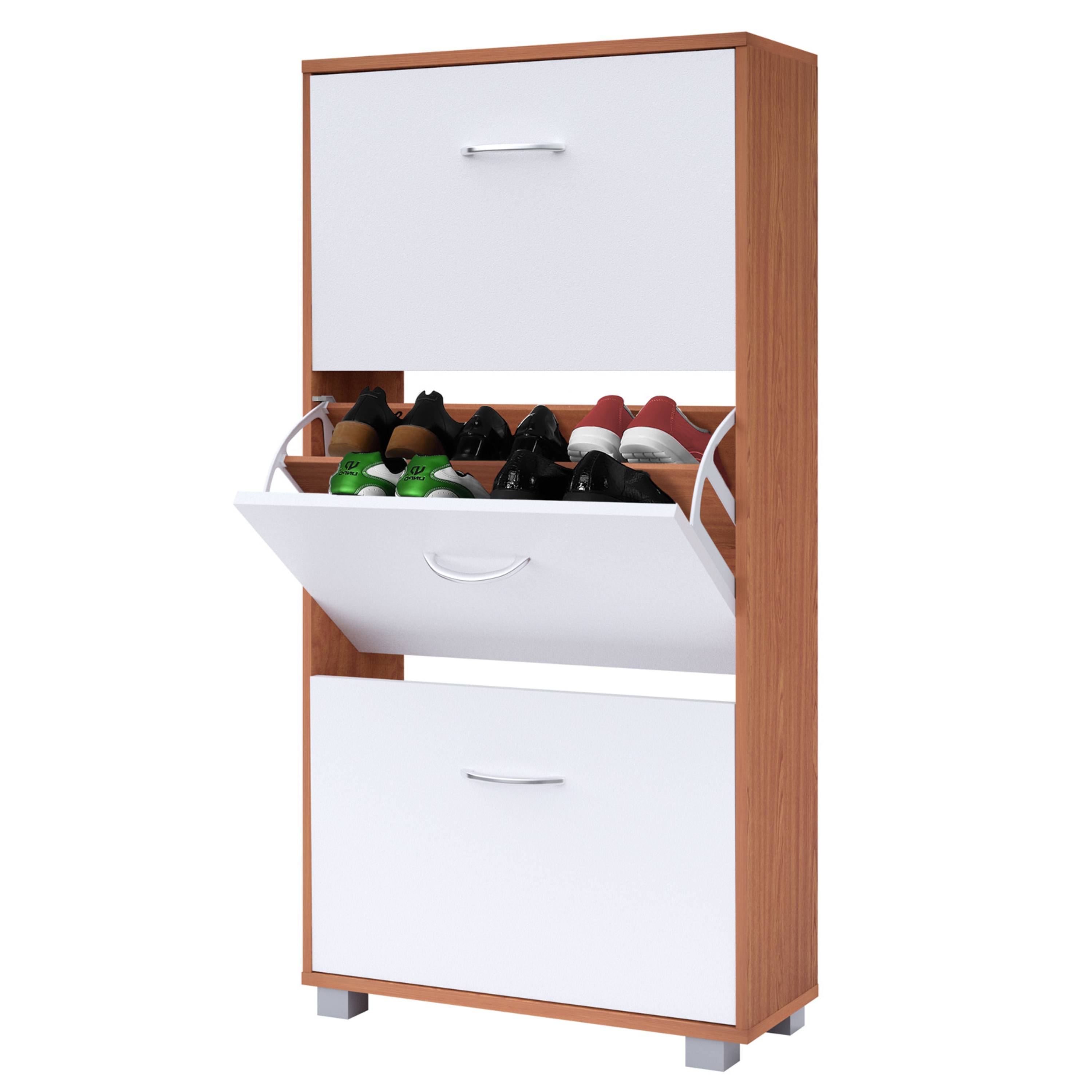 Úložné prostory za výklopnými dveřmi poskytují dostatek místa pro skladování až 18 párů obuvi do velikosti 45. Každá přihrádka je vybavena nastavitelnou a odnímatelnou přepážkou, takže se prostor snadno přizpůsobí různým typům obuvi. Snadnou každodenní manipulaci umožňují praktické hliníkové úchyty. Botník je vyroben z MDF materiálu s povrchem nenáročným na údržbu. Součástí balení je také pojistka proti převrácení, která zajišťuje větší stabilitu při plném zatížení.