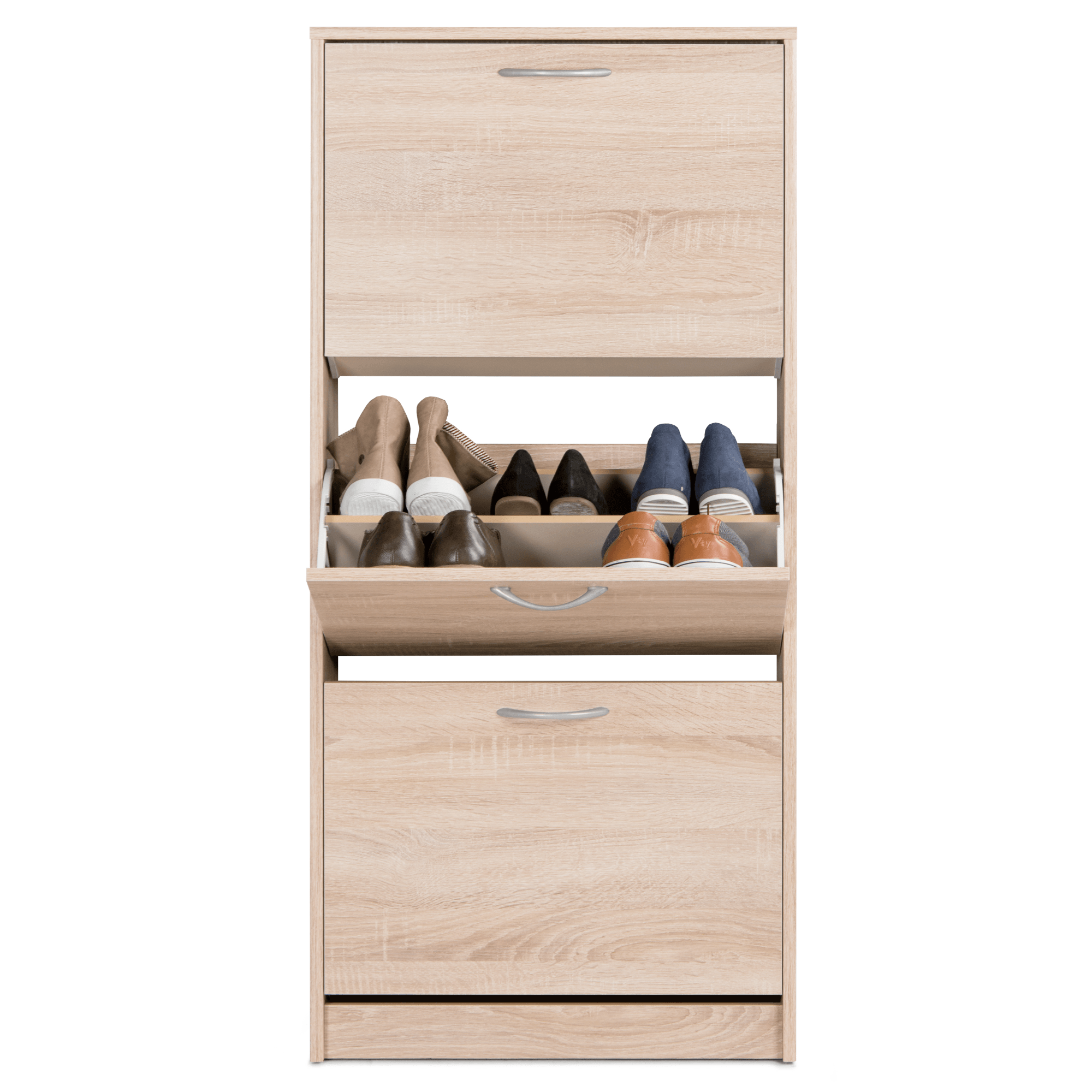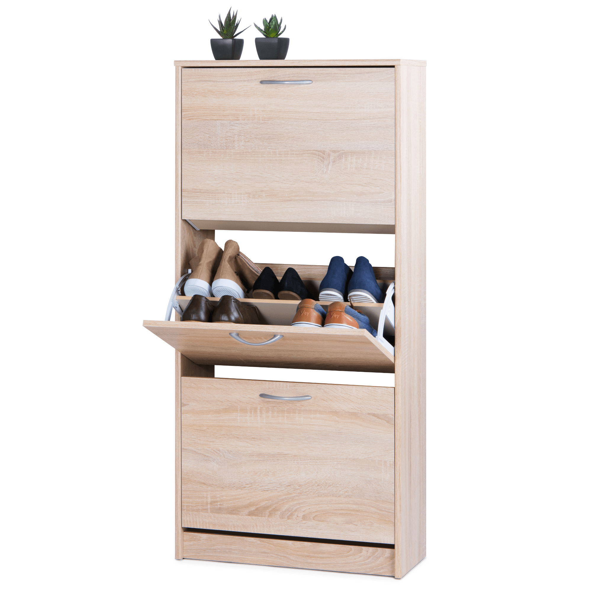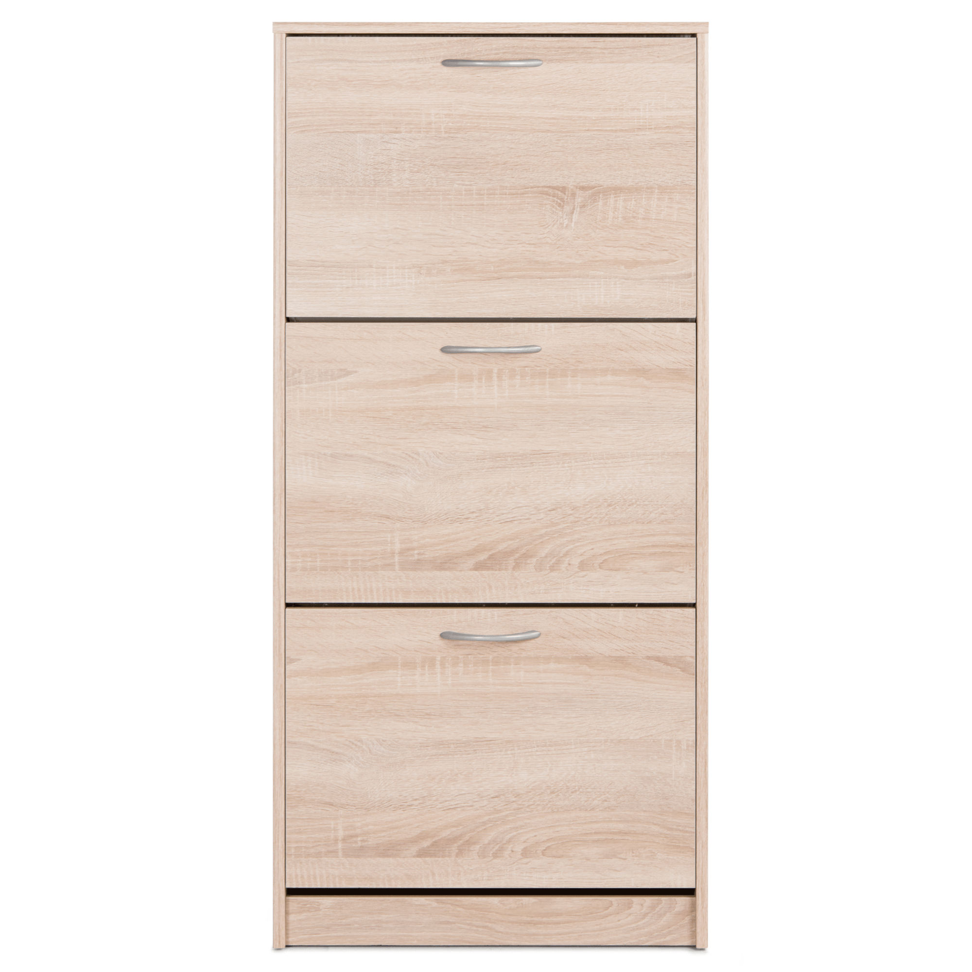 Vyrobený je z laminovaných dřevotřískových desek, které jsou snadno udržovatelné. Dostatečný úložný prostor zajištují tři samostatné sekce – ty jsou kryté výklopnými dvířky s praktickými plastovými úchyty. Každá ze sekcí nabízí prostor pro šest párů bot do velikosti 45. Botník MITZY 1 podtrhne styl předsíně a zajistí logické členění obuvi.