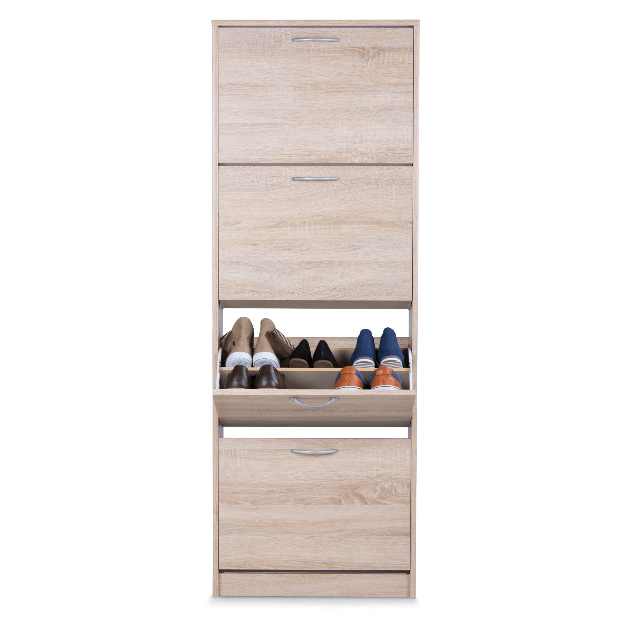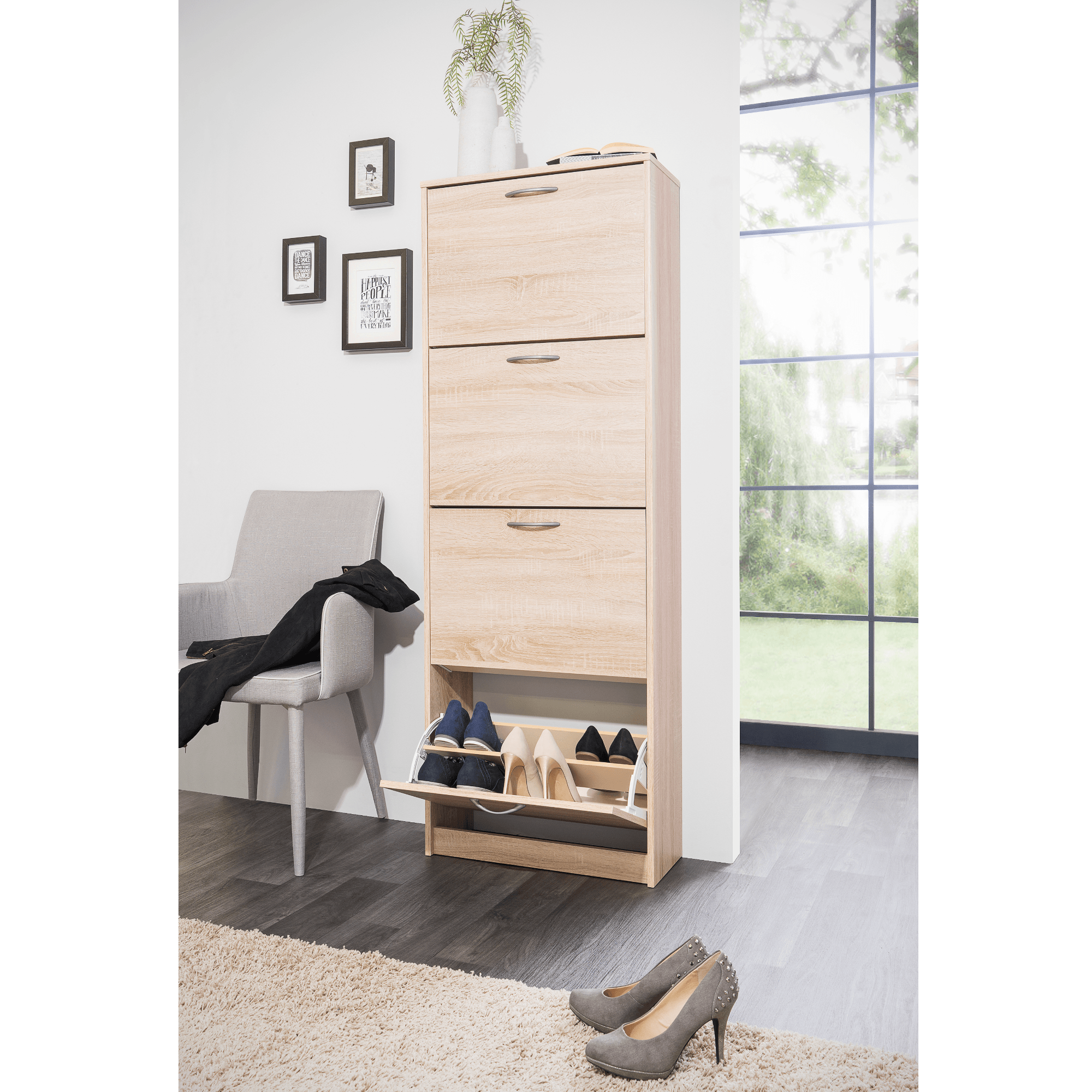 Vyrobený je z laminovaných dřevotřískových desek, které jsou snadno udržovatelné. Bohatý úložný prostor zajištují čtyři samostatné sekce – ty jsou kryté výklopnými dvířky s praktickými plastovými úchyty. Každá ze sekcí nabízí prostor pro šest párů bot do velikosti 45. Botník MITZY 2 podtrhne styl předsíně a zajistí logické členění obuvi.