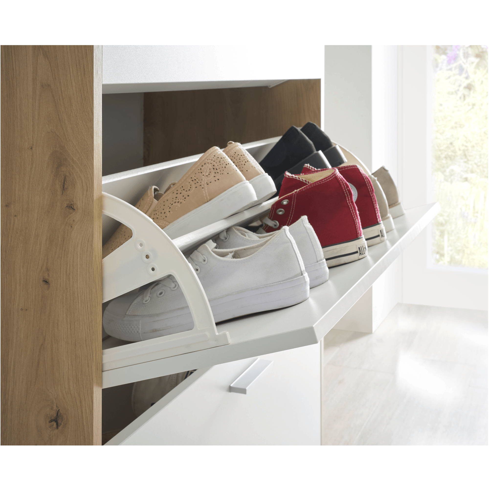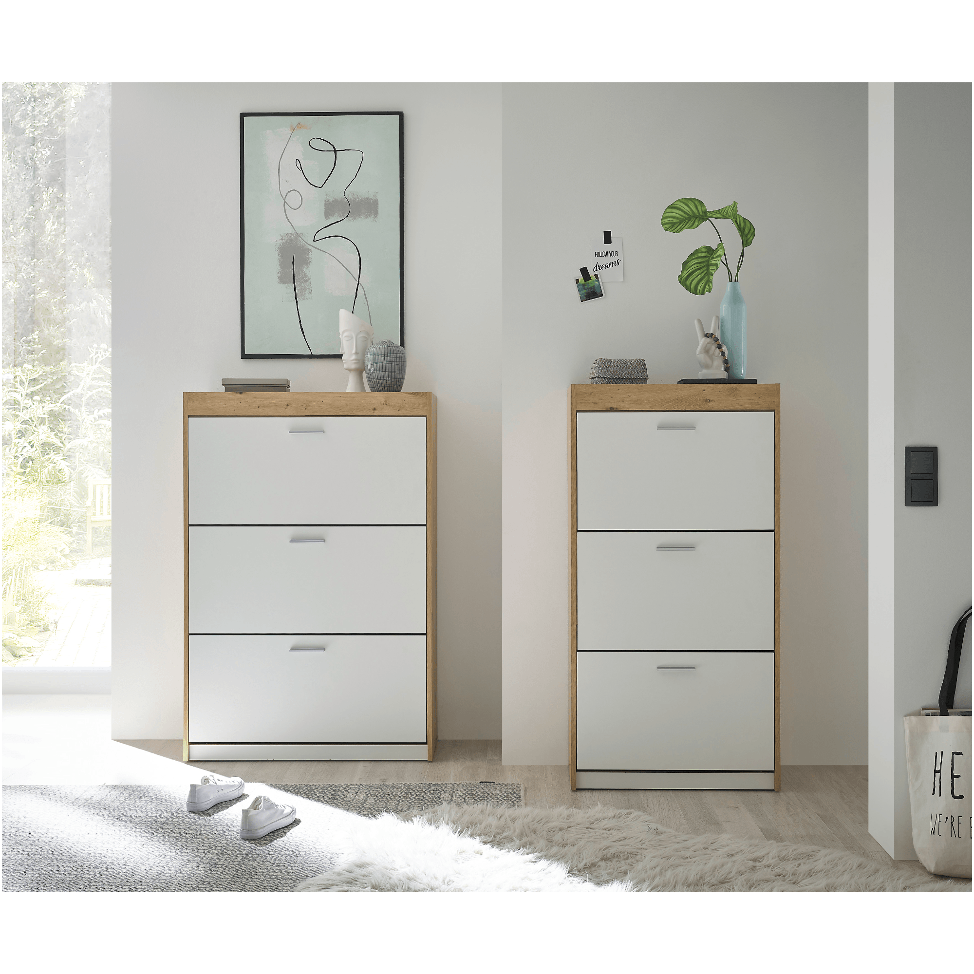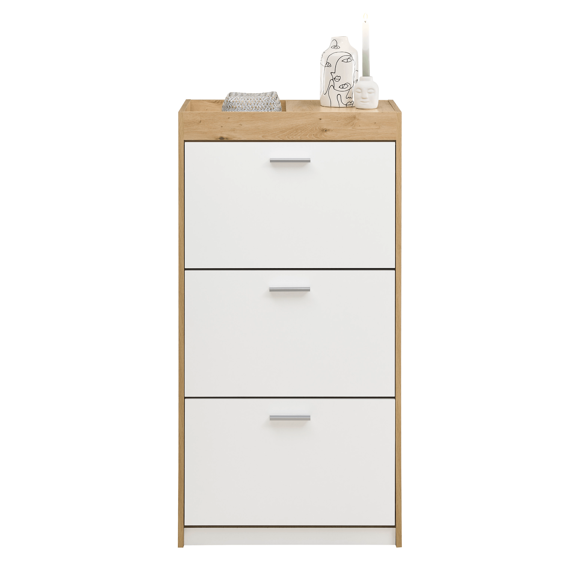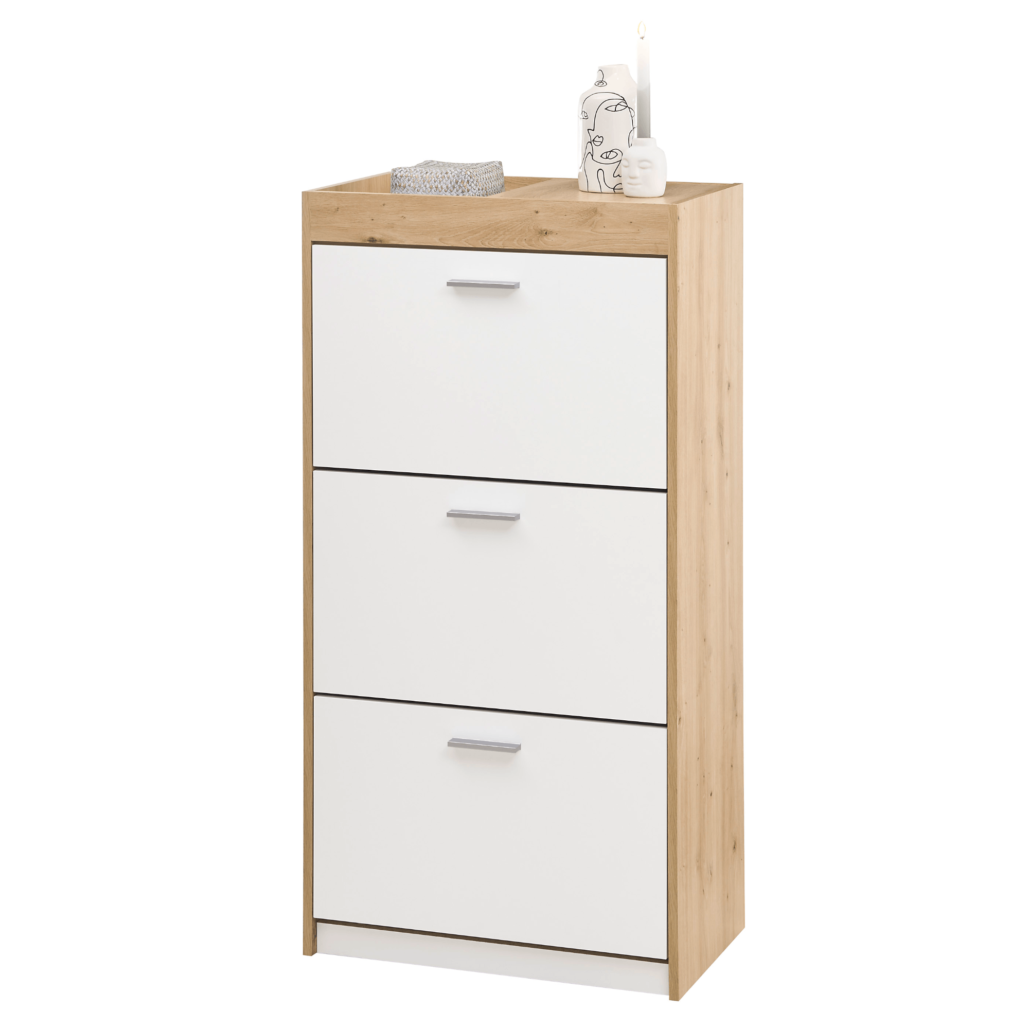 Vyrobený je z laminovaného dřevěného materiálu, který vyniká snadnou udržovatelností a dlouhou životností. Korpus je pak laděný do dekoru dubu artisan s decentní kresbou dřeva, zatímco fronty jsou v kontrastním bílém odstínu. Dostatečný úložný prostor, který kryjí výklopná dvířka s praktickými úchyty, zajištuje trojice polic – botník tak pojme až osmnáct párů bot.