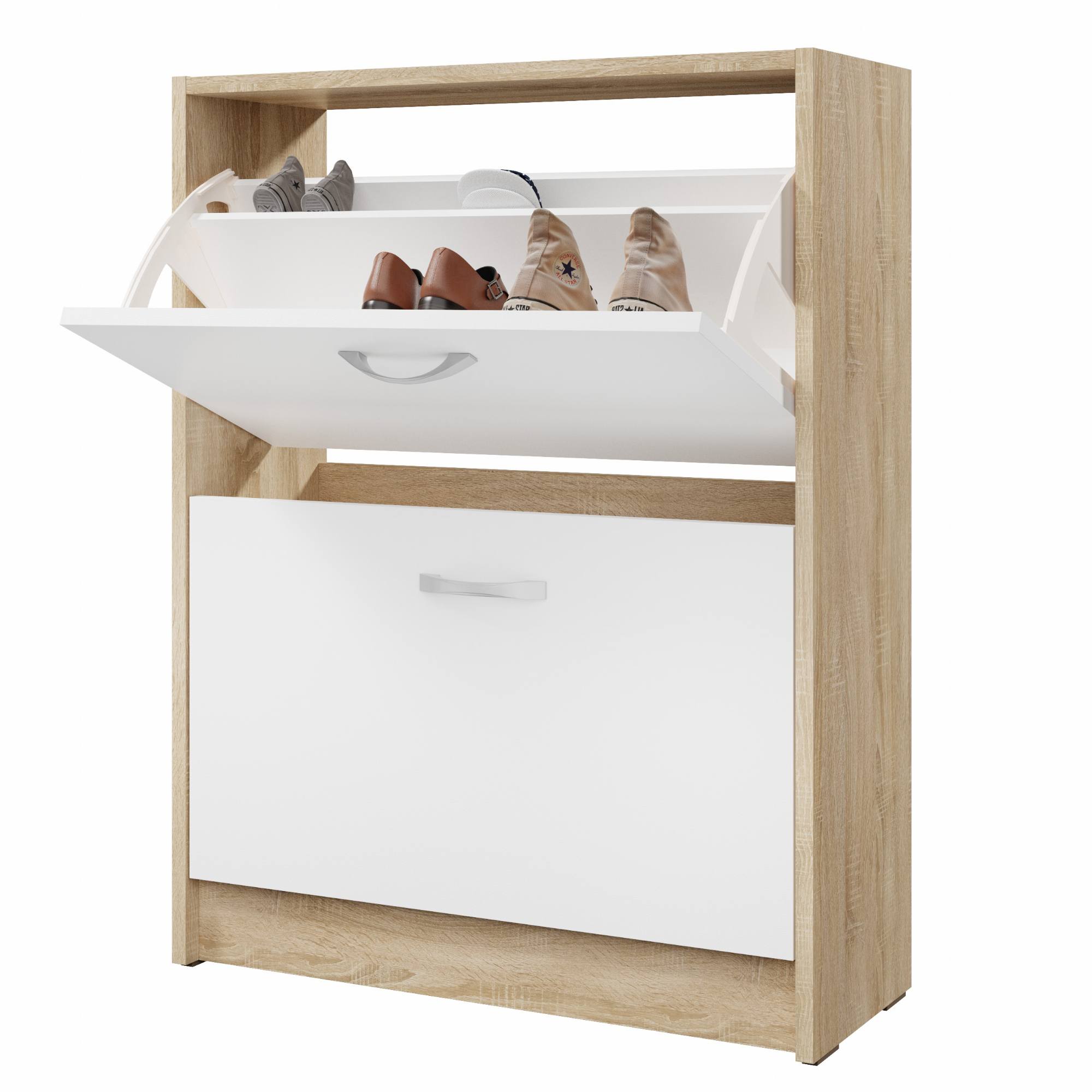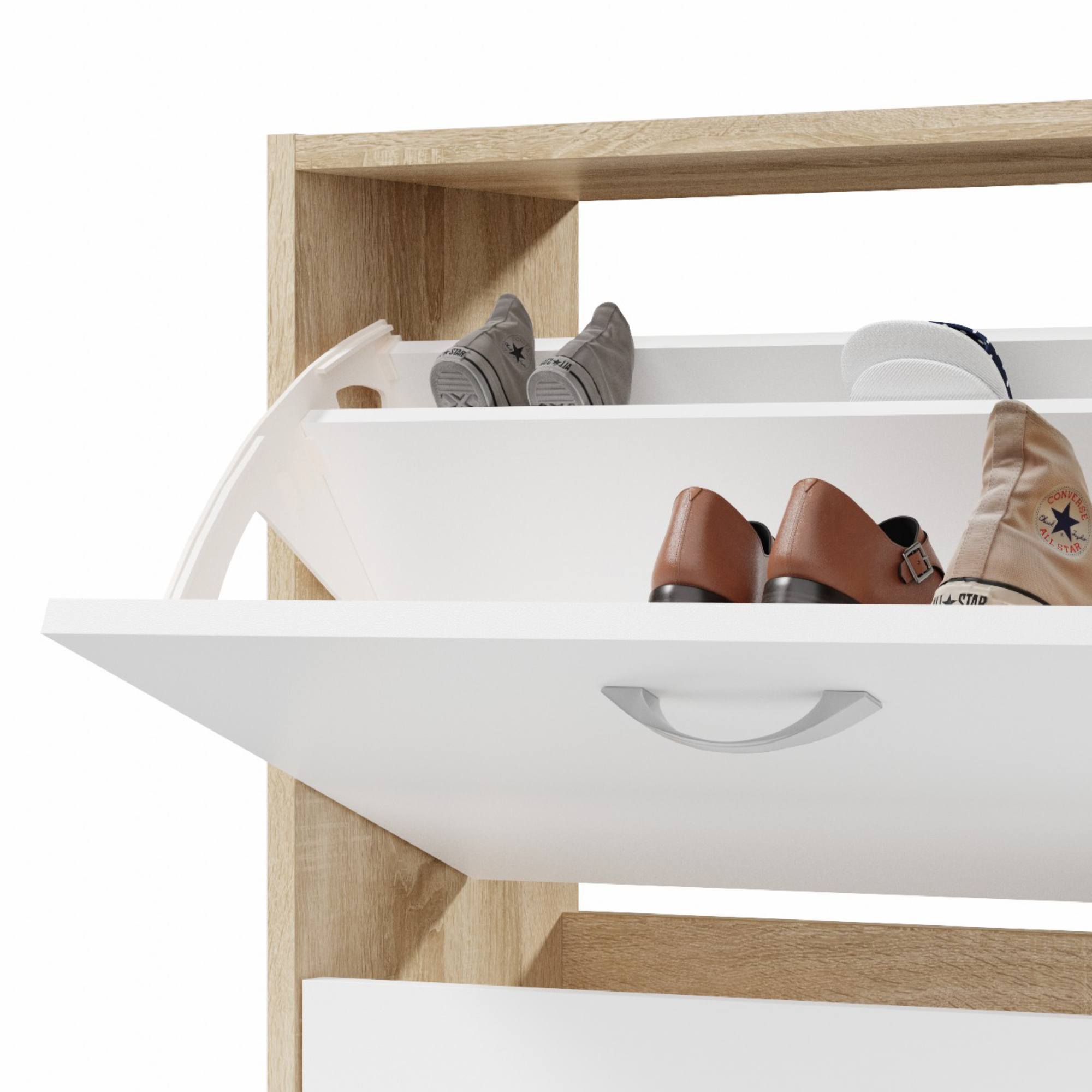 Za výklopnými dvířky najdete plastové boxy, do kterých můžete uskladnit boty, které by se jen tak povalovaly po zemi. Provedení nenáročné na prostor, které se vejde i do sebemenšího koutku a vy budete mít vaše boty stále po ruce.