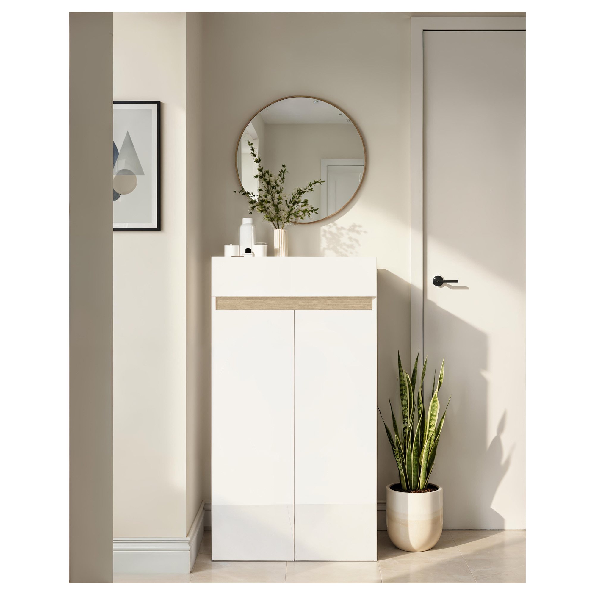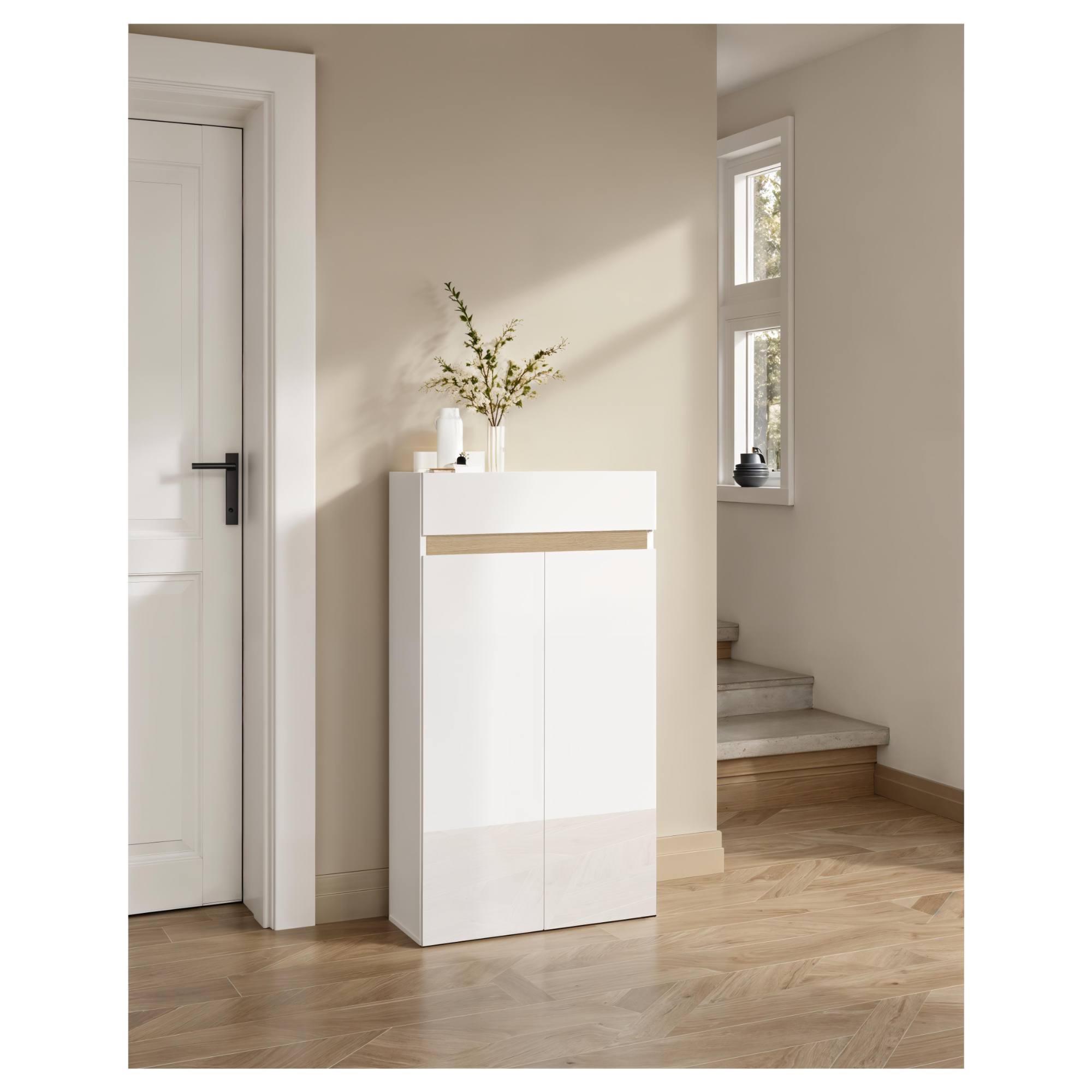 Botník RAINBOW 1, který vás zaujme stylovým bezúchytovým provedením, přední stranou vyhotovenou ve vysokém lesku a elegancí a čistými liniemi typickými pro skandinávský design, najde využití v každé předsíni.