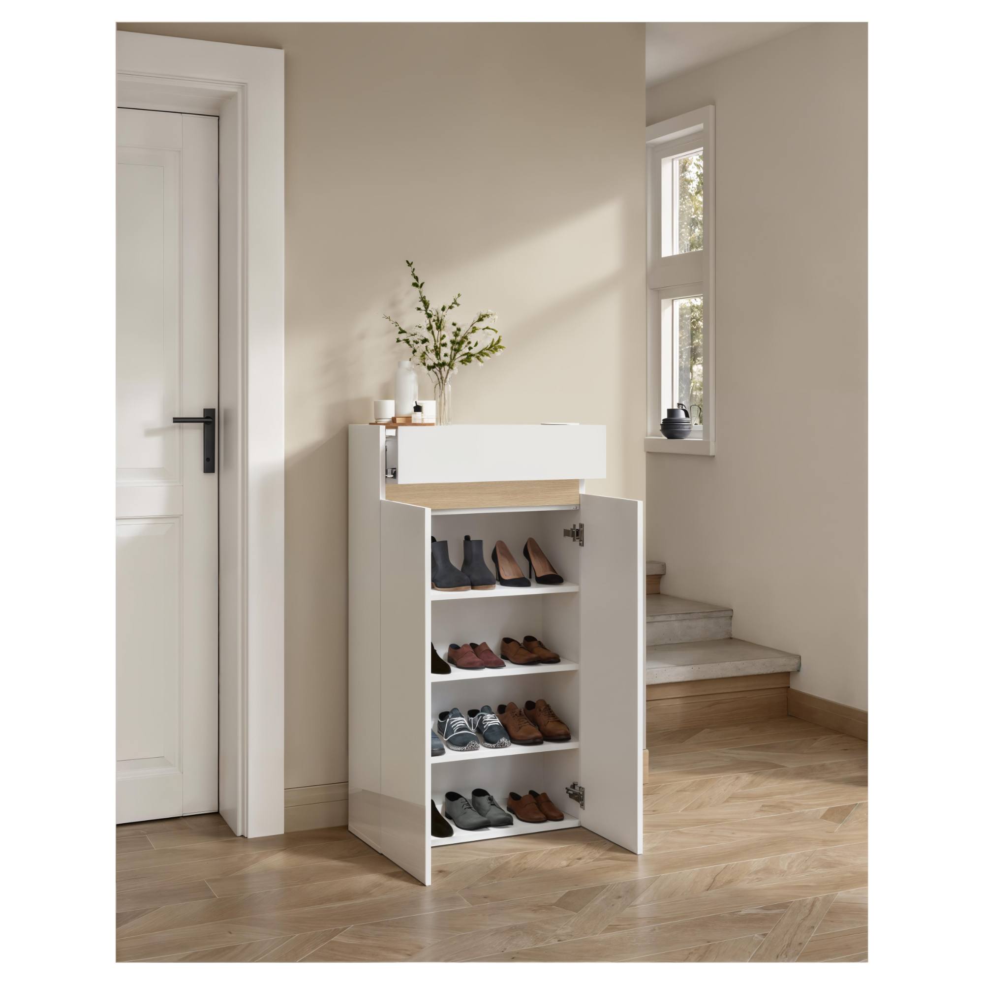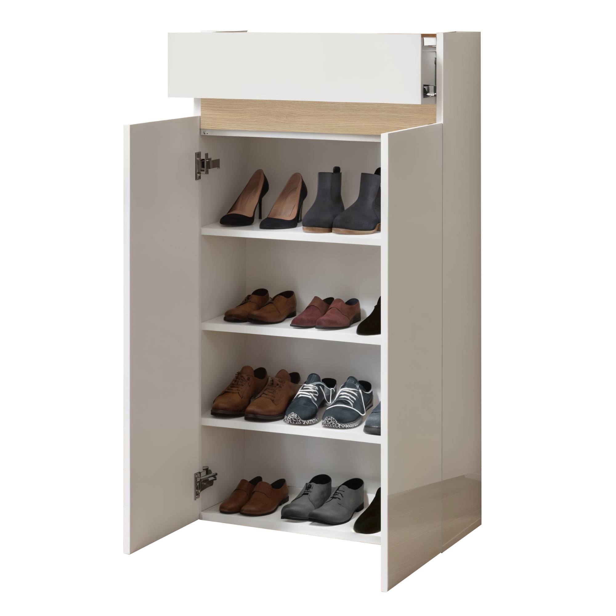 Botník nabízí dostatek úložného prostoru. Za jeho dvířky se nachází 3 vložené police, na které si můžete přehledně uložit vaše oblíbené boty. Na uložení různých drobností je jako stvořena 1 zásuvka.