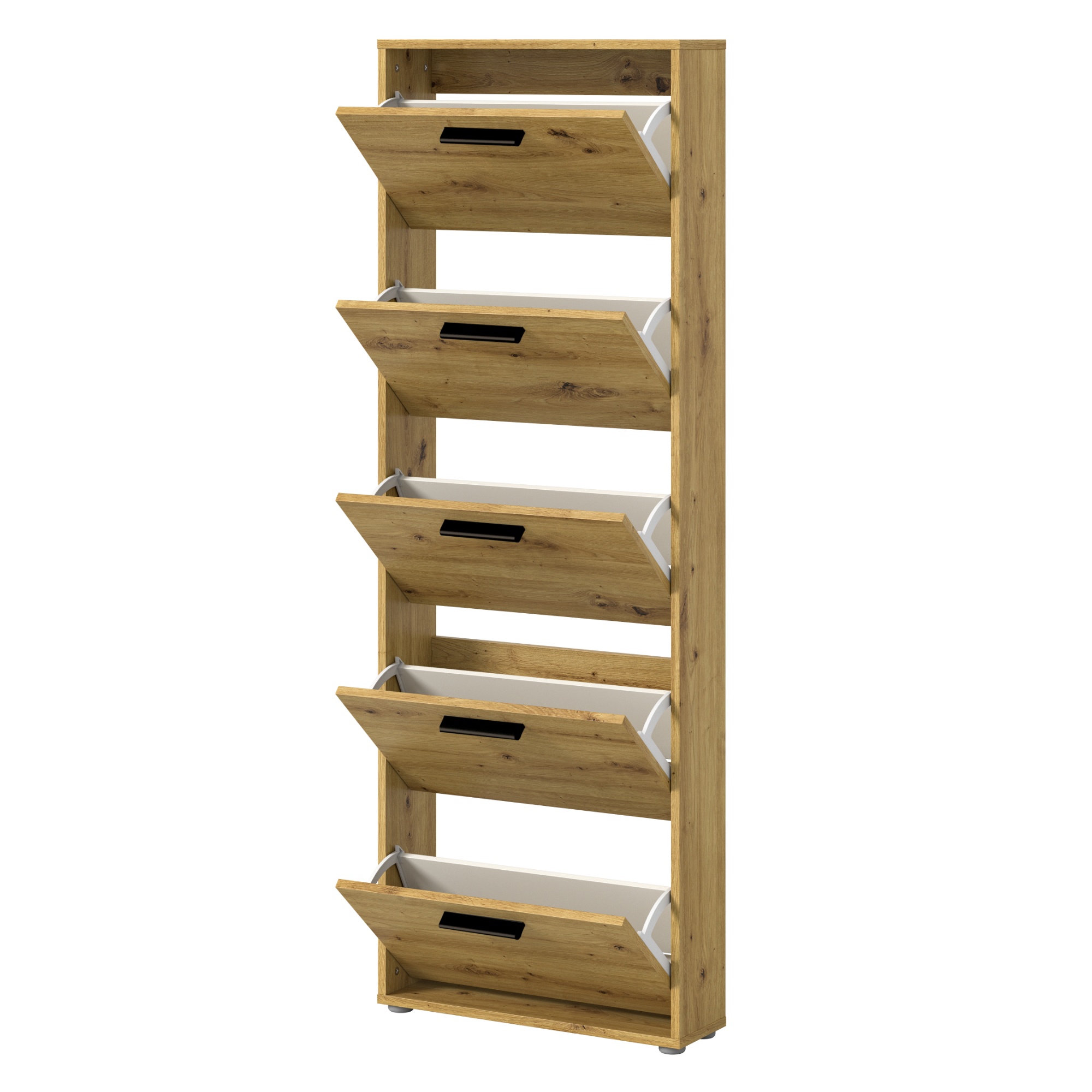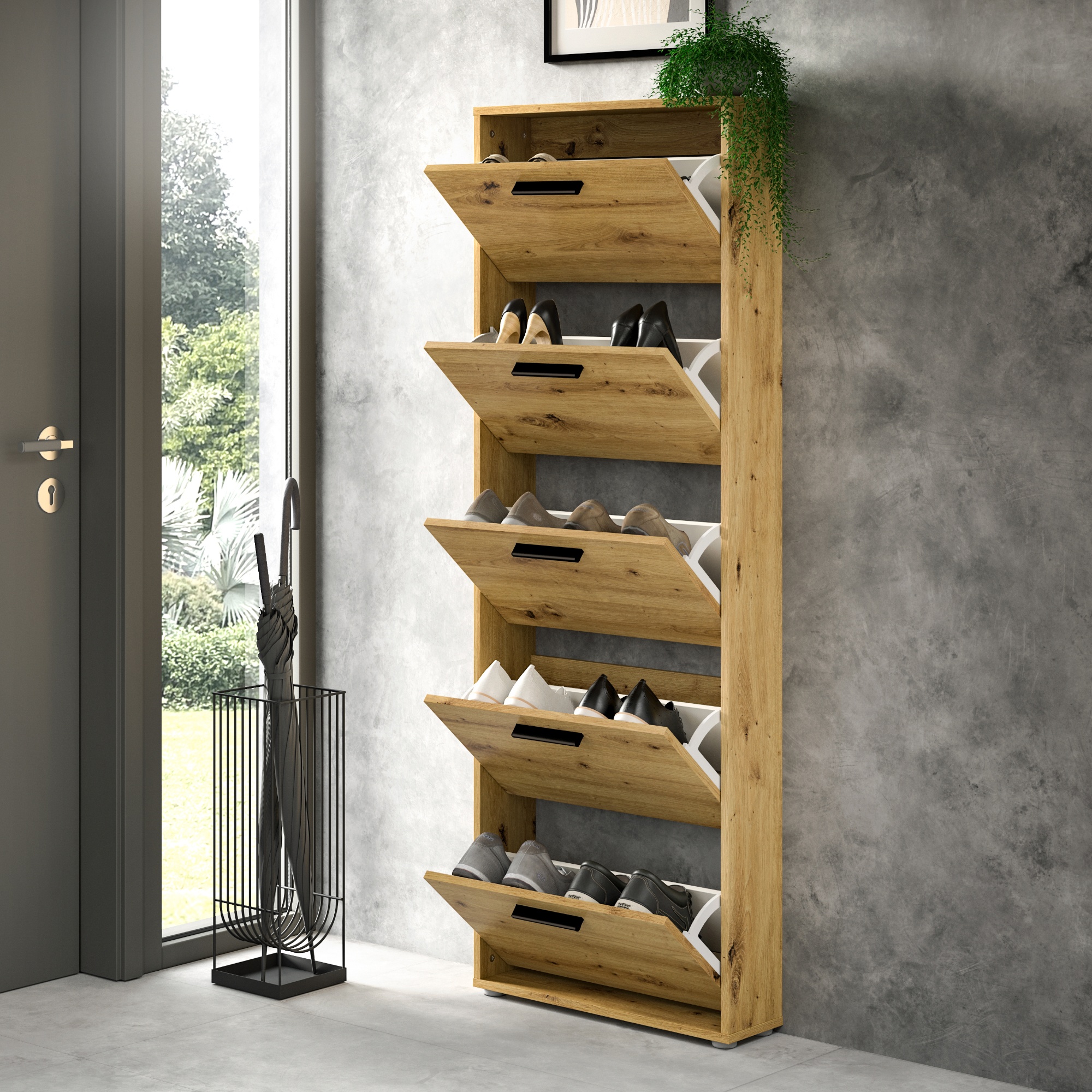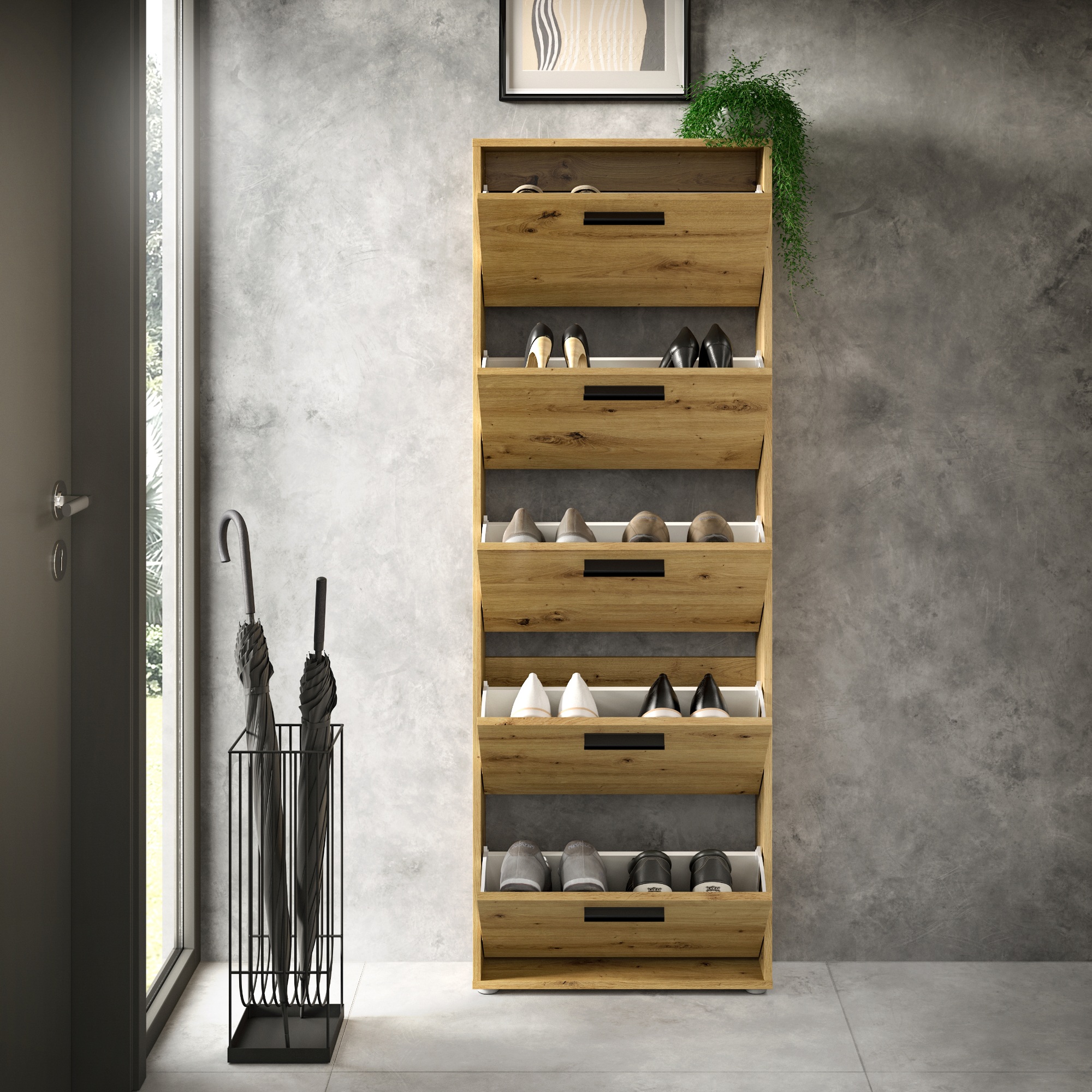 Za výklopnými dvířky botníku se nachází dostatek úložného prostoru pro vaše oblíbené boty. Aby se s nimi dobře manipulovalo, jsou vybavena úchyty.