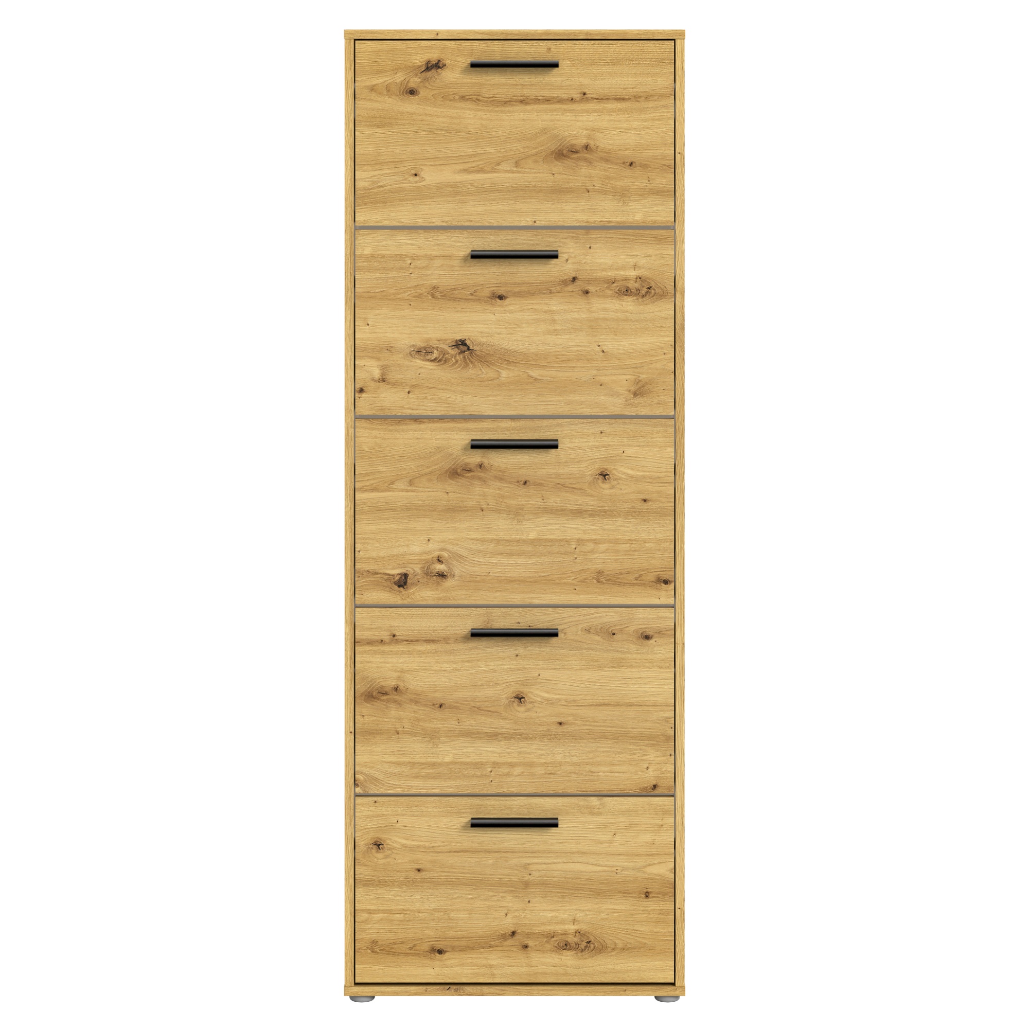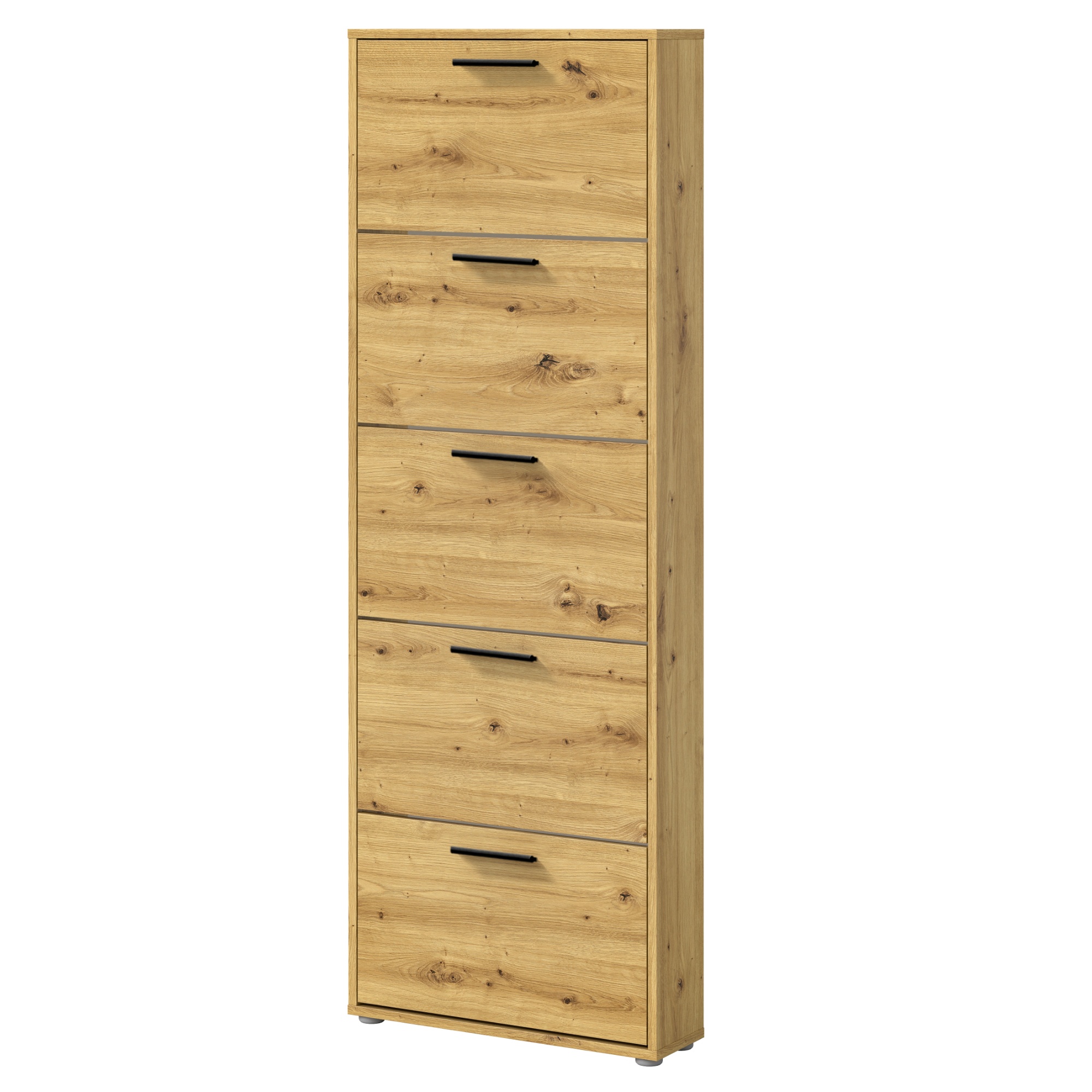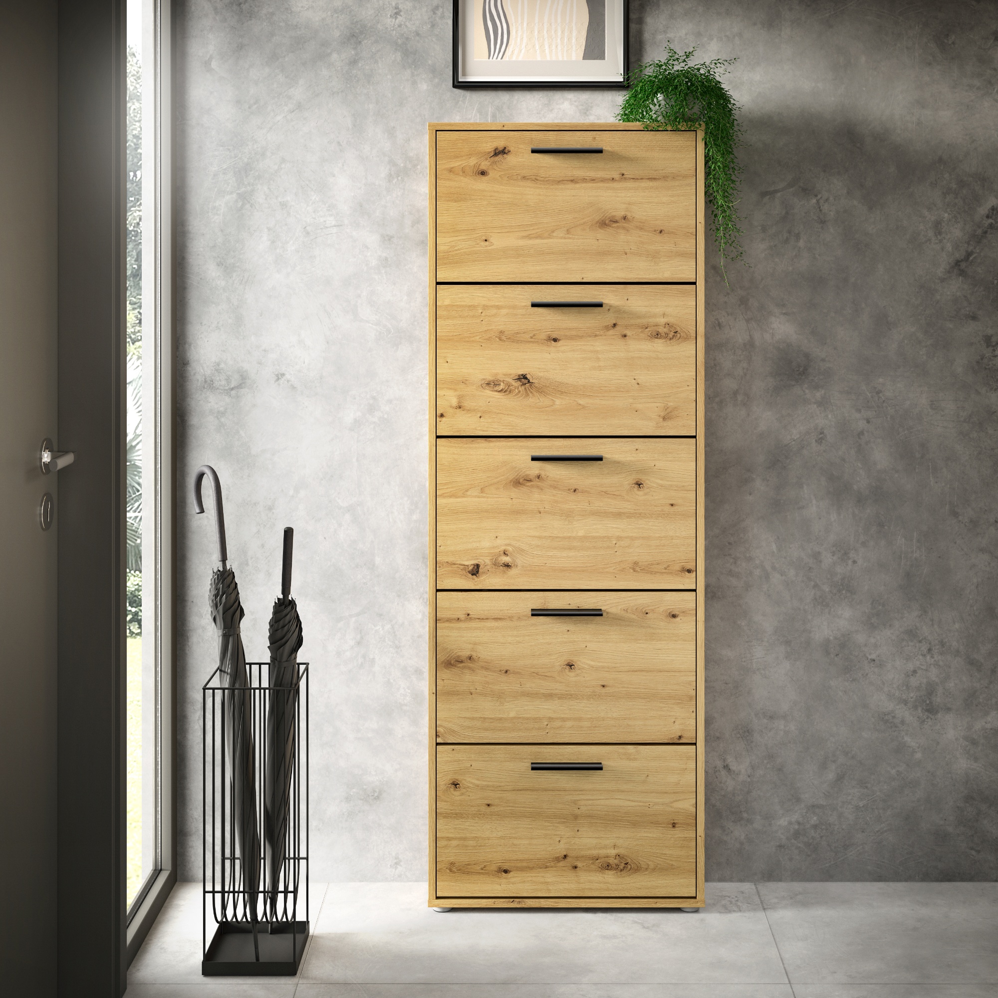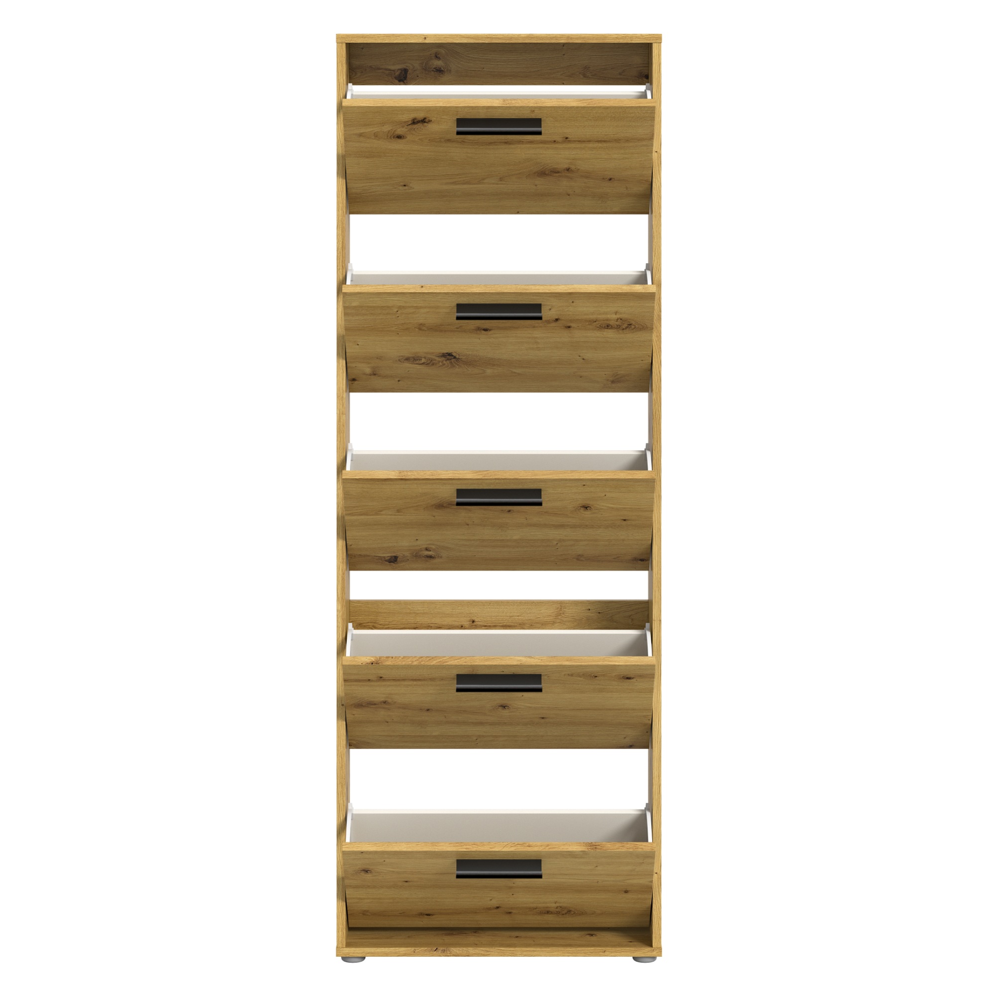 Za výklopnými dvířky botníku se nachází dostatek úložného prostoru pro vaše oblíbené boty. Aby se s nimi dobře manipulovalo, jsou vybavena úchyty.