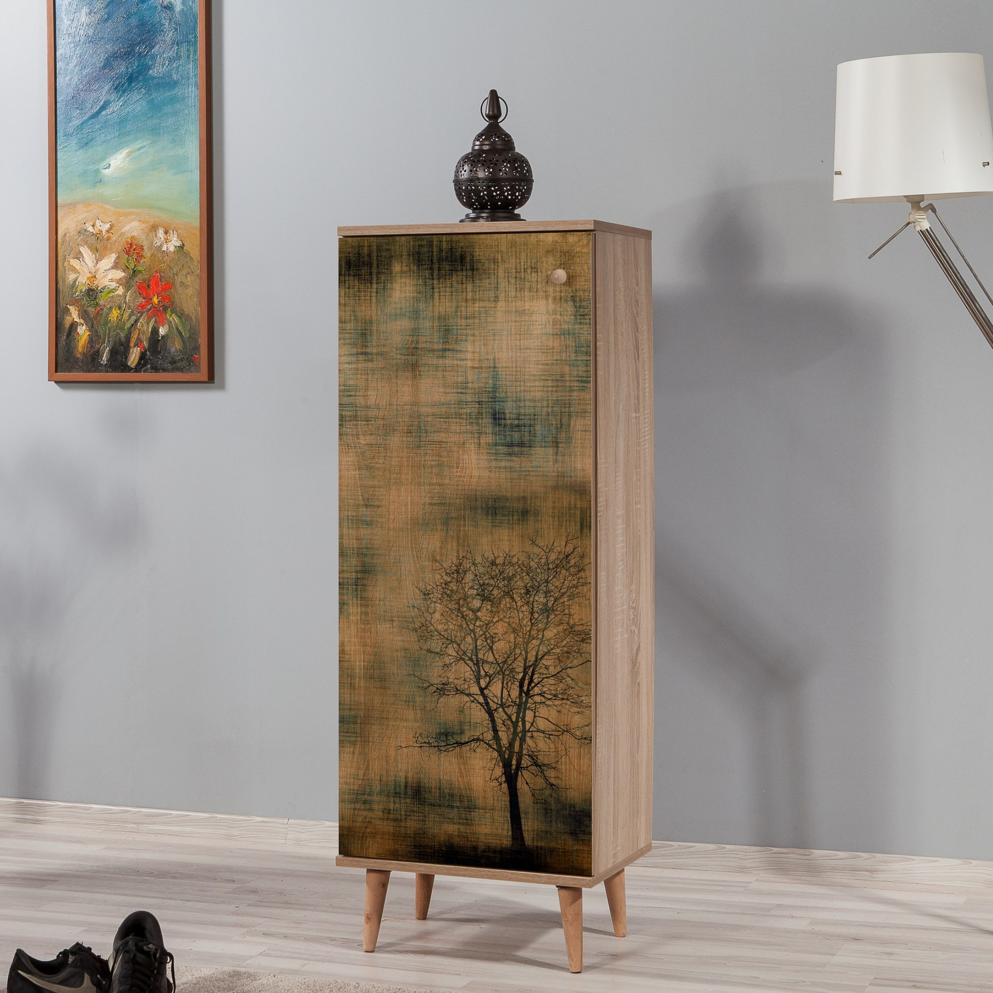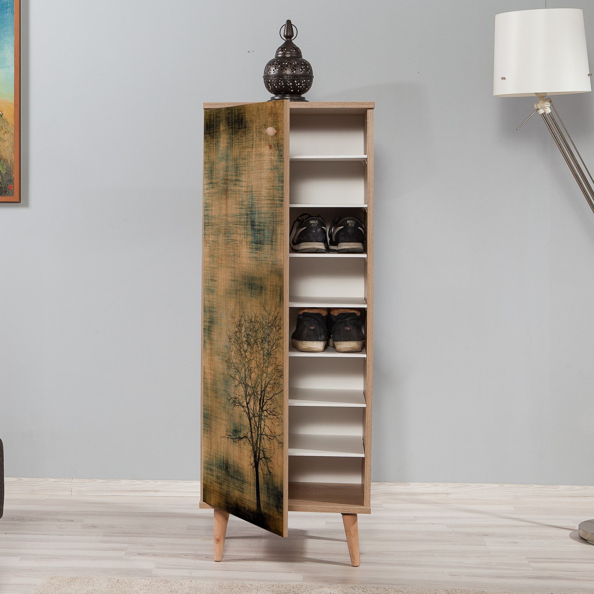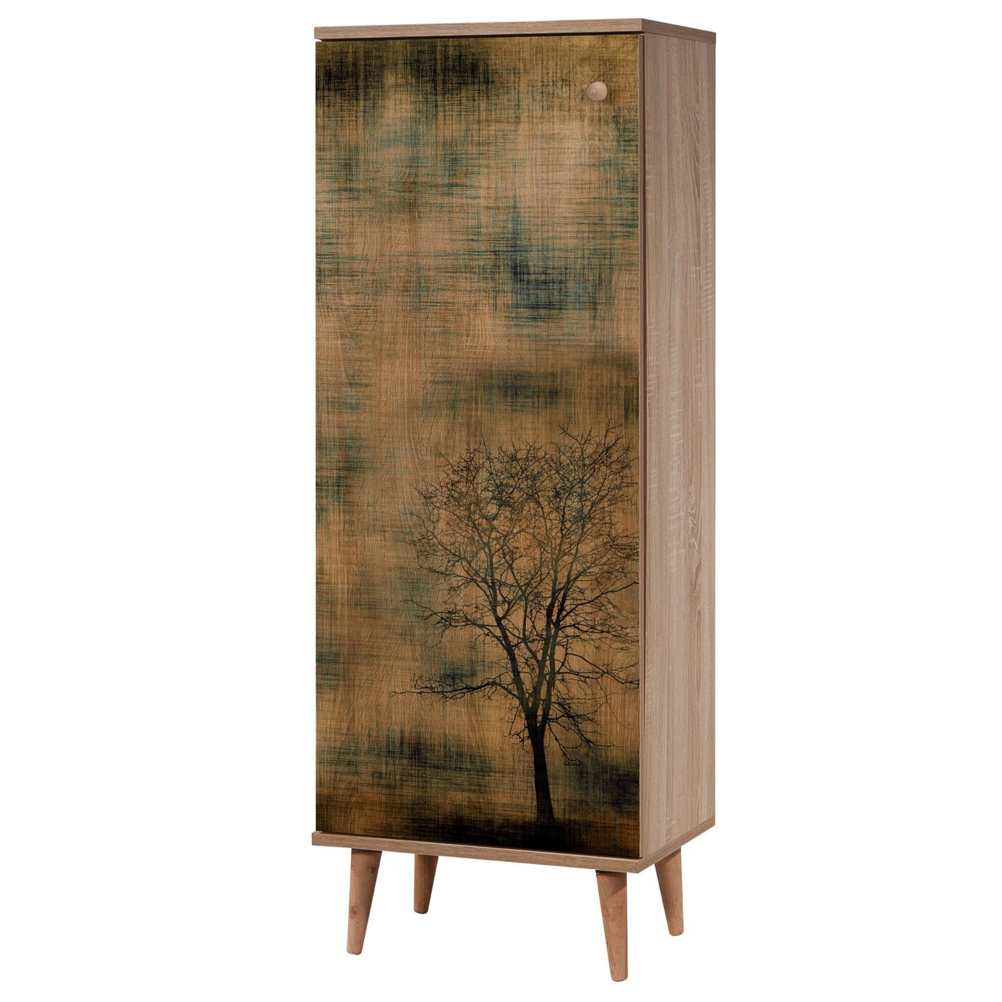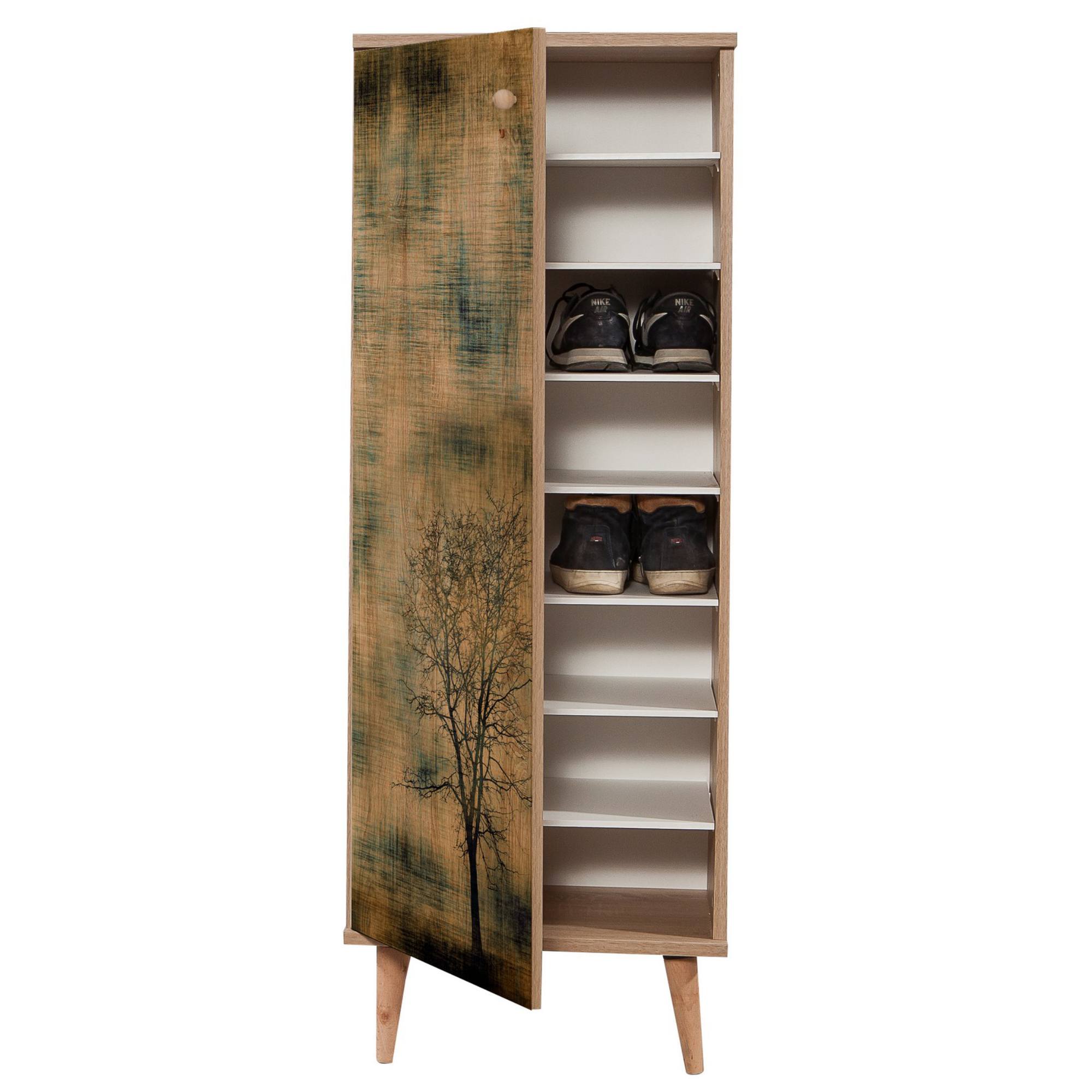 Vyrobena je z laminovaného dřevěného materiálu, pro který je typická snadná udržovatelnost i dlouhá životnost. Laděna je do dekoru dubu sonoma s výraznou kresbou dřeva, front pak vyobrazuje motiv stromu. Bohatý úložný prostor – krytý dvířky s decentním úchytem – pak zajišťuje hned sedm polic, díky čemuž do botníku snadno uložíte až 16 párů bot. Maximální stabilitu obstarává čtveřice konických nožek.