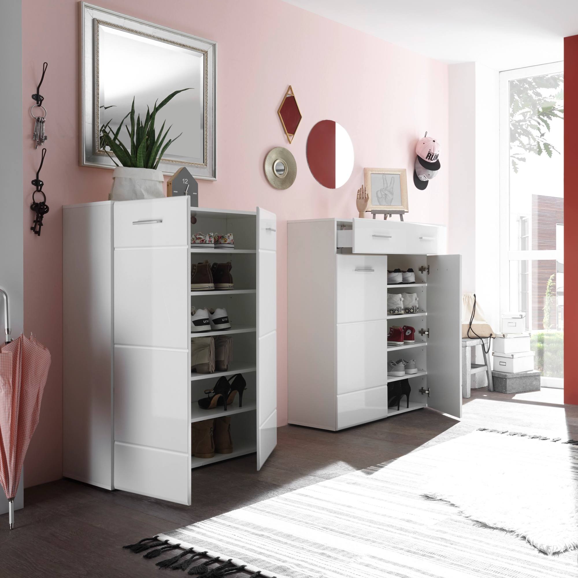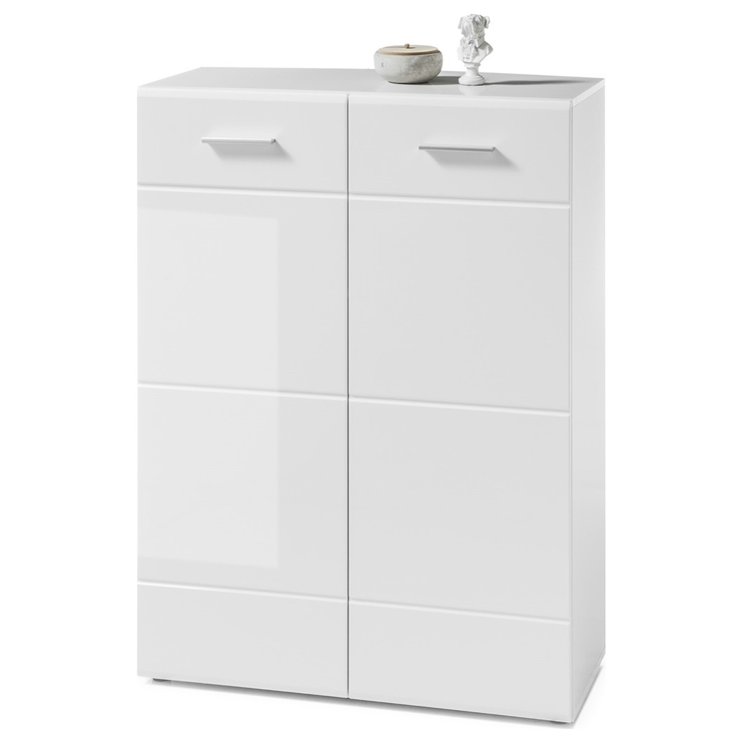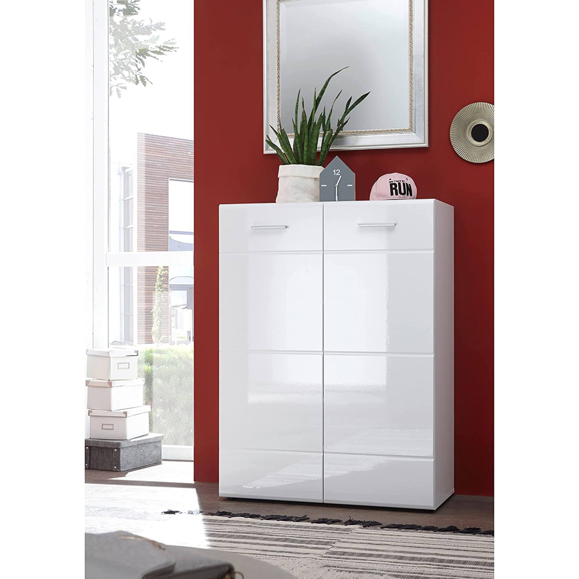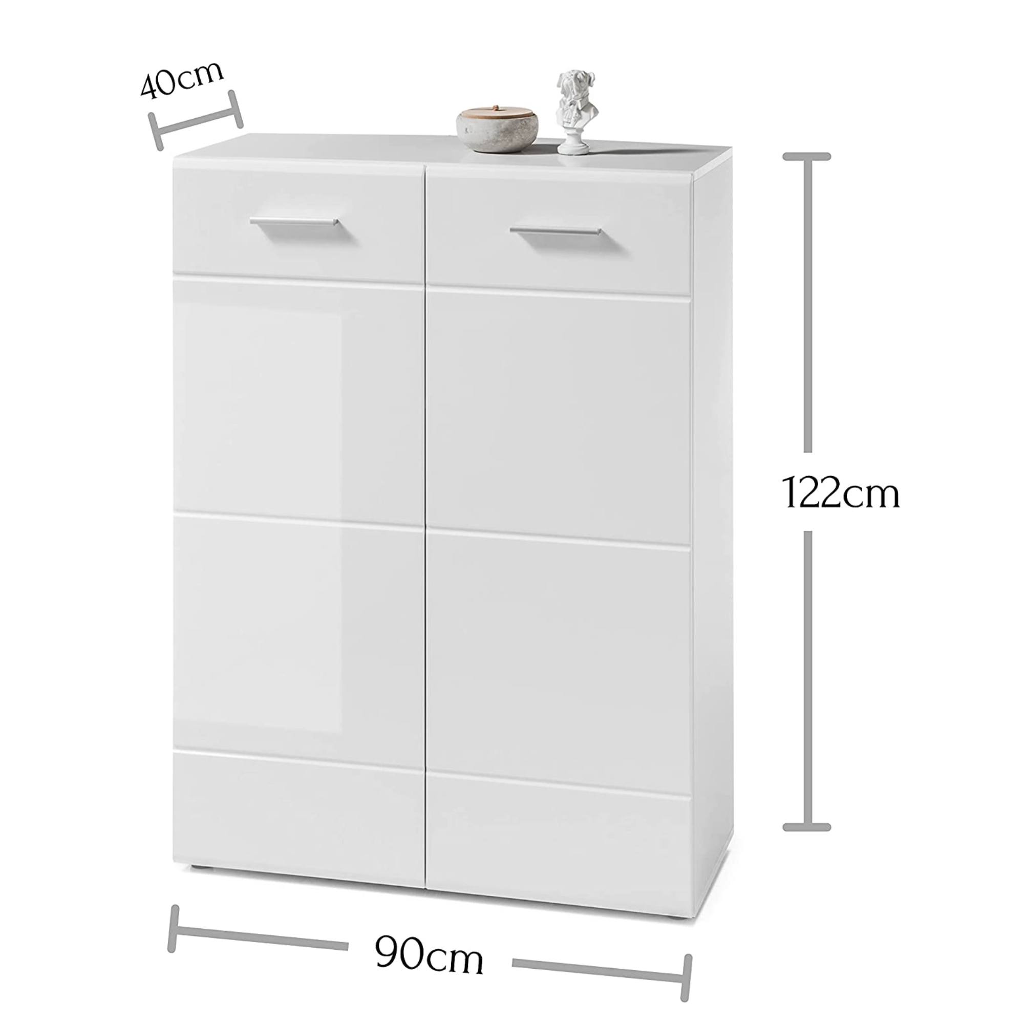 Kombinace frézované přední plochy ve vysokém lesku a decentních úchytů v barvě kovu působí jemně a opticky rozjasní i menší předsíň či vstupní prostor. Za dvířky najdete krytý odkládací prostor pro více párů a vejde se i do menšího vstupního prostoru. Police uvnitř skříňky na boty jsou variabilní, takže zde uložíte i boty s vysokými podpatky. Pro lepší stabilitu doporučujeme komodu připevnit ke zdi. Komoda je osazena příchytkou pro upevnění ke zdi.