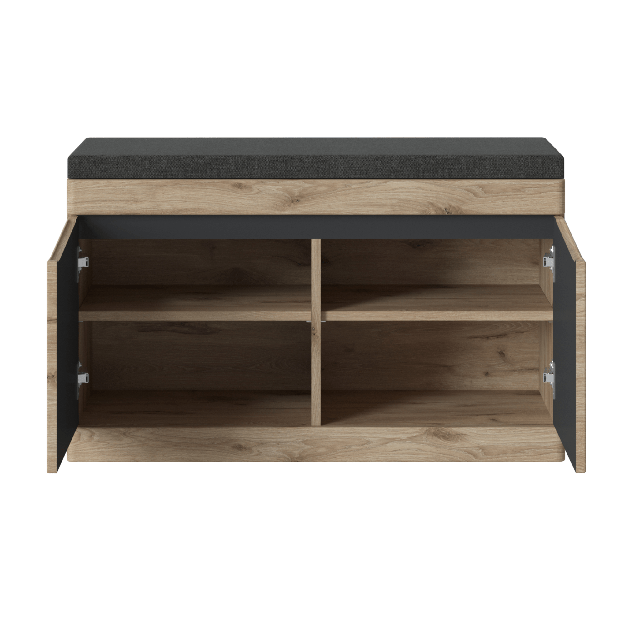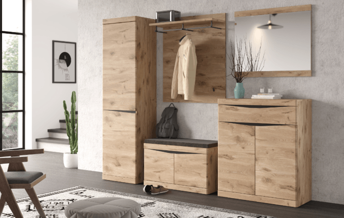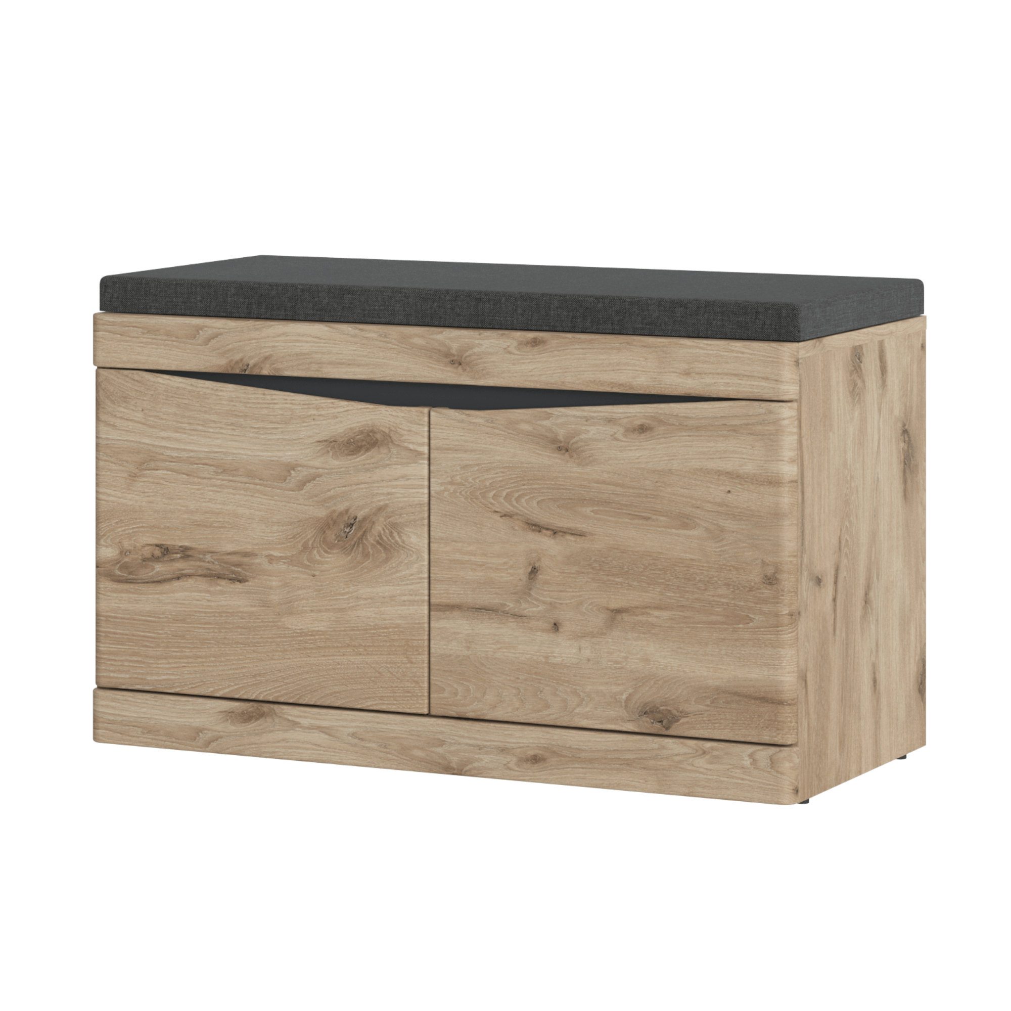 Korpus je vyrobený z laminovaného dřevěného materiálu, který se vyznačuje snadnou udržovatelností i dlouhou životností. Fronty jsou z dřevovláknitého materiálu MDF. Okraje jsou pak hraněny ABS hranami, které eliminují riziko mechanického poškození. Lavice disponuje polstrovaným sedákem čalouněným příjemnou hladkou tkaninou. Dvojice dvířek skrývá úložný prostor na boty se dvěma policemi. Manipulaci s nábytkem navíc usnadní tiché dovírání softclose a dekorativní frézovaní, které supluje úchyty.