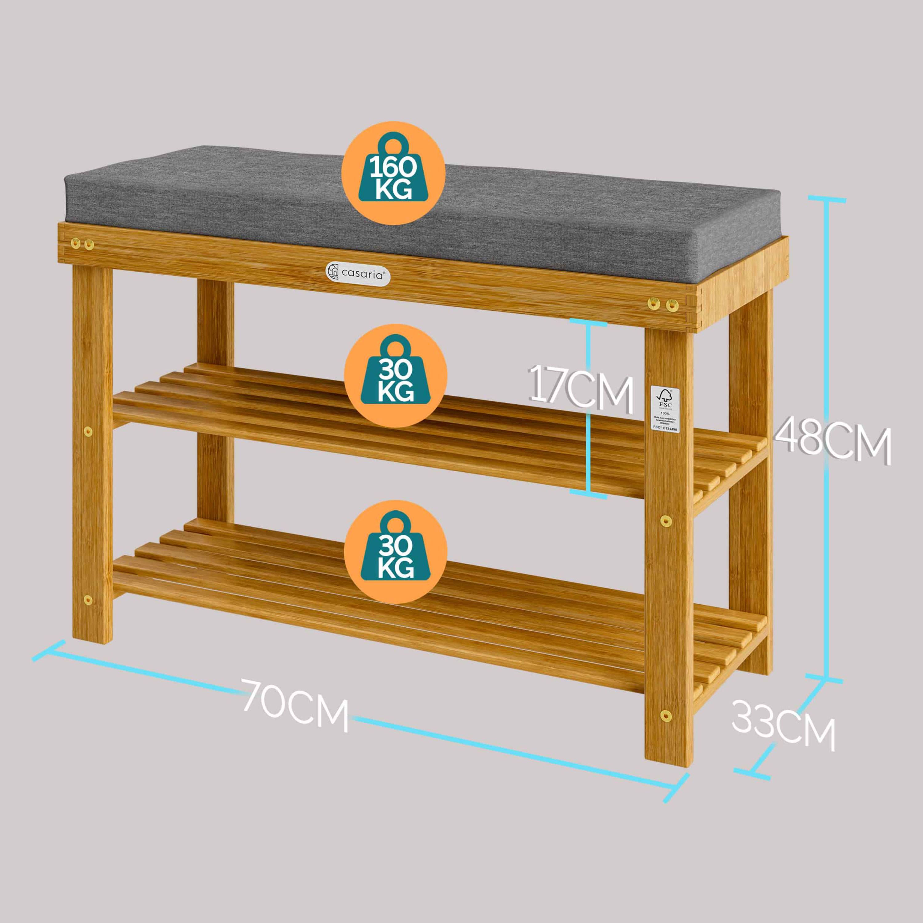 Lavice je vyrobena z kvalitního akáciového dřeva, které vyniká pevností, dlouhou životností a přirozenou kresbou. Robustní konstrukce zajišťuje vysokou odolnost a stabilitu, takže se lavice stane spolehlivou součástí domácnosti pro každodenní život. Součástí konstrukce jsou 2 prostorné police, které nabízí dostatek místa pro uložení obuvi, boxů nebo dalších doplňků. Při každodenním používání oceníte vysoký komfort během přezouvání díky odnímatelnému sedáku o tloušťce 5 cm se snadnou údržbou.
