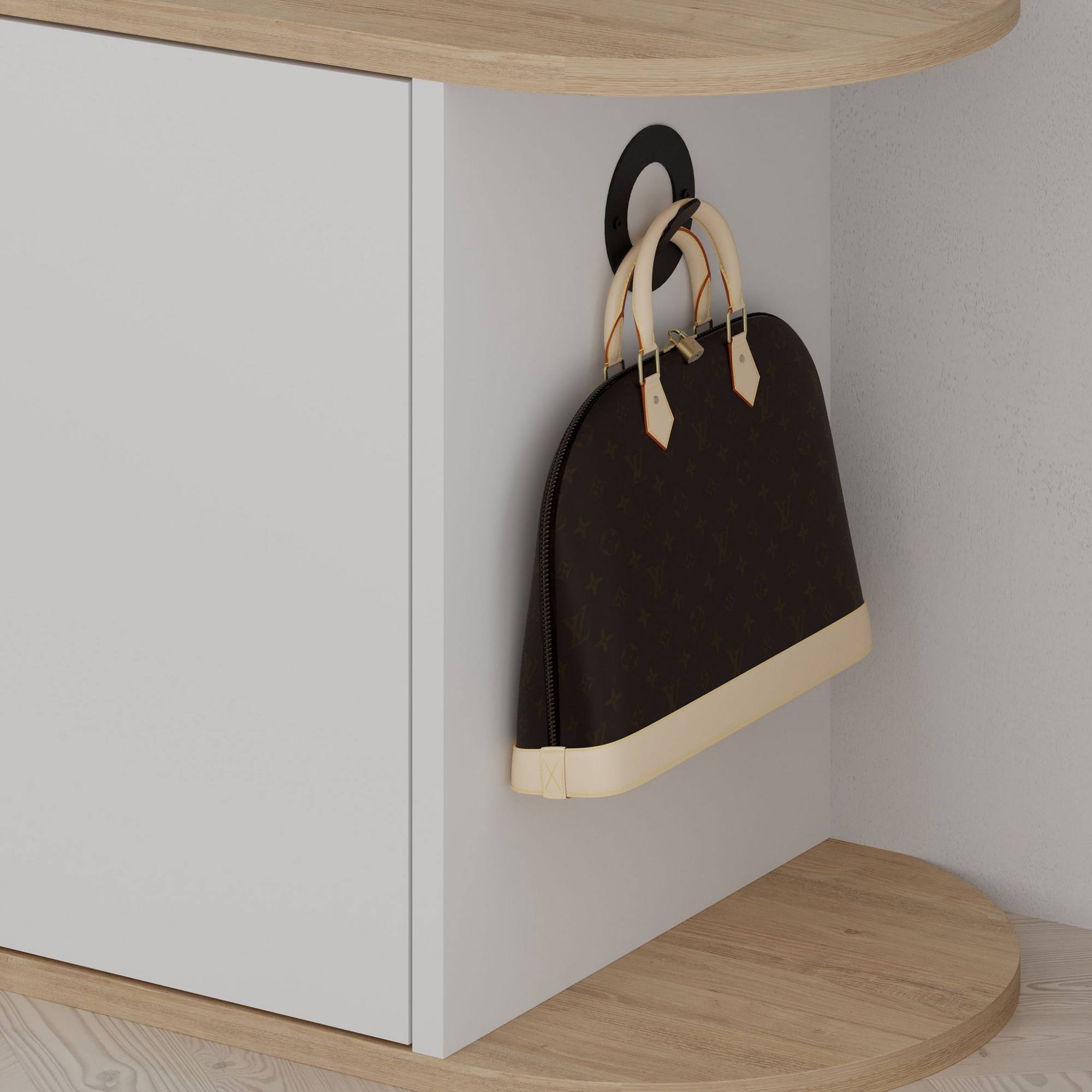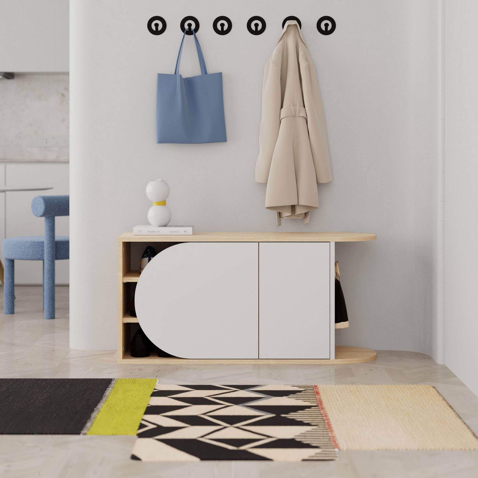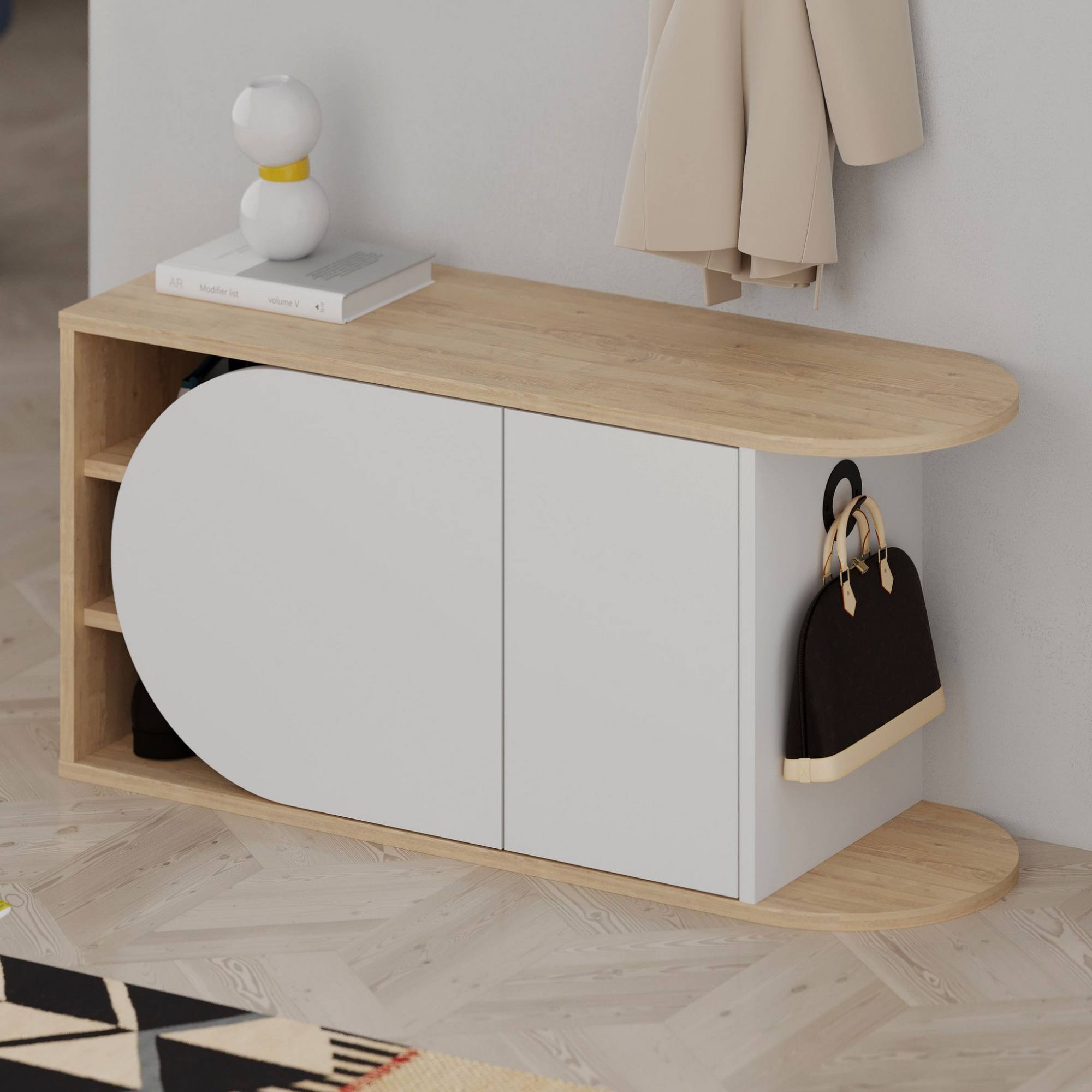 Kromě 3 vložených polic ukrytých za otočnými dvířky disponuje tato lavice i háčkem, na který si můžete pověsit například kabelku. Na výrobu lavice byla využita laminovaná dřevotřísková deska, pro kterou je charakteristická nenáročná udržovatelnost.