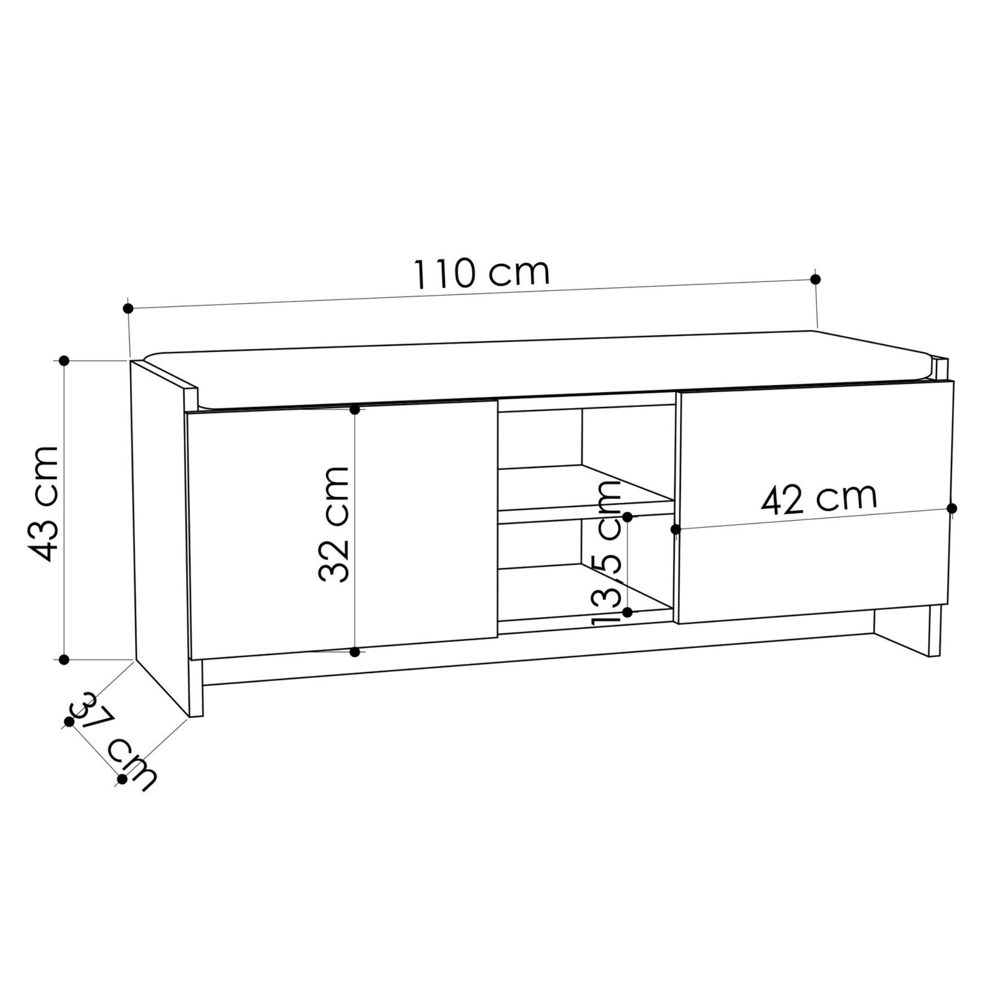 Vyrobena je z laminovaného dřevěného materiálu, který se snadno udržuje. Vybavena je polstrovaným sedákem, který nabízí prostor pro pohodlné sezení během obouvání nebo odložení tašek. Obuv a další nezbytnosti můžete uložit do celkem 3 vložených polic z nichž 2 z nich se nachází za uzavíratelnými, otočnými dveřmi.