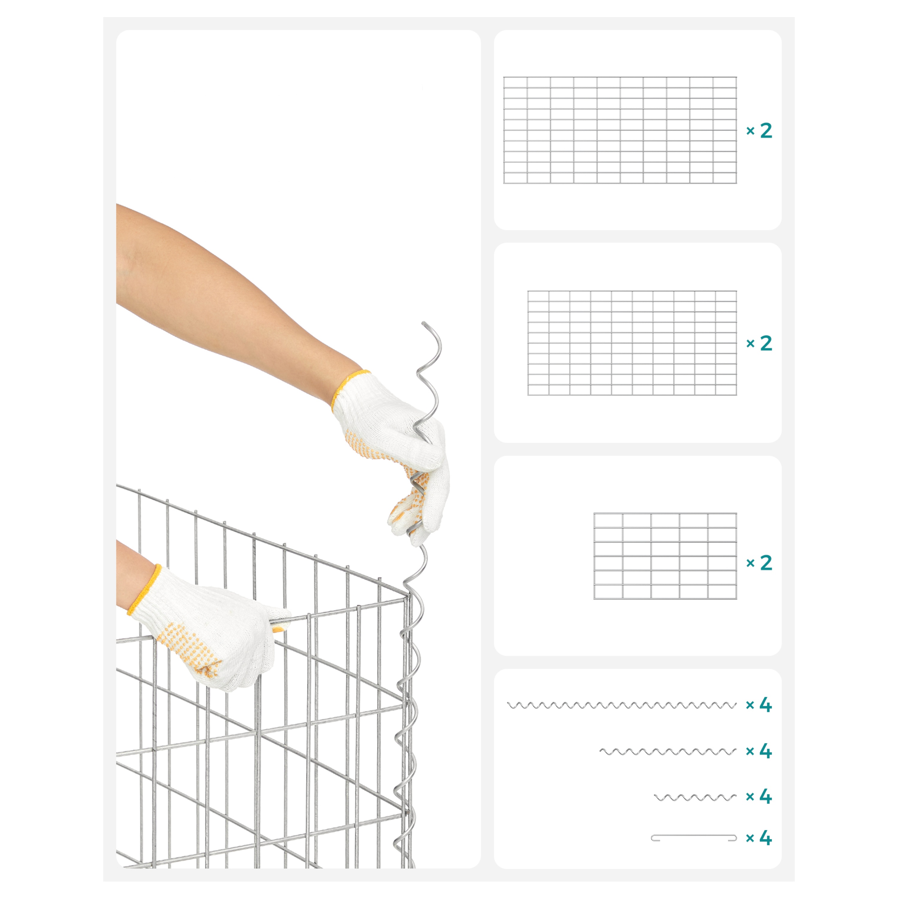 Konstrukce koše je tvořena dráty z pozinkované oceli o průměru 4 mm. Ty zajišťují vysokou pevnost a lepší odolnost proti korozi. Je doplněn distančními háky, které zabraňují deformaci koše a skvěle udržují jeho tvar i při plném zatížení. Velikost otvorů koše je 10x5 cm, je tedy vhodný pro kameny o průměru 6 až 10 cm. Koš lze vyplnit různými materiály jako kameny, dřevěné bloky či cihly.