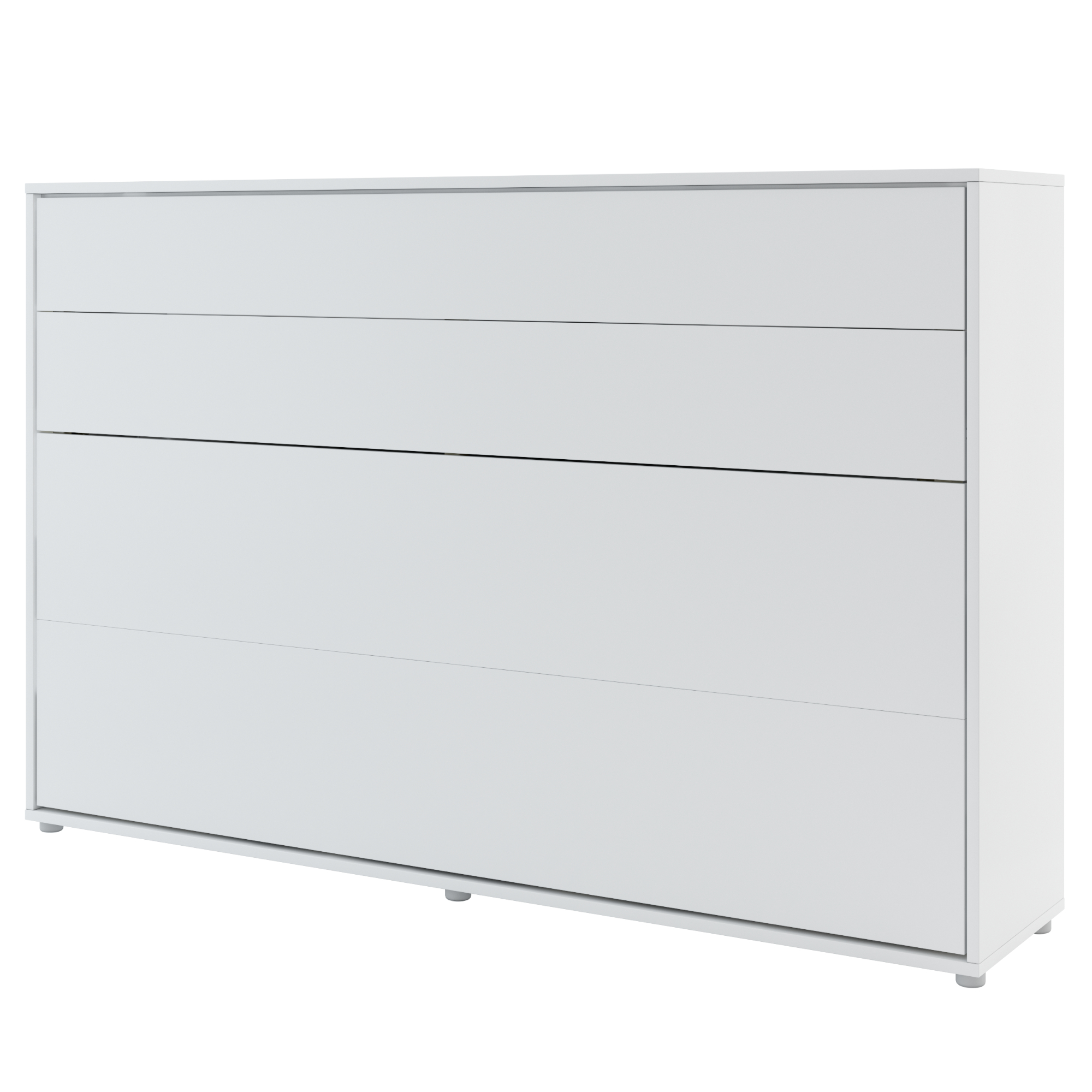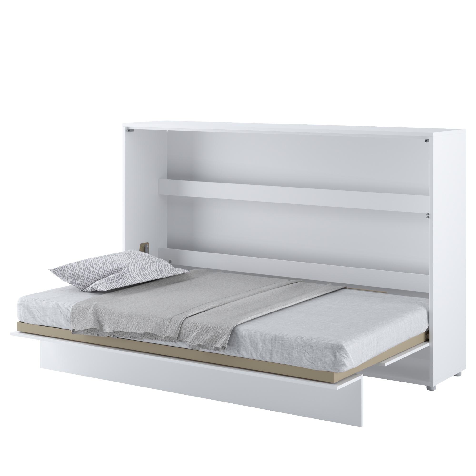 Funkční propojení postele s úložnými prostory v jednoduchém designu lehce zkombinujete s jakýmkoliv interiérem. Výklopná postel v horizontální poloze je včetně roštů. Matraci si určitě vyberete z naší široké nabídky matrací, aby bylo vaše lůžko kompletní. Matraci vybírejte do výšky 21 cm tak, aby vám šla postel bez problémů složit. Součástí balení jsou úchyty na zeď a bezpečnostní mechanismus s pneumatickými zvedáky proti samovolnému otevření a převržení postele. Sklápěcí postel nelze připevnit ke stěně ze sádrokartonu. Správné připevnění postele ke stěně je klíčové, přistupujte tedy k montáži zodpovědně dle montážního plánu. Postel je navíc vybavena praktickými popruhy do kterých snadno zapnete lůžkoviny a peřina i polštář zmizí společně s postelí. Nepotřebujete tak žádný další úložný prostor.