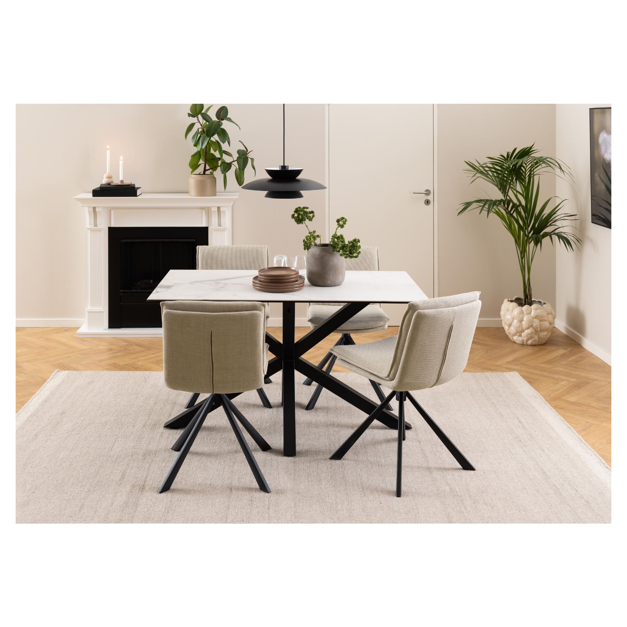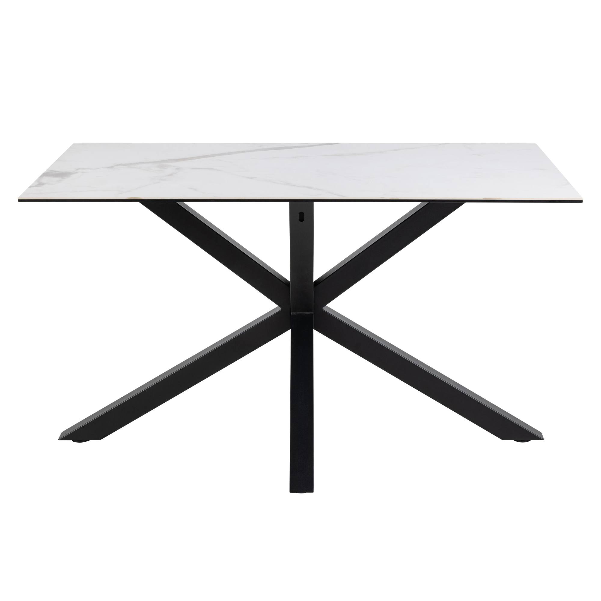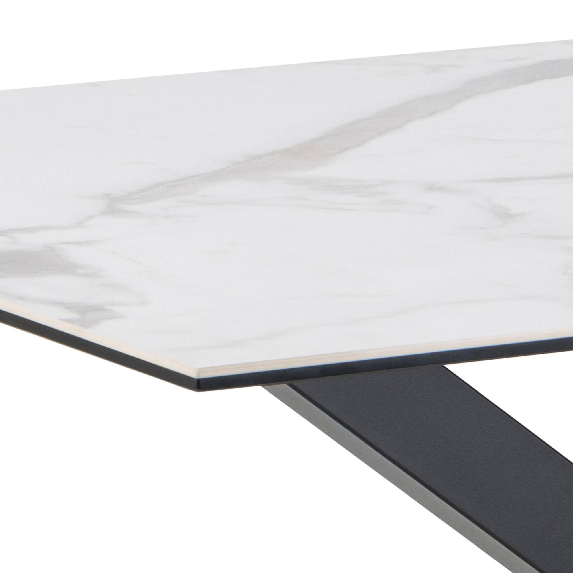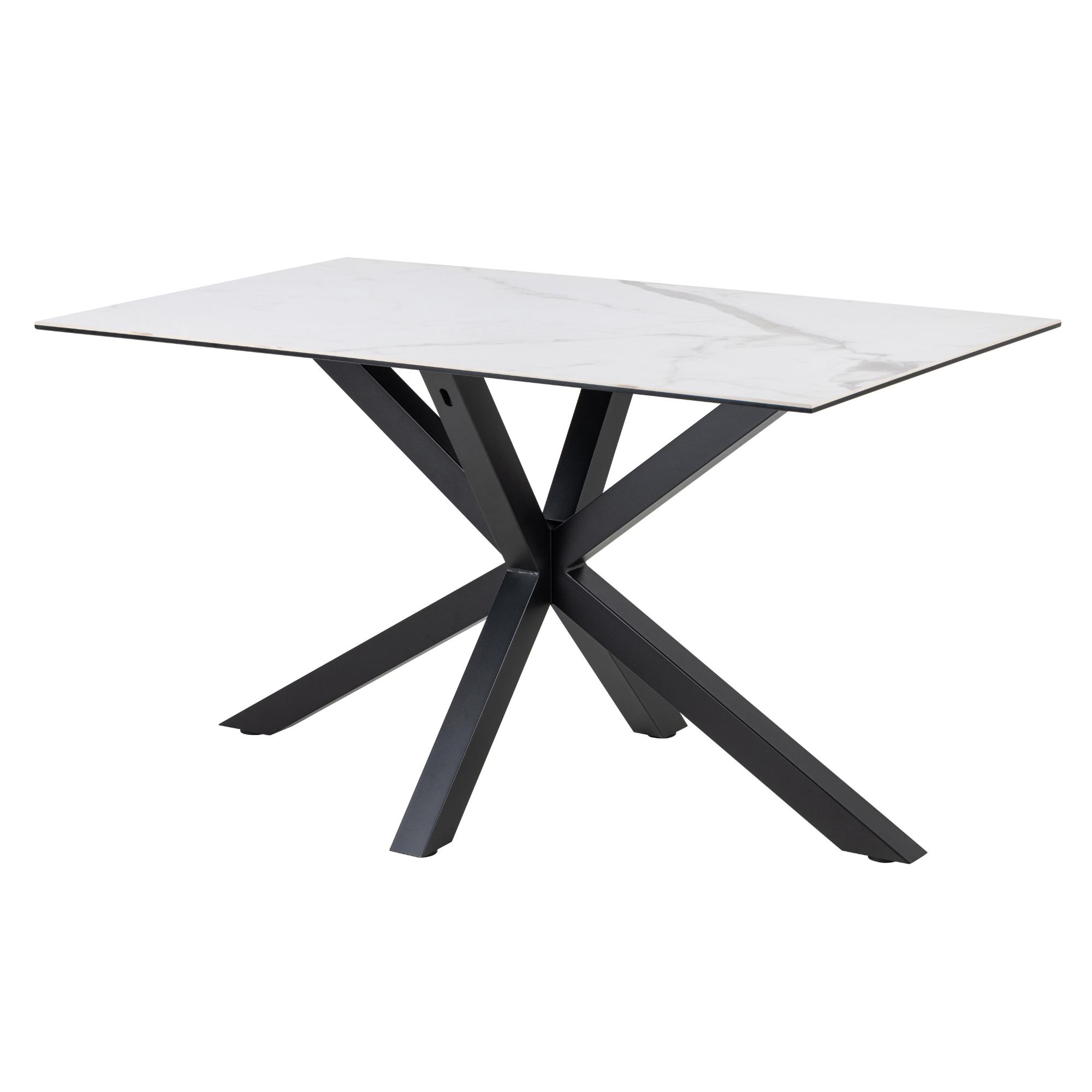 Stůl disponuje pevnými kovovými nohami pokrytými matným lakem, které jsou zárukou jeho stability. Jeho deska je vyrobena z keramiky a je odolná vůči teplu. Tyto materiály jsou nenáročné na údržbu, a tak starostlivost o stůl bez problémů zvládnete.