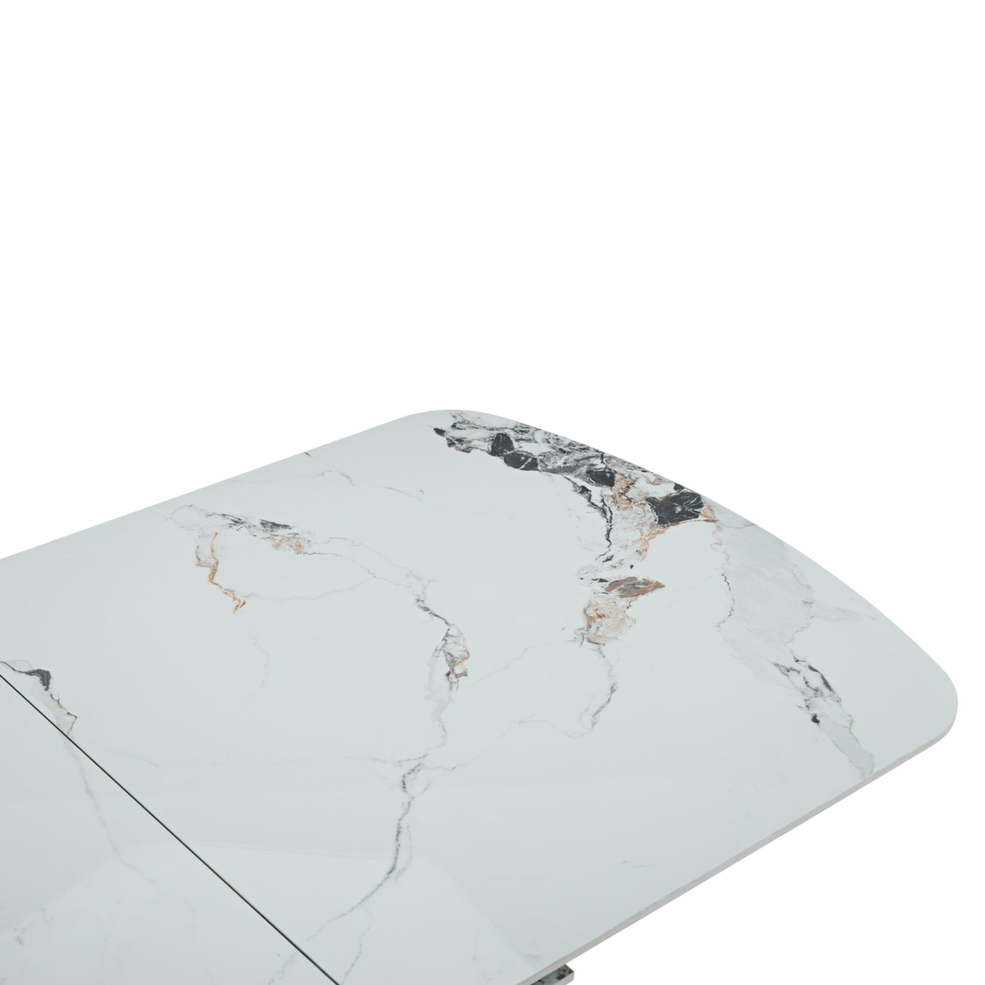 Stůl stojí na pevných a stabilních kovových nohách, jejichž povrch je opatřen práškovým nástřikem. Horní deska je vyrobena ze slinutého kamene a zdobí ji stylový dekor mramoru.