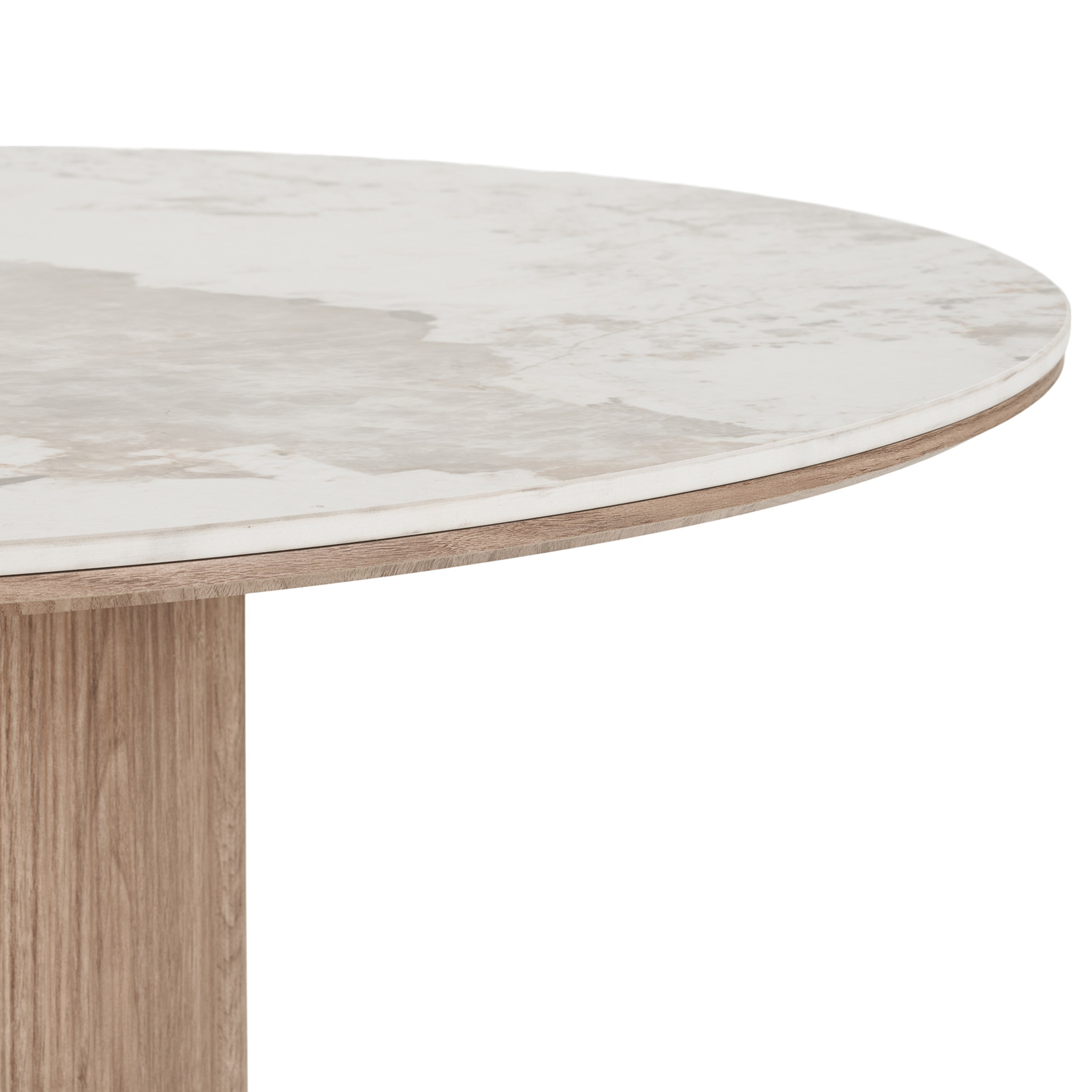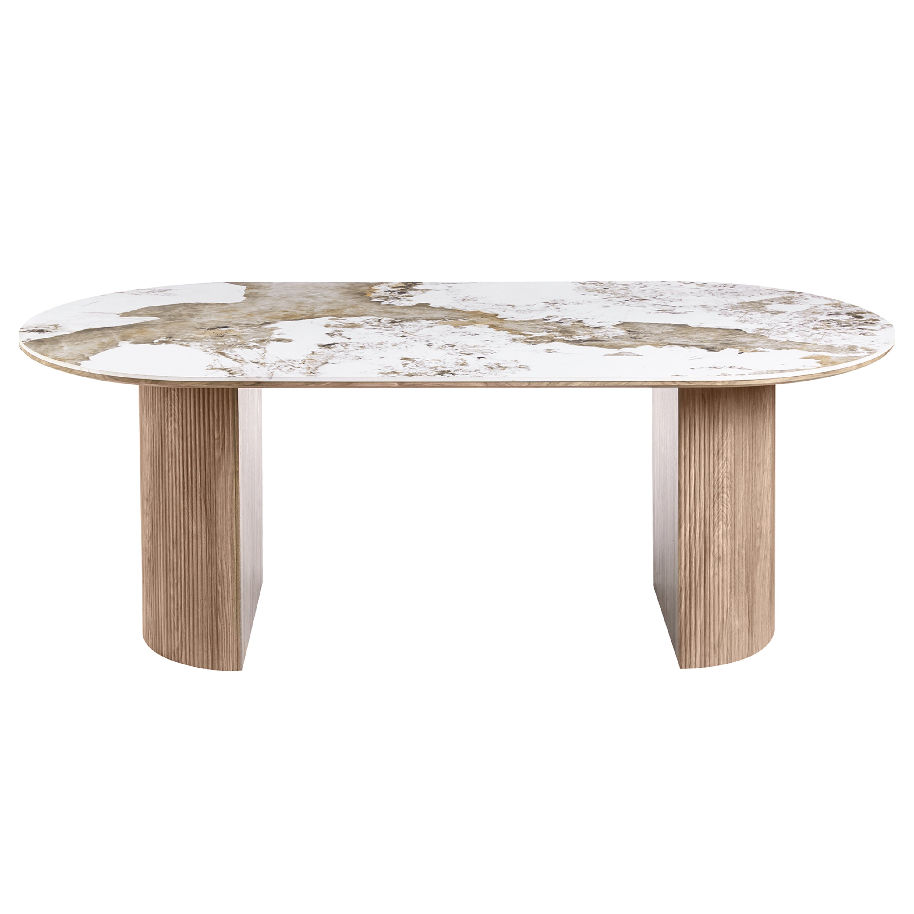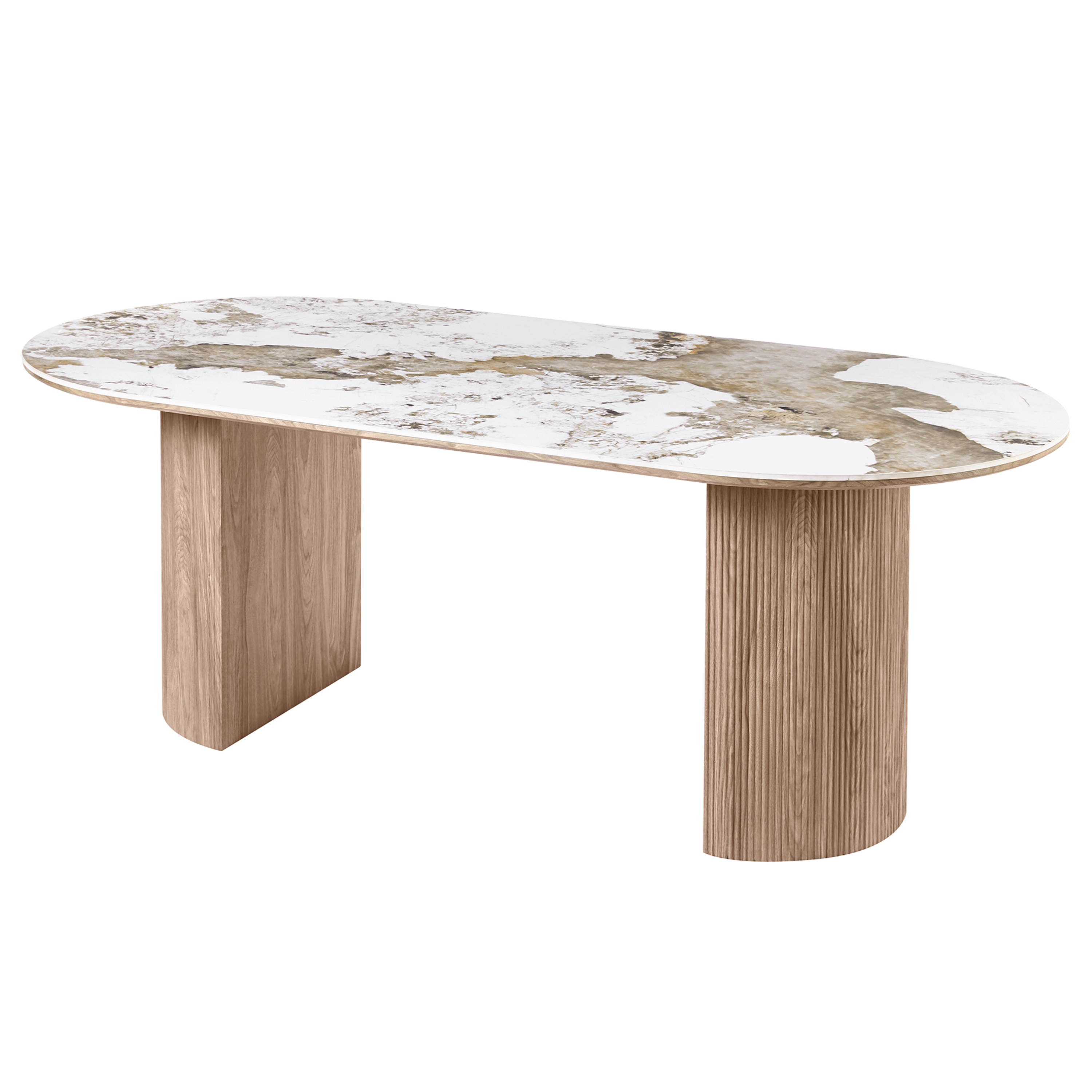 Velkorysá jídelní plocha vyrobená z keramiky poskytuje dostatek místa pro pohodlné stolování s rodinou i přáteli. Stabilní podnož z MDF materiálu s dekorativním papírem podtrhuje čistý, minimalistický design stolu. Oválná stolová deska v kombinaci s masivně působící podnoží vytváří harmonický celek, jenž se snadno stane dominantou jídelny i stylového obývacího prostoru.