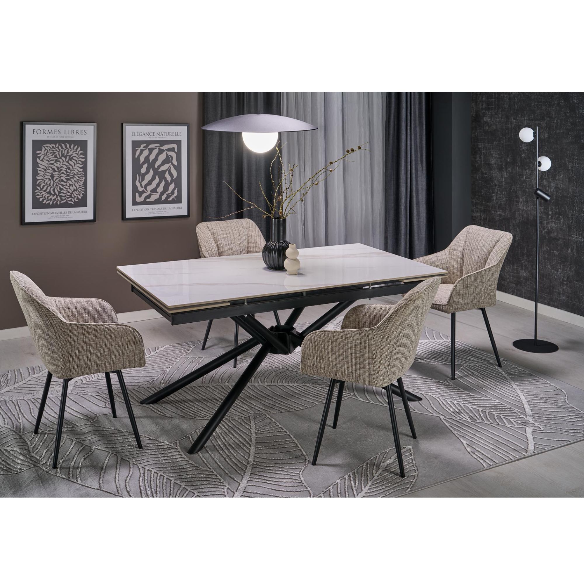 Pevná konstrukce, která je zárukou stability stolu, je vyrobena z kovu. Deska je z kvalitního slinutého kamene a zdobí ji stylový dekor mramoru.