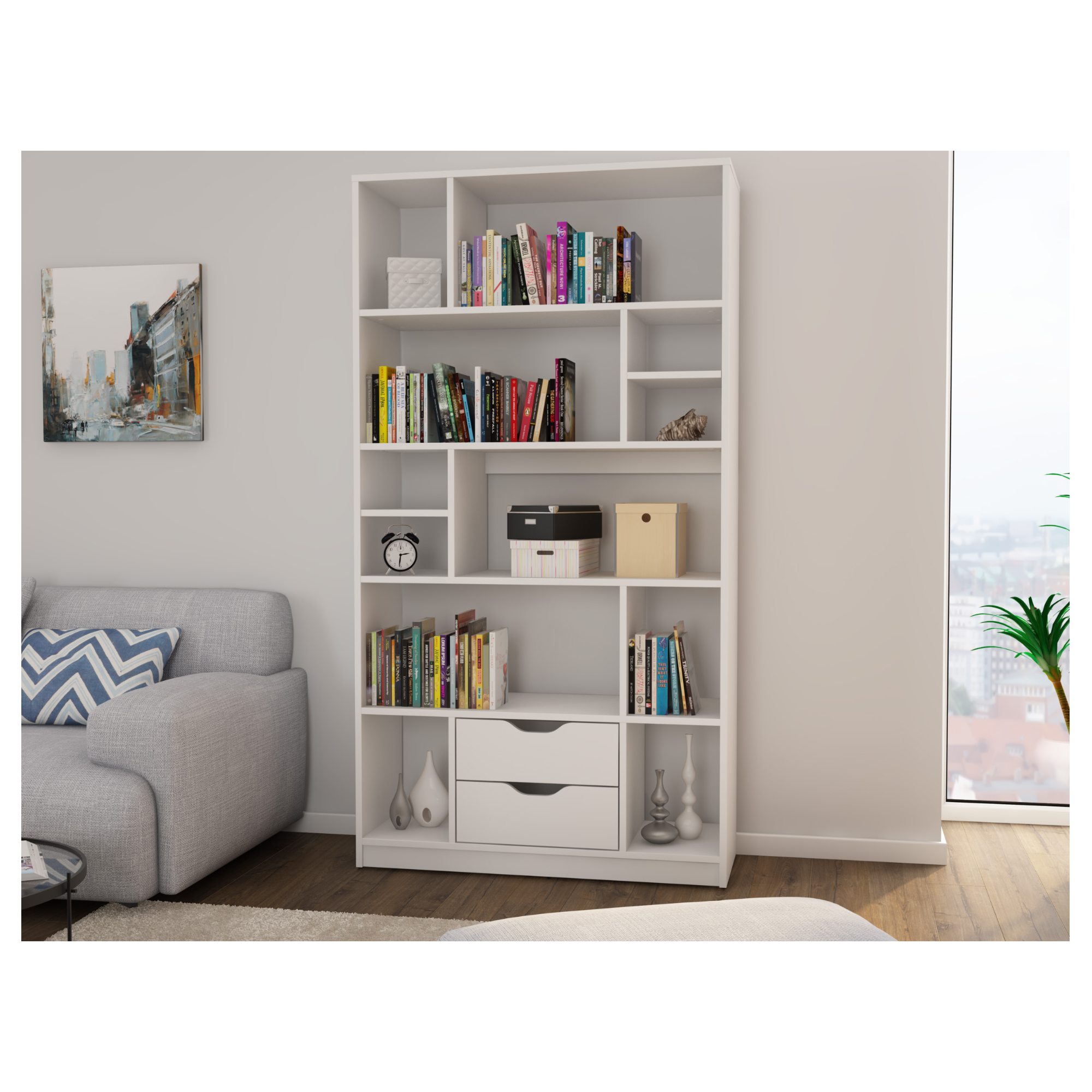 Prostor je rozdělen na otevřenou a uzavřenou část. Celkem nabízí 12 různě velkých otevřených odkládacích buněk pro přehledné uspořádání knih, dokumentů nebo vystavení nejrůznějších květin a dekorací. V dolní sekci se dále nachází 2 praktické zásuvky, které bezpečně uchovají vše potřebné.