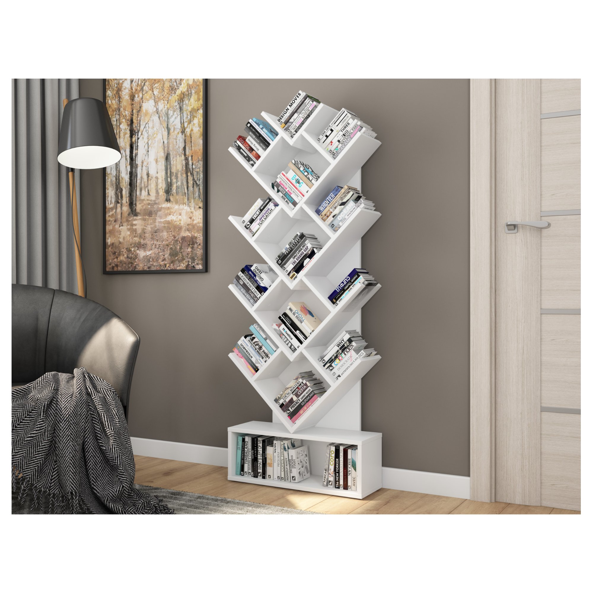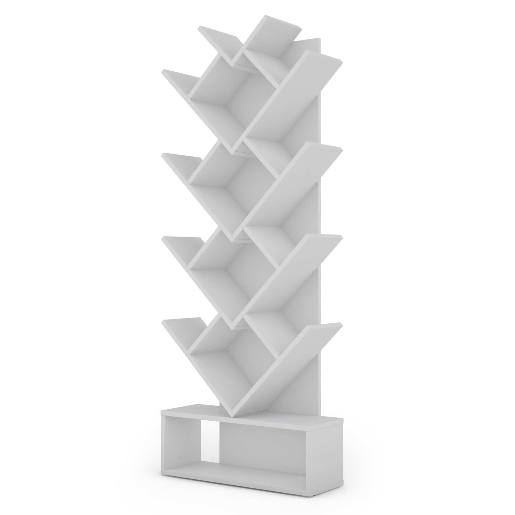 Neobvykle poskládané police nabízejí dostatečný prostor pro uložení knih a časopisů. Horní sekce knihovny je členěna do několika pater a poskytuje celkem 13 otevřených polic. Podstavec pak nabízí dodatečný úložný prostor pro vaše knihy nebo dekorace. Konstrukce je vyrobena z laminované dřevotřískové desky, která se vyznačuje snadnou údržbou.