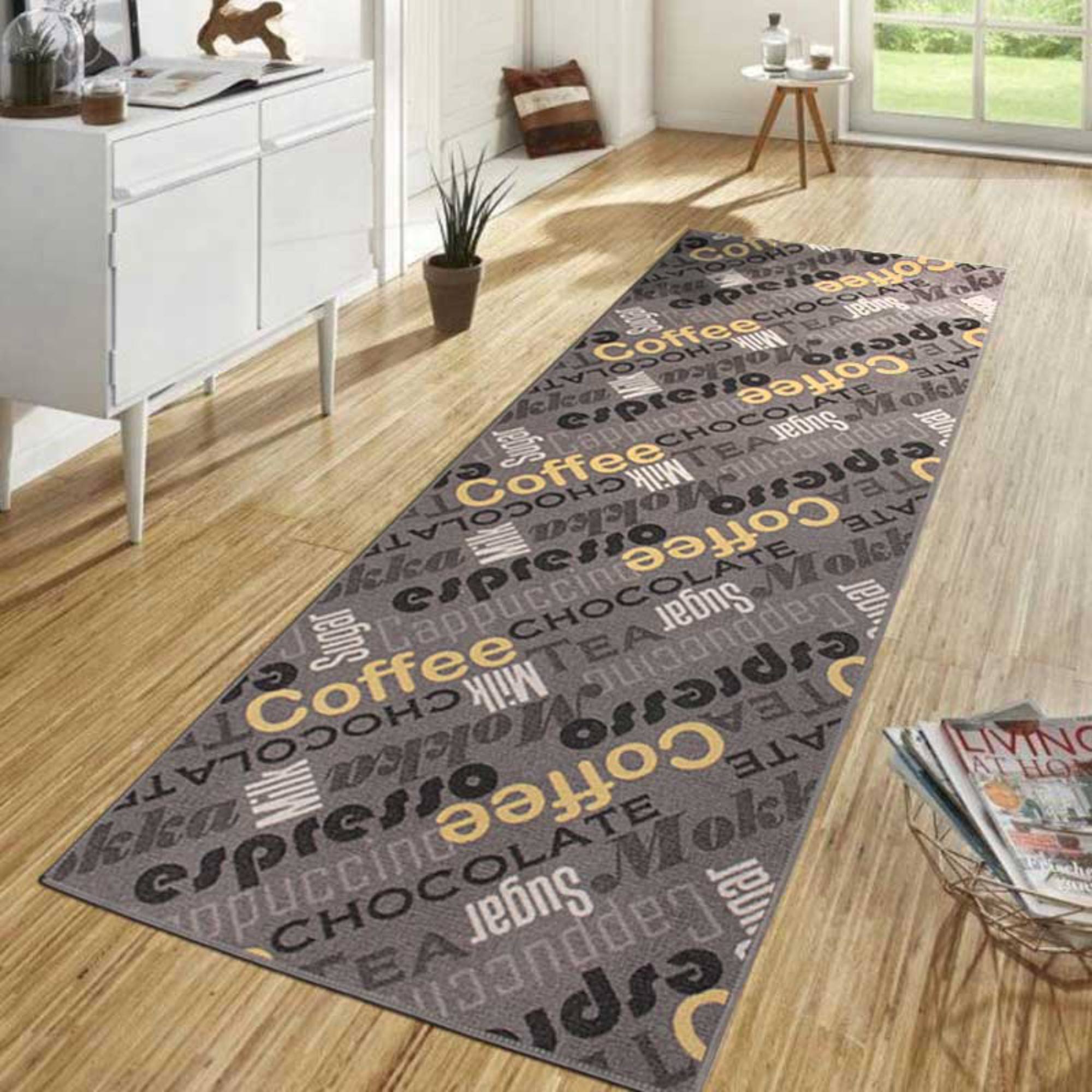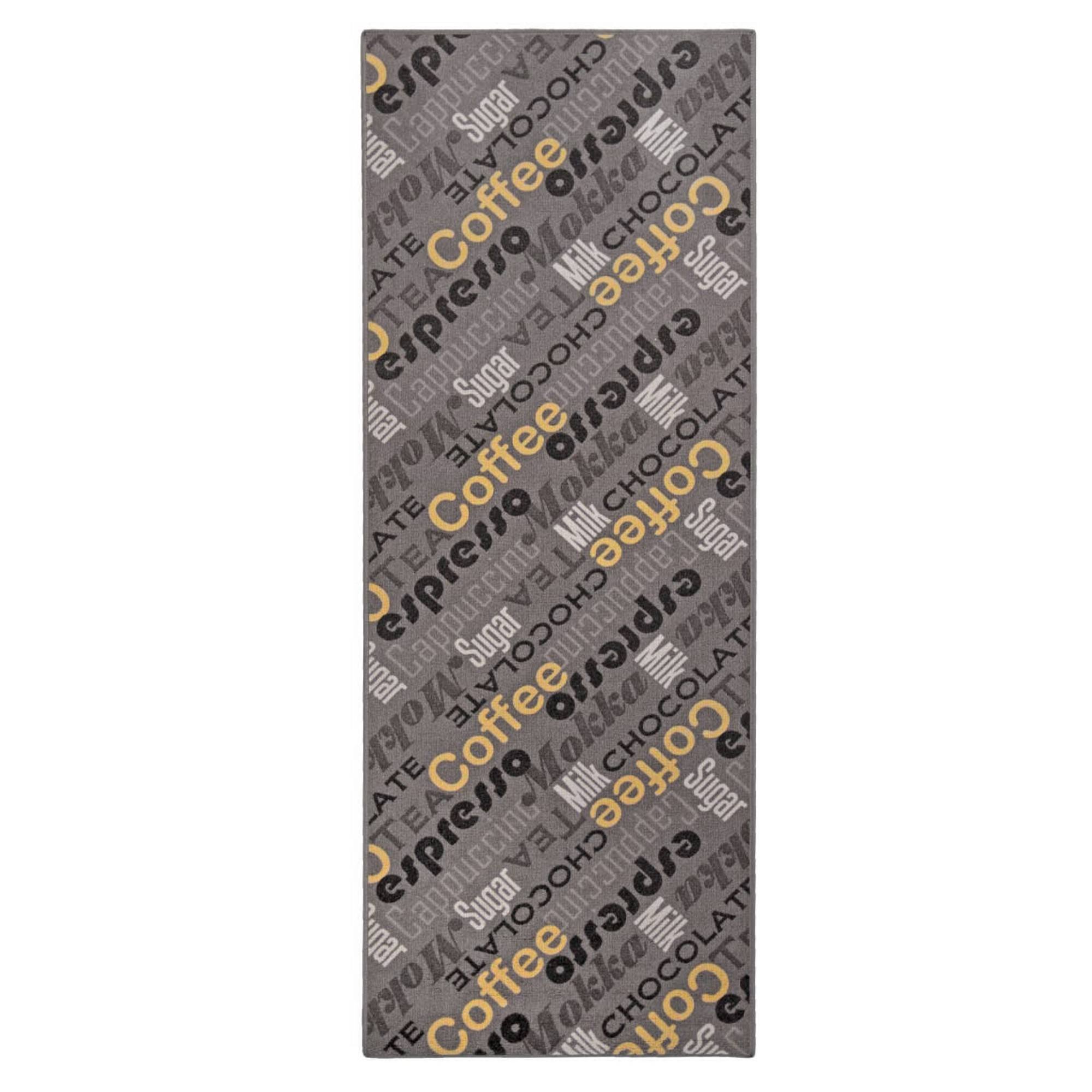 Patříte k milovníkům dobré kávy? To vám padne do oka tento originální koberec. Design je nápaditě pojatý s nápisy nejrůznějších horkých nápojů. Je z polyamidu, díky čemuž má zlepšené antistatické vlastnosti a lépe se vypořádá s vlhkostí. Zadní strana je z protiskluzové gumy, takže se nemusíte bát případného podjetí pod nohama.
