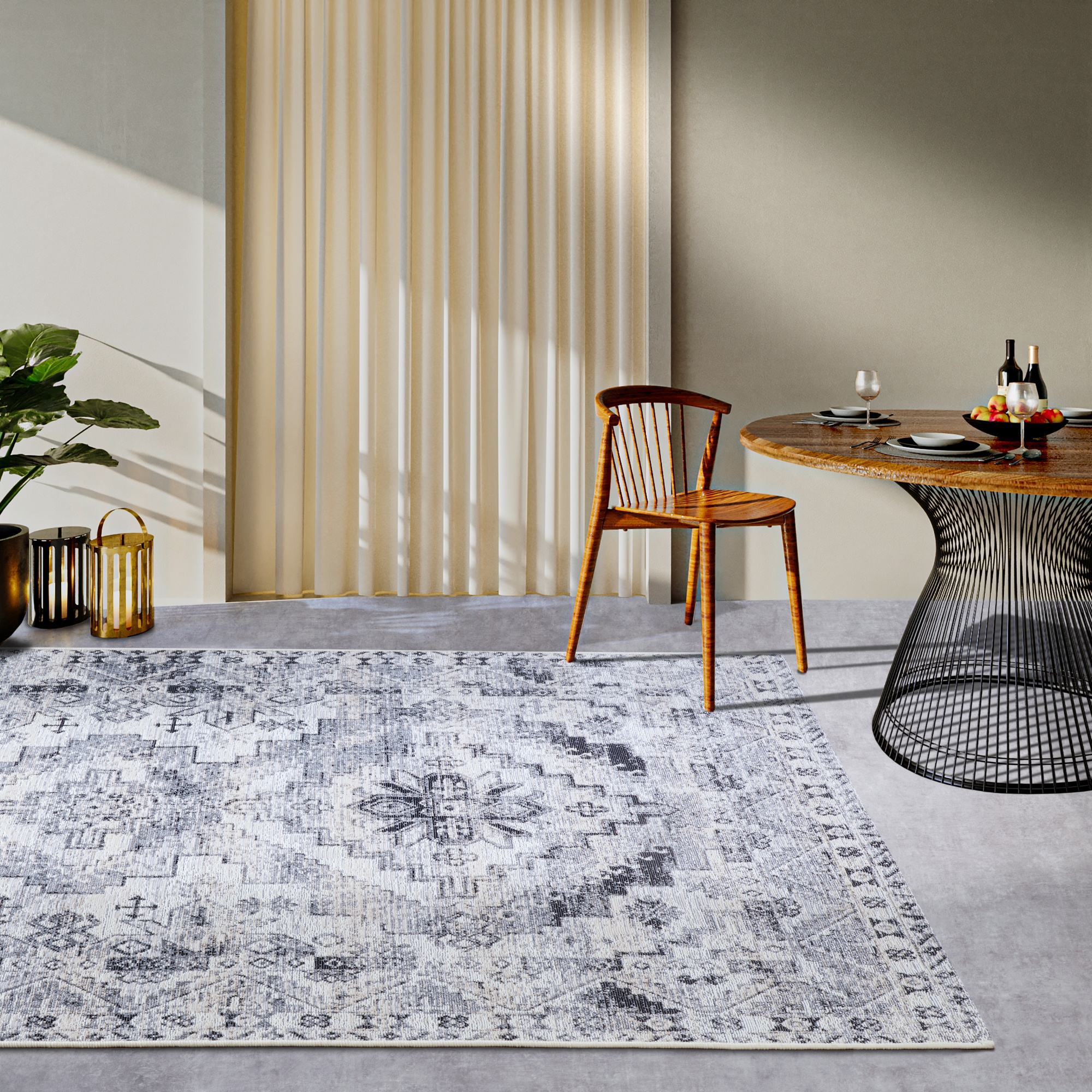 Je strojově tkaný ze 70% polypropylenu a 30% polyesteru. Kombinace těchto materiálů a ploché vazby mu dodává praktické vlastnosti. Koberec odpuzuje nečistoty, snadno se čistí, je odolný vůči UV záření a povětrnostním vlivům. Je také vhodný do místností s podlahovým vytápěním. Bude skvělým doplňkem do obývacího pokoje, jídelny i na terasu či balkon. Zadní strana koberce je opatřena latexem, který funguje jako protiskluzová vrstva a lépe udržuje koberec na místě.
