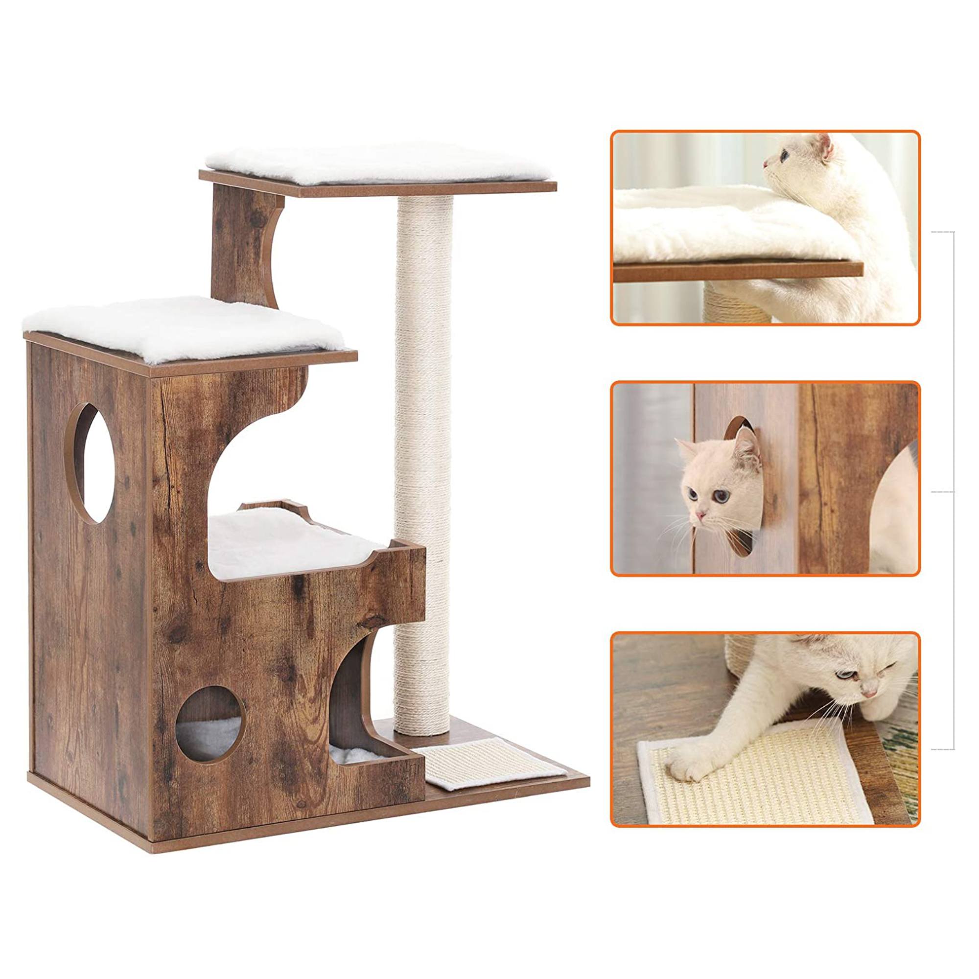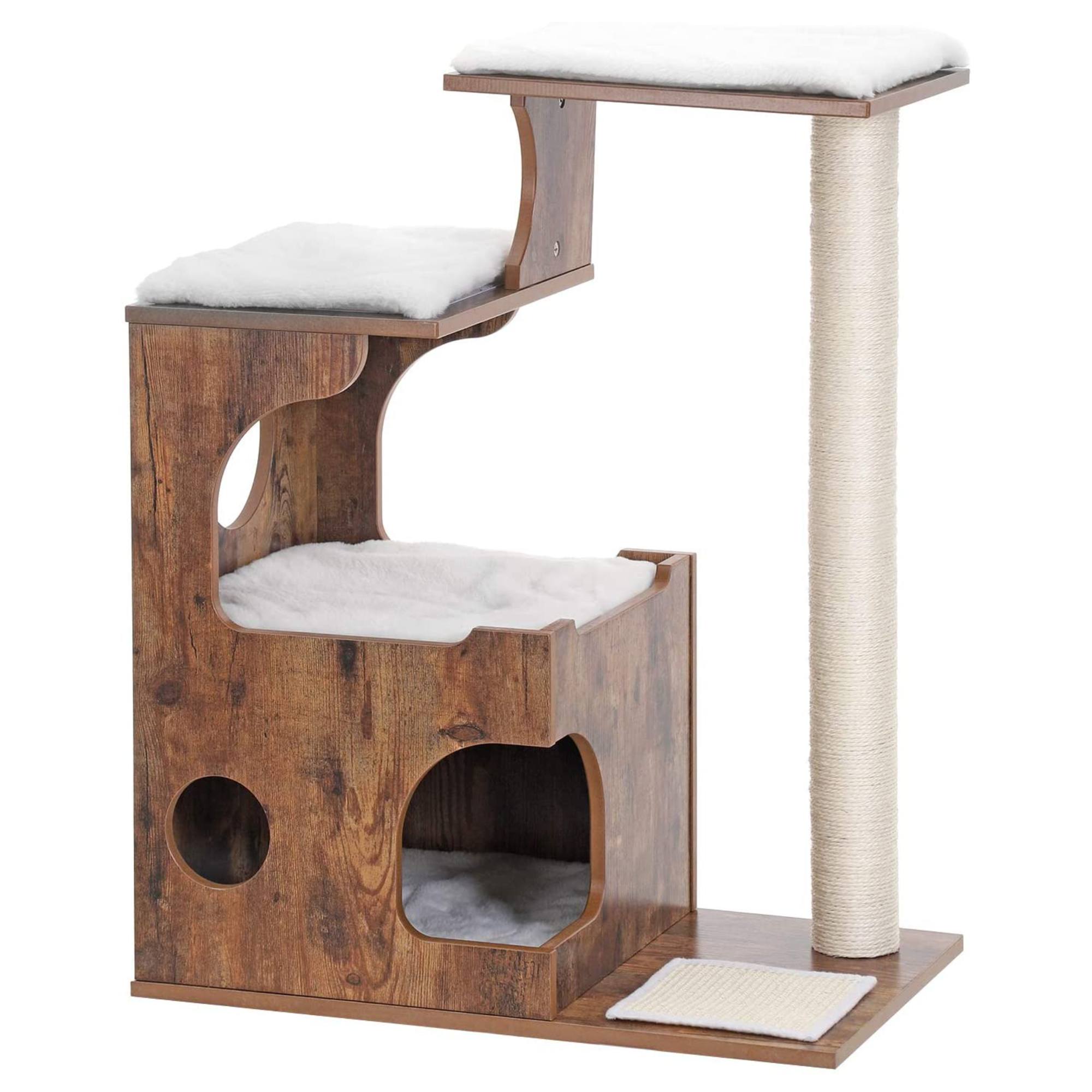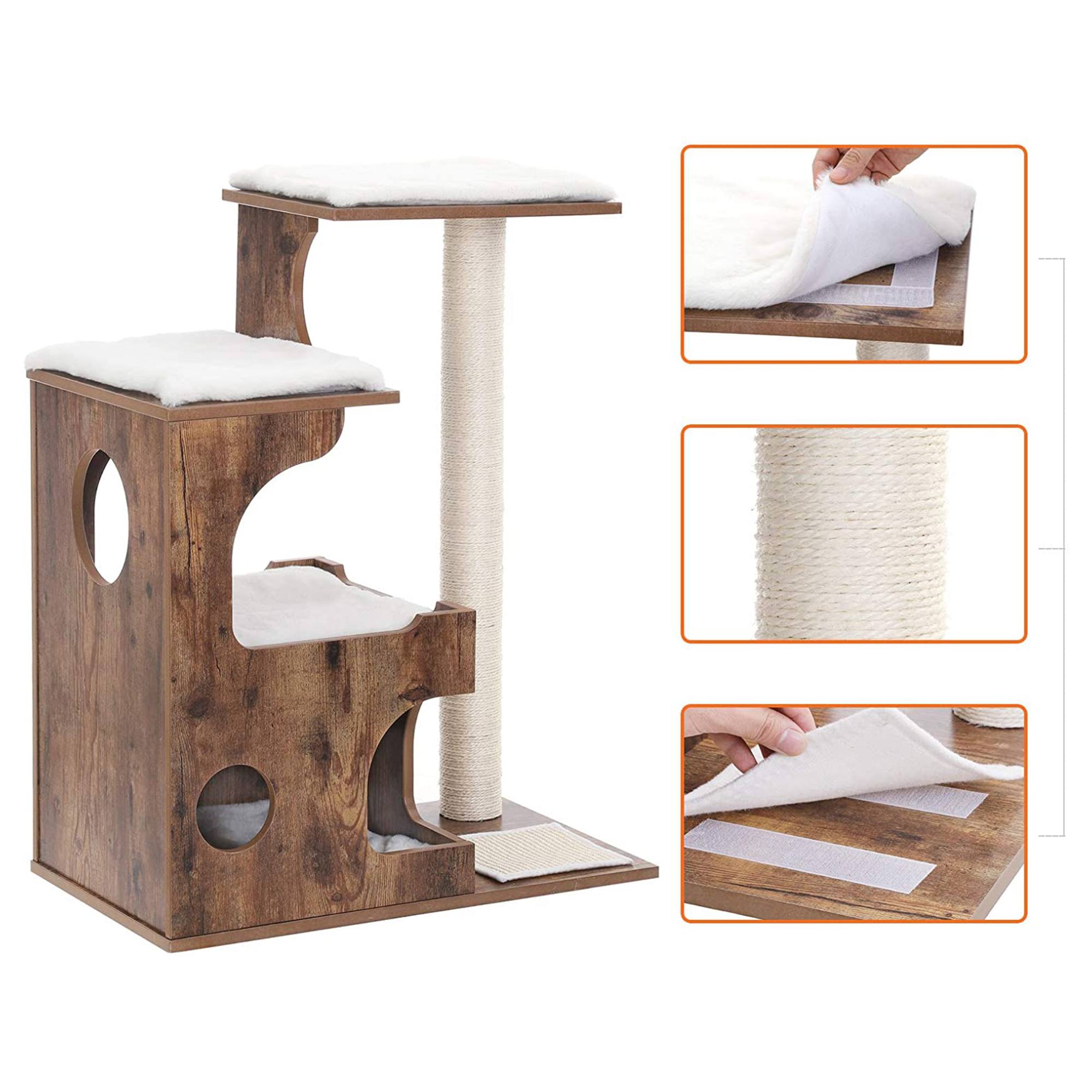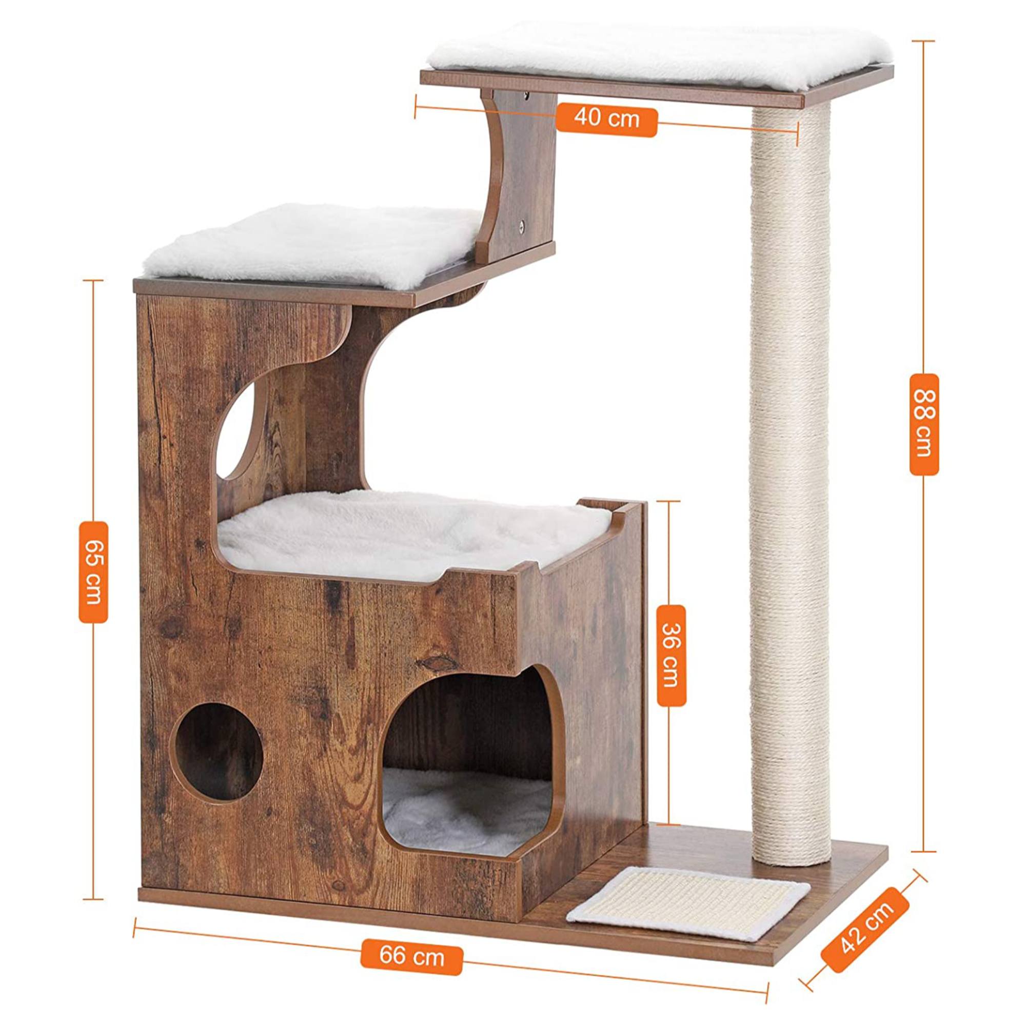 Dopřejte vašemu kočičímu mazlíčkovi královský pelech v podobě kočičího stromu, který zároveň slouží i jako prolézačka. Tento strom je díky svému provedení vhodný zejména pro koťata, takže se nemusíte obávat, že by se na něj neodvážila vylézt. Čtyři měkké pelechy, z toho jeden schovaný uvnitř konstrukce dodá kočičce komfort a pocit bezpečí. Pro zbroušení drápků je zde obmotaný sisal, ten je odolný vůči poškrábání.