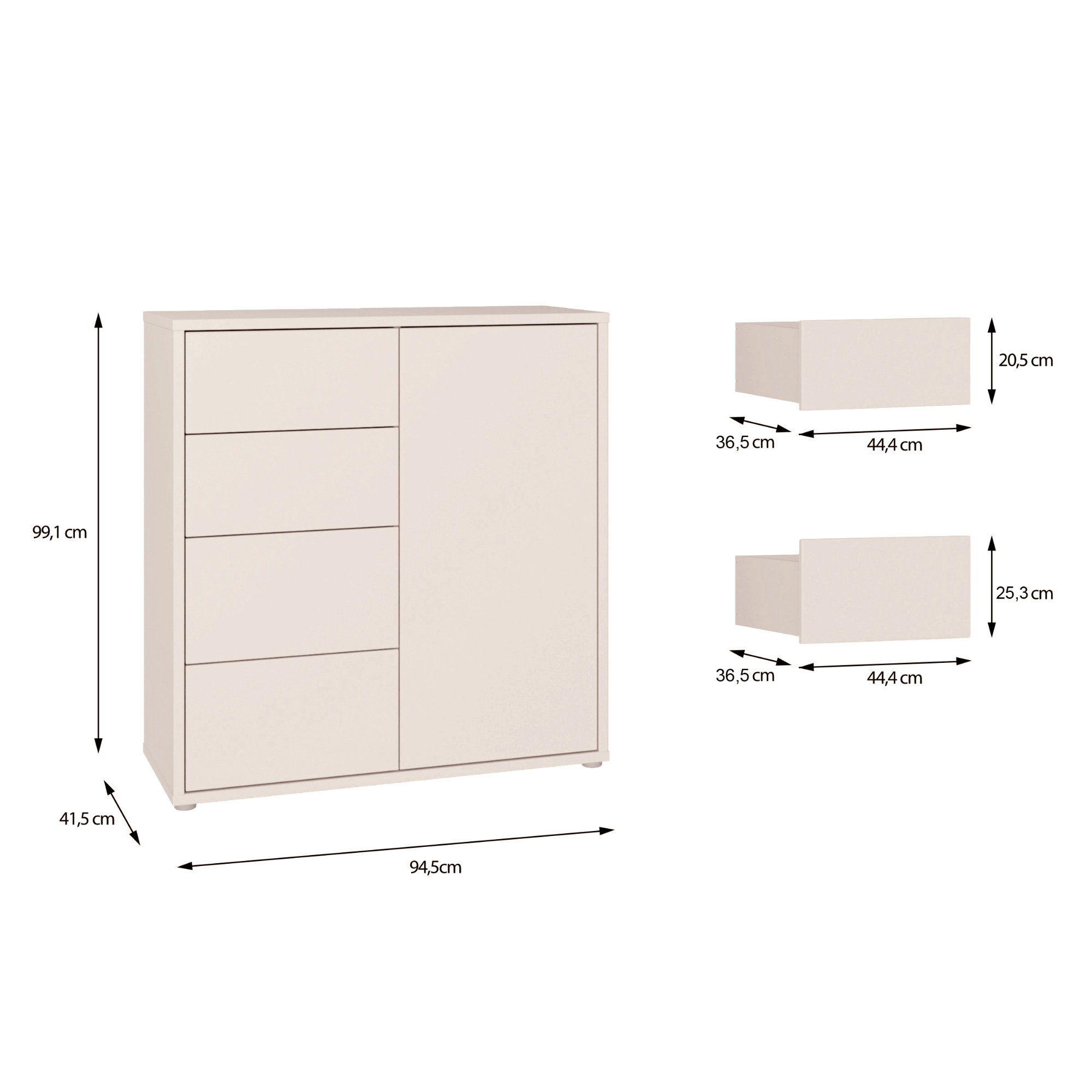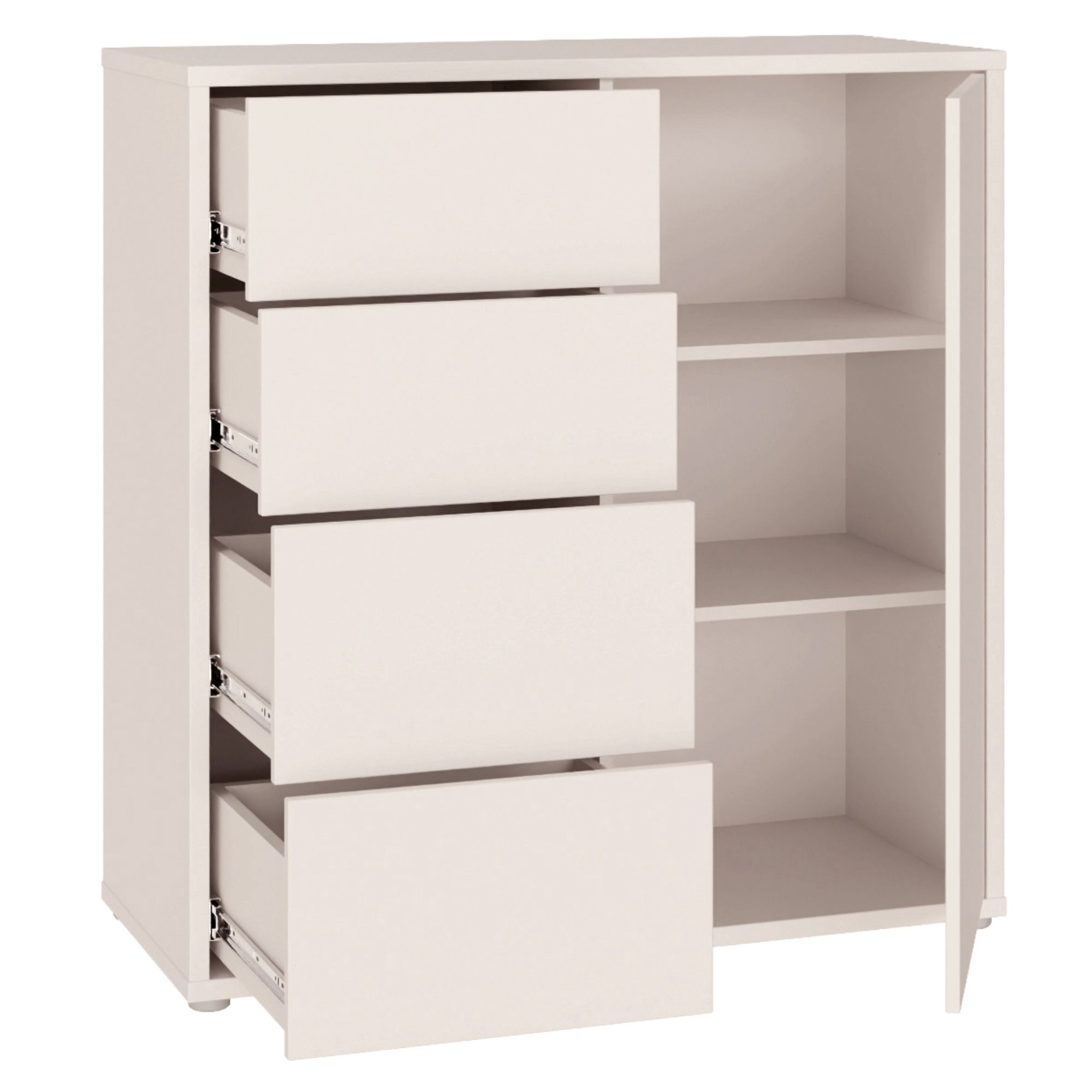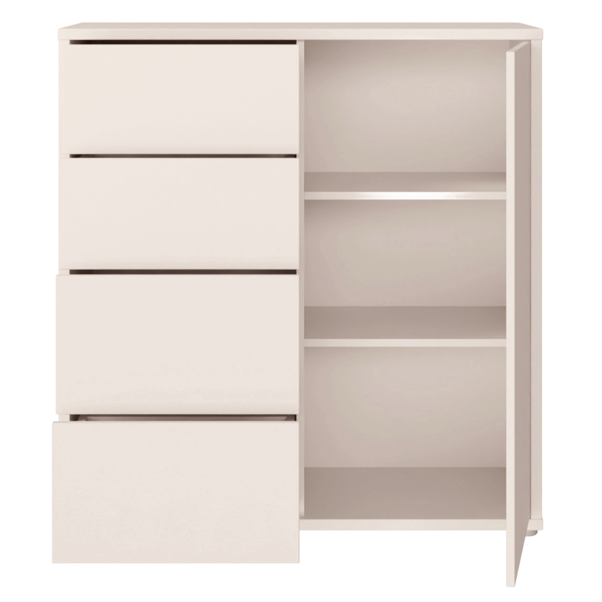 Poskytuje dostatek prostoru pro uložení oblečení, dokumentů i dalších drobností, které chcete mít přehledně uspořádané. Je vybavena 4 zásuvkami a 2 policemi, které se ukrývají za otočnými dvířky. Disponuje systémem push-to-open, díky kterému snadno otevřete zásuvky i dvířka pouhým stlačením. Provedení bez úchytek podtrhuje její čistý vzhled, jež elegantně doplní obývací pokoj i ložnici. Je vyrobena z laminovaného dřevěného materiálu, který se vyznačuje snadnou údržbou.