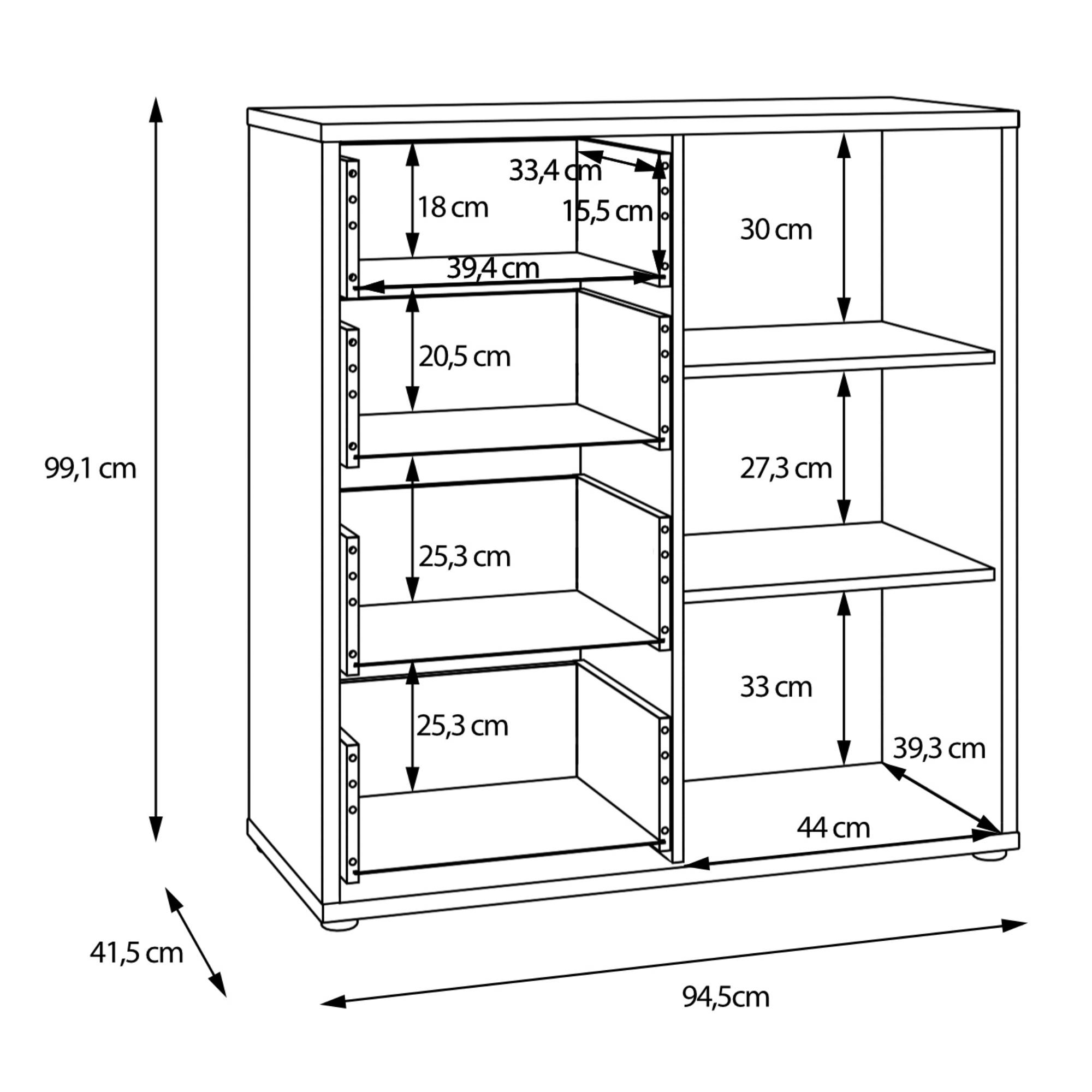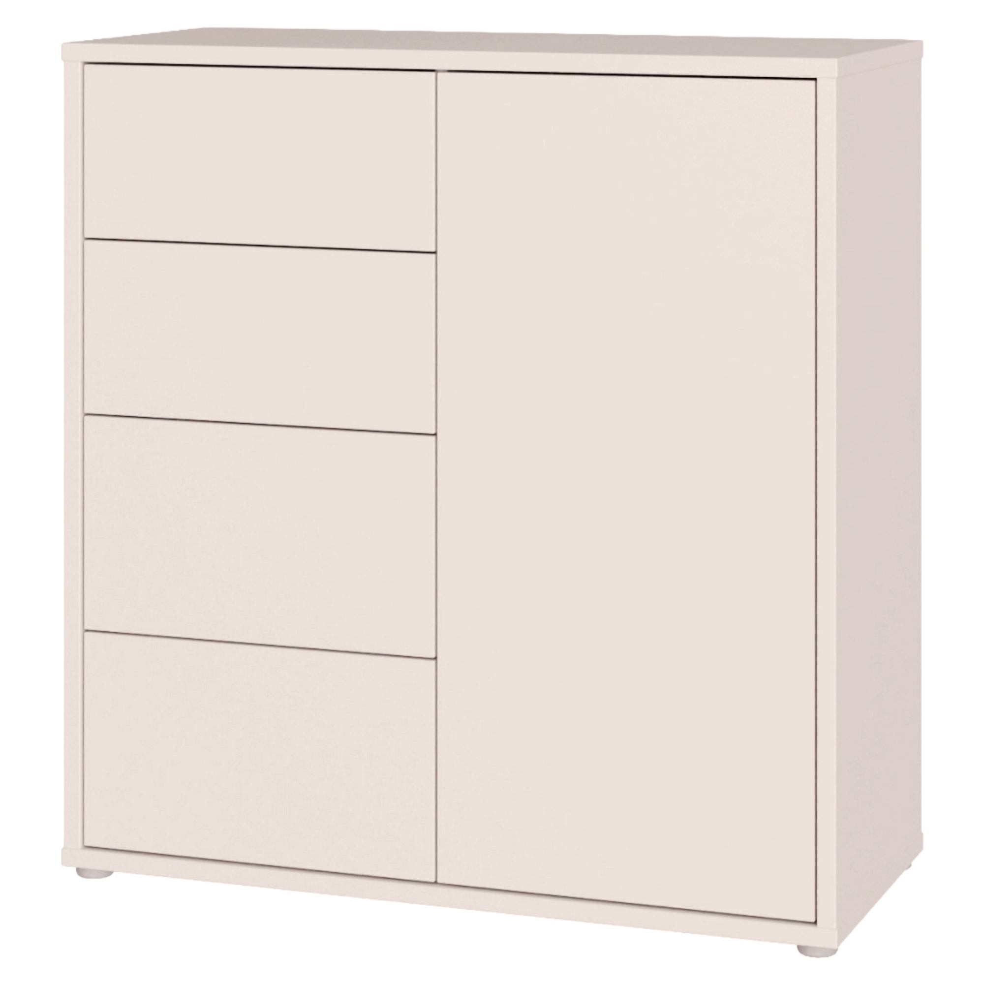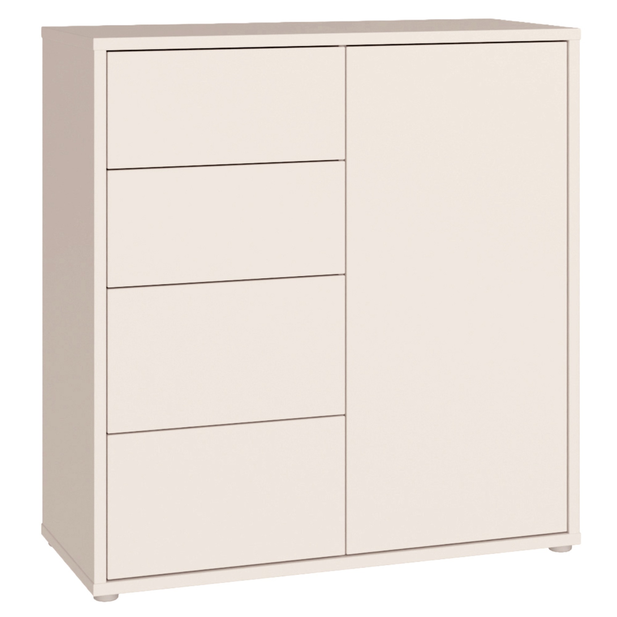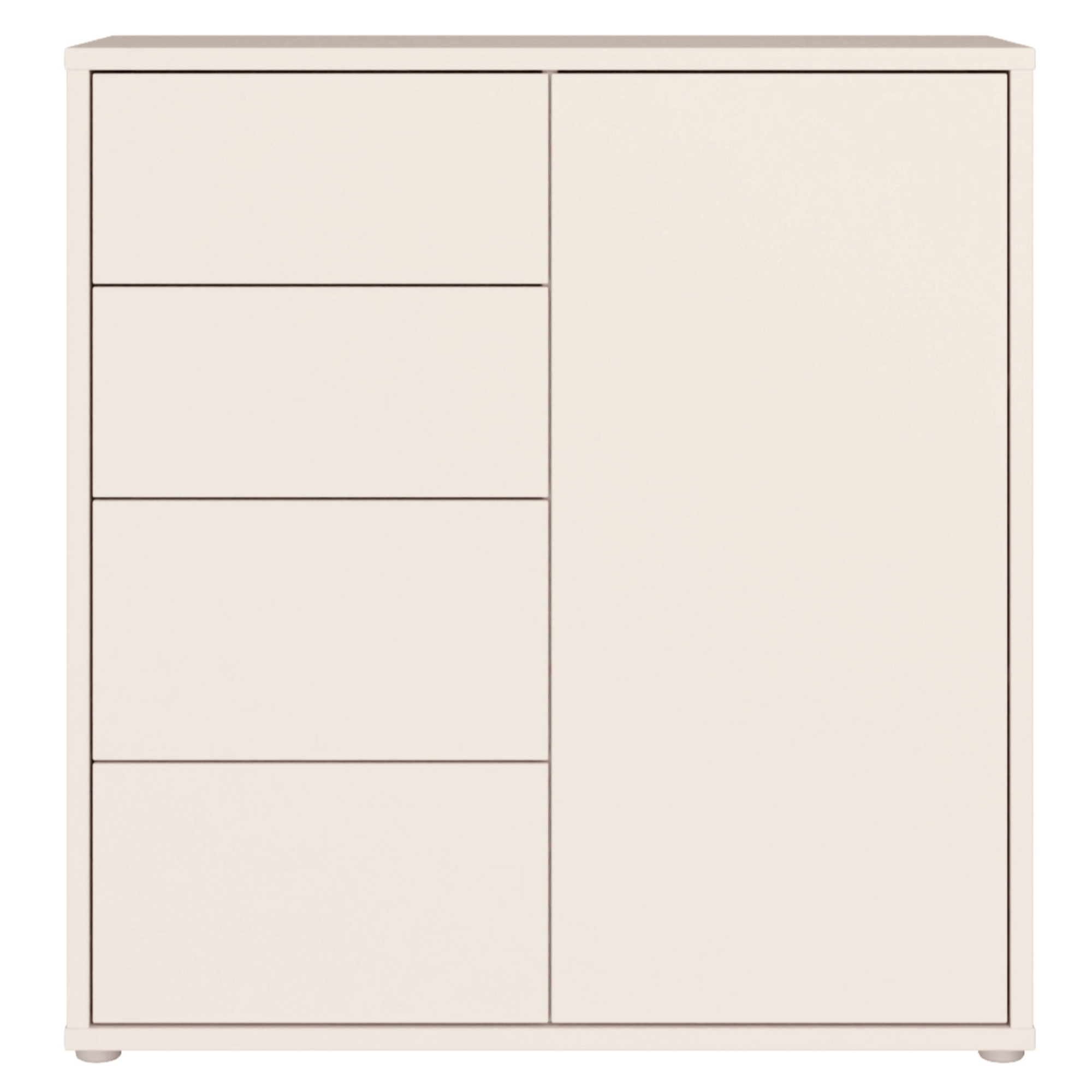 Poskytuje dostatek prostoru pro uložení oblečení, dokumentů i dalších drobností, které chcete mít přehledně uspořádané. Je vybavena 4 zásuvkami a 2 policemi, které se ukrývají za otočnými dvířky. Disponuje systémem push-to-open, díky kterému snadno otevřete zásuvky i dvířka pouhým stlačením. Provedení bez úchytek podtrhuje její čistý vzhled, jež elegantně doplní obývací pokoj i ložnici. Je vyrobena z laminovaného dřevěného materiálu, který se vyznačuje snadnou údržbou.