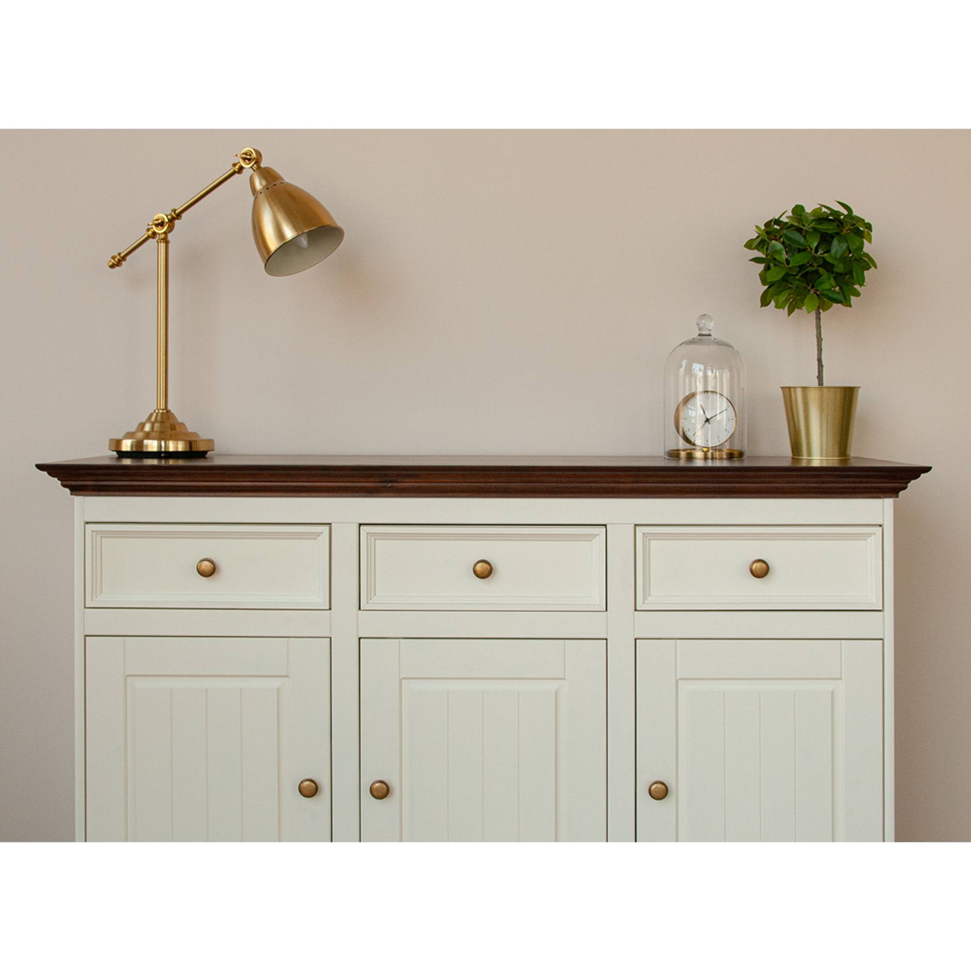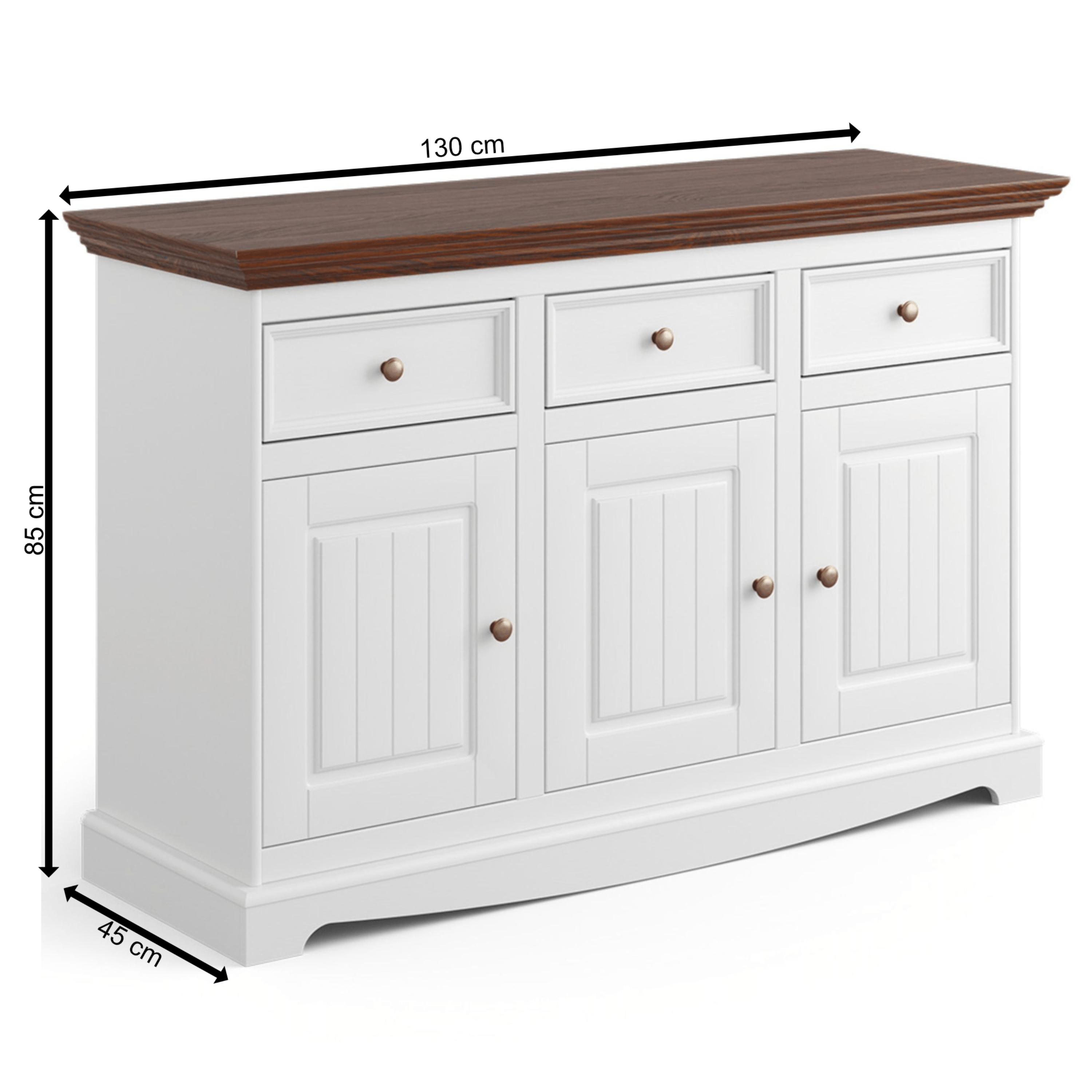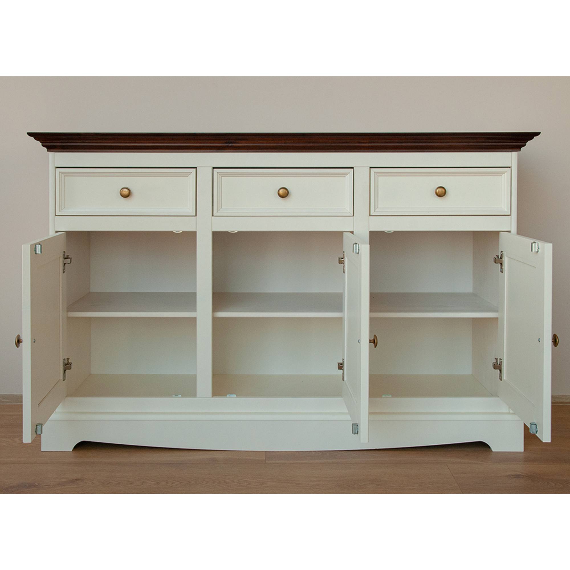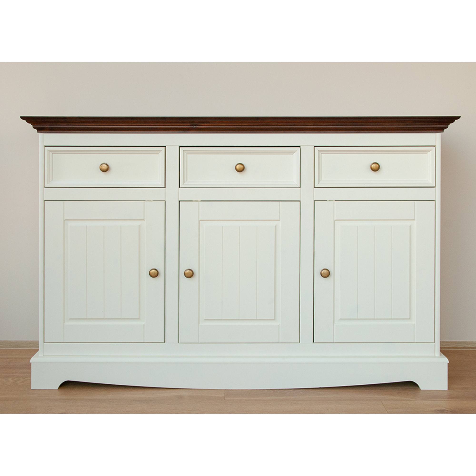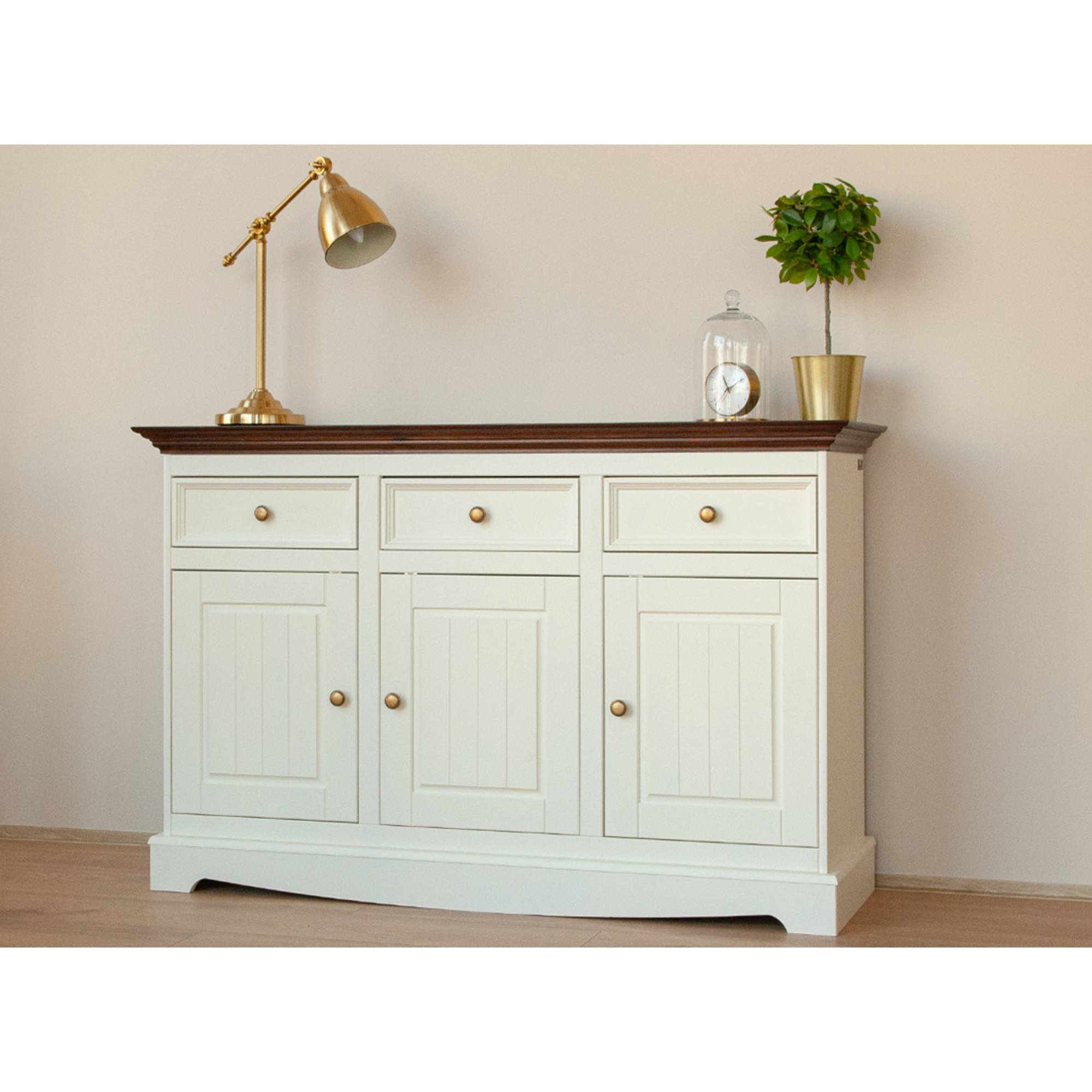 Obdržíte prostor pro uložení drobností i rozměrnějších předmětů. Do tří praktických zásuvek ideálně odložíte příbory, doklady nebo jiné předměty každodenní potřeby. Zásuvky disponují systémem dovírání SOFT CLOSE, což zvyšuje komfort používání nábytku. Tři prostorné skříně zase poslouží k uložení příležitostných dekorací, nádobí, ale i oblečení. Využít můžete i širokou desku, na kterou se vejde váza s květinami, svíčky a rodinné fotografie. Nadčasový a originální design podtrhují pevné knoflíkové úchytky.