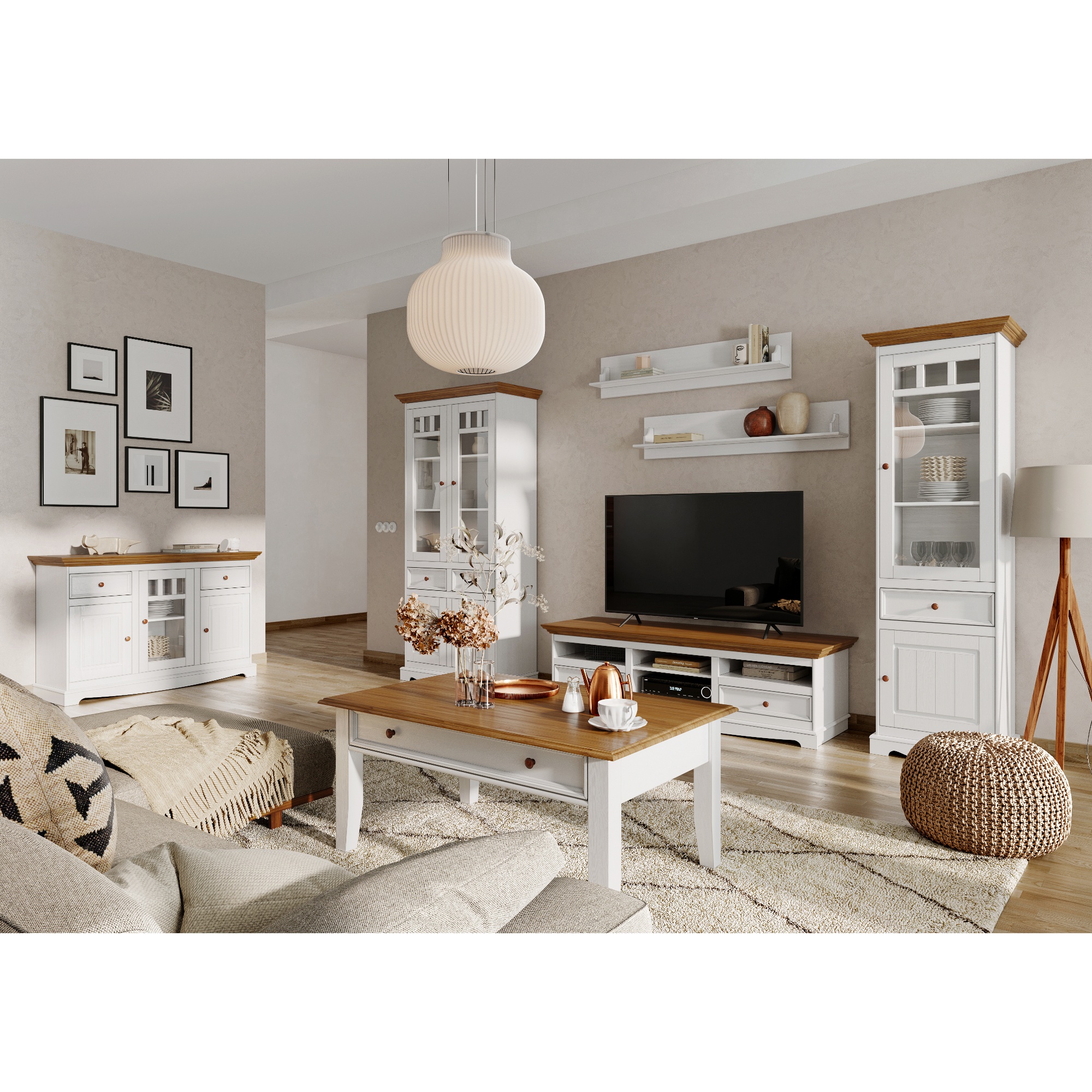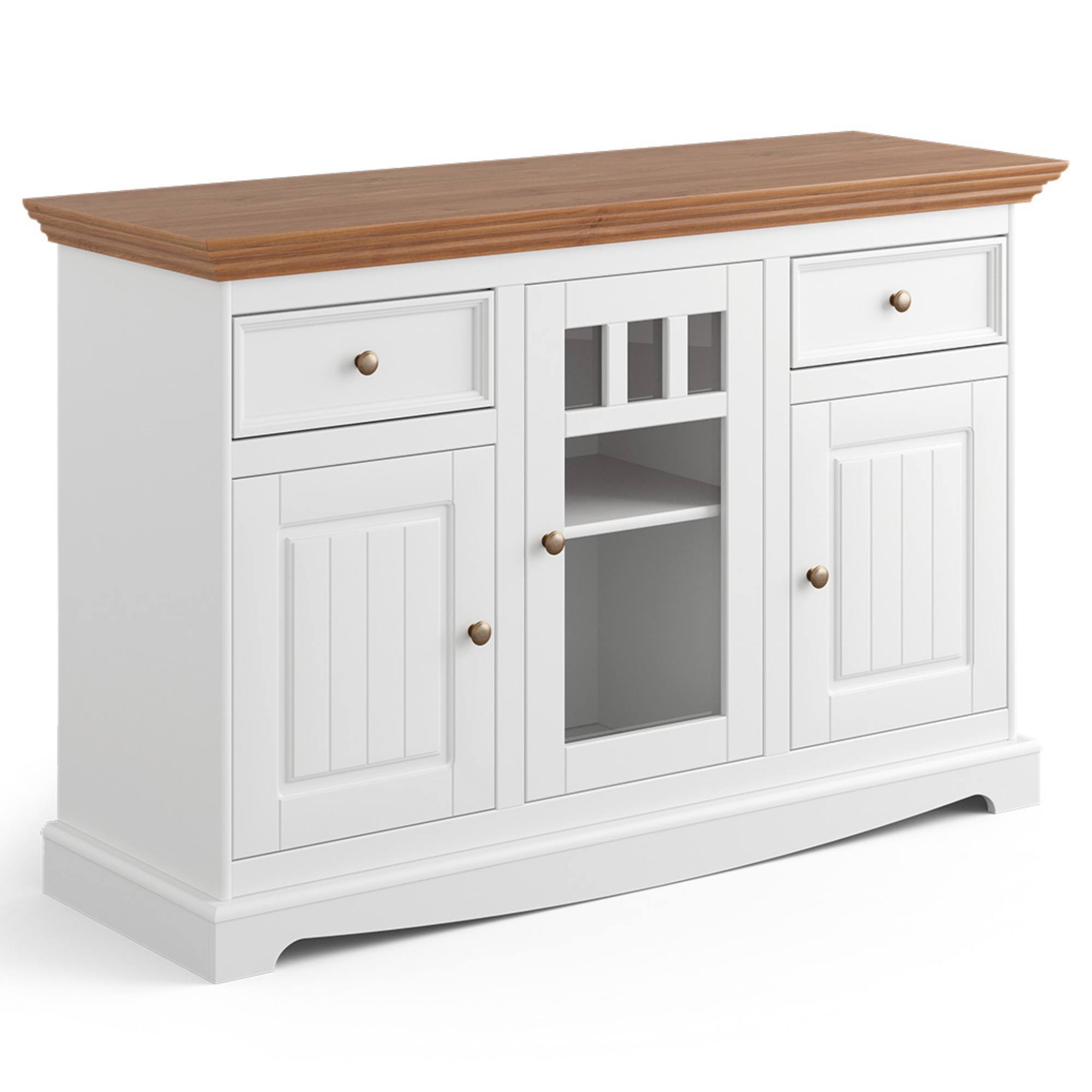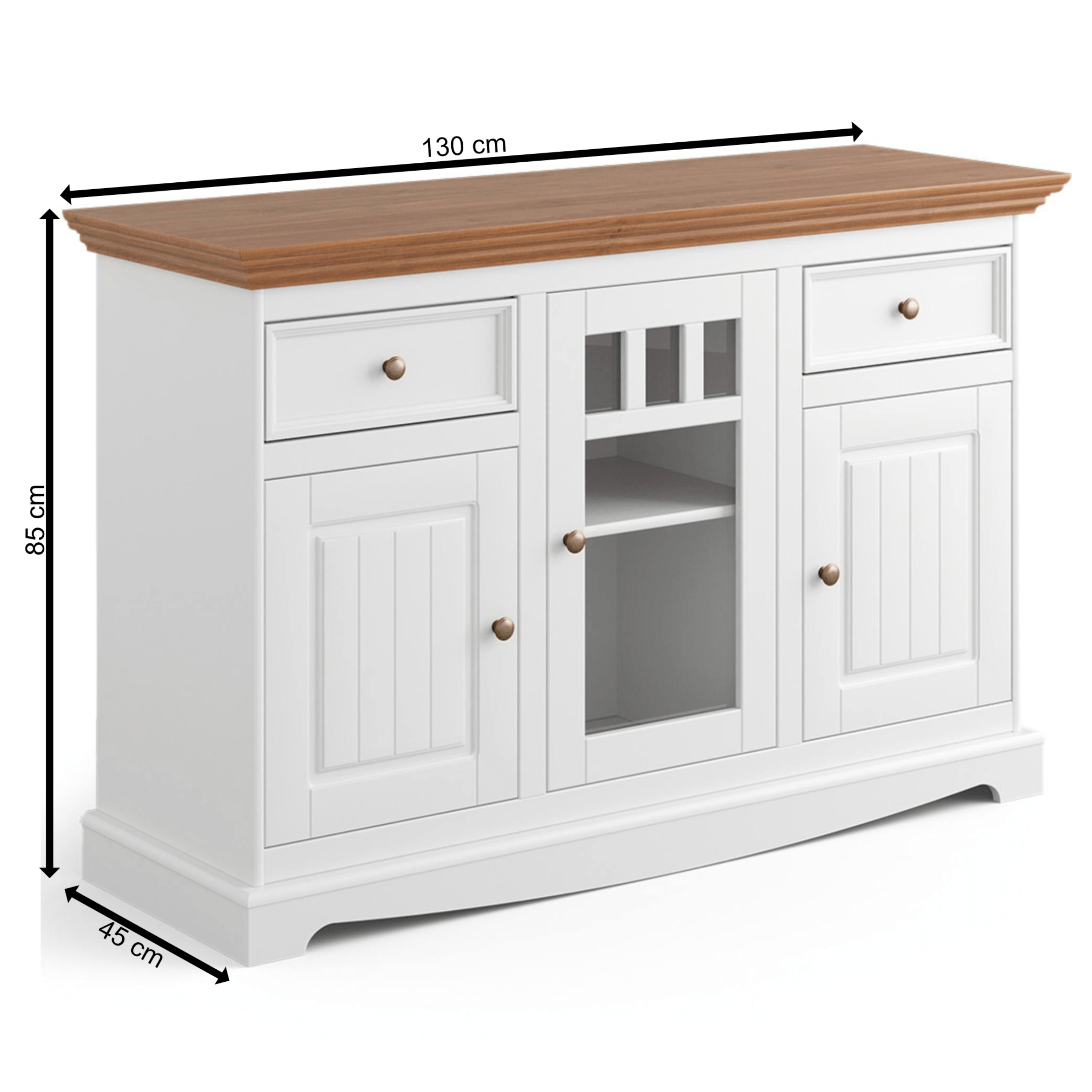 Obdržíte prostor pro uložení drobností i rozměrnějších předmětů. Do tří praktických zásuvek ideálně odložíte příbory, doklady nebo jiné předměty každodenní potřeby. Zásuvky disponují systémem dovírání SOFT CLOSE, což zvyšuje komfort používání nábytku. Tři prostorné skříně, z toho jedna prosklená zase poslouží k uložení příležitostných dekorací, nádobí, ale i oblečení. Využít můžete i širokou desku, na kterou se vejde váza s květinami, svíčky a rodinné fotografie. Nadčasový a originální design podtrhují pevné knoflíkové úchytky.