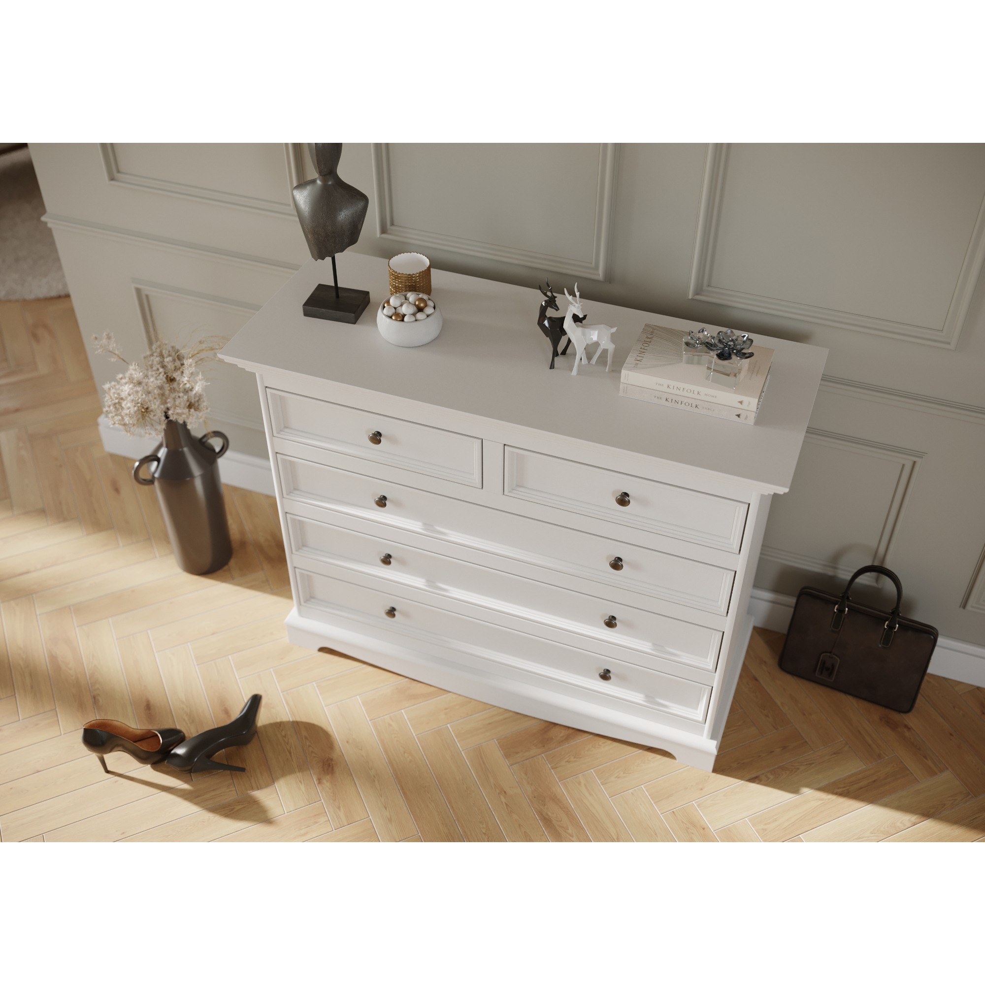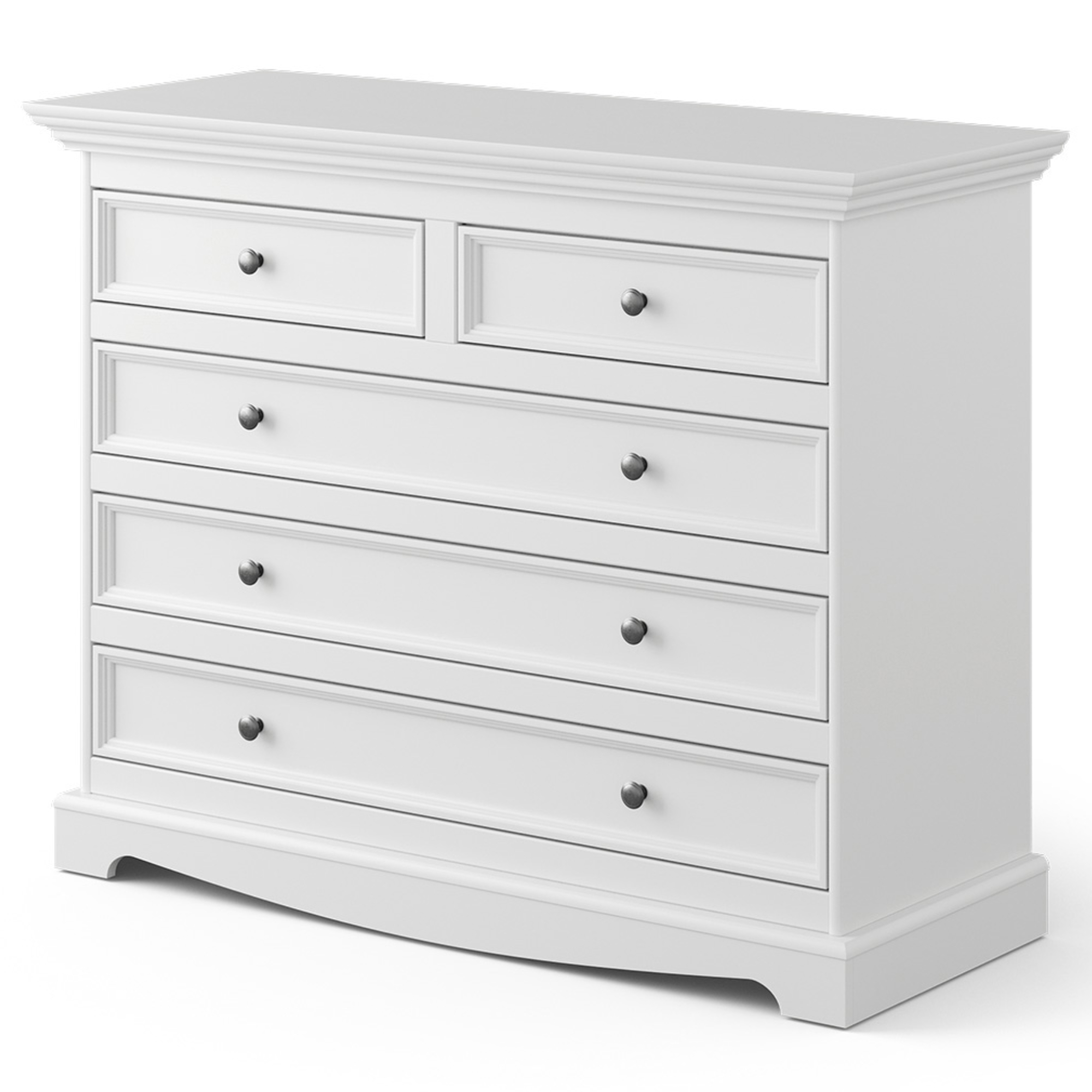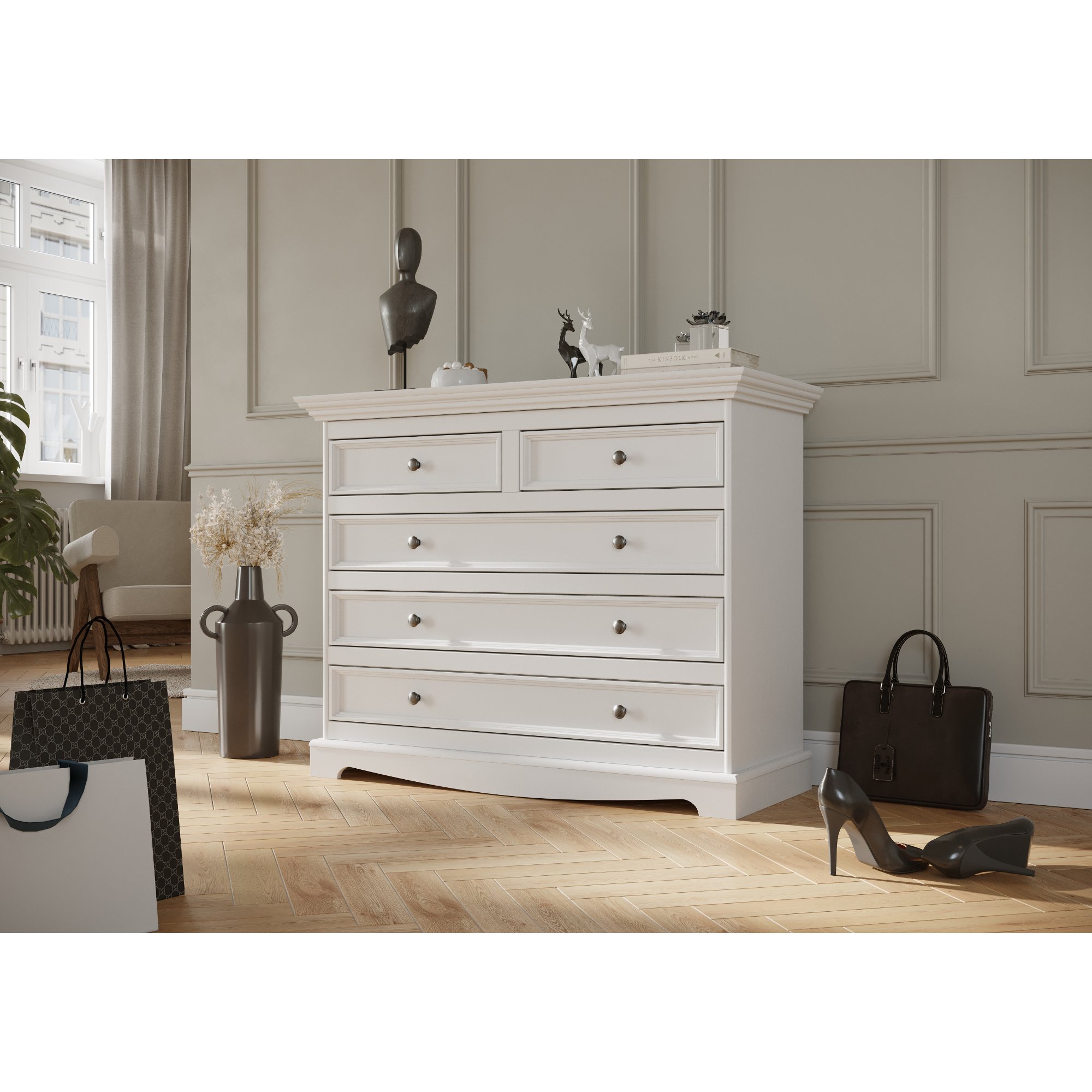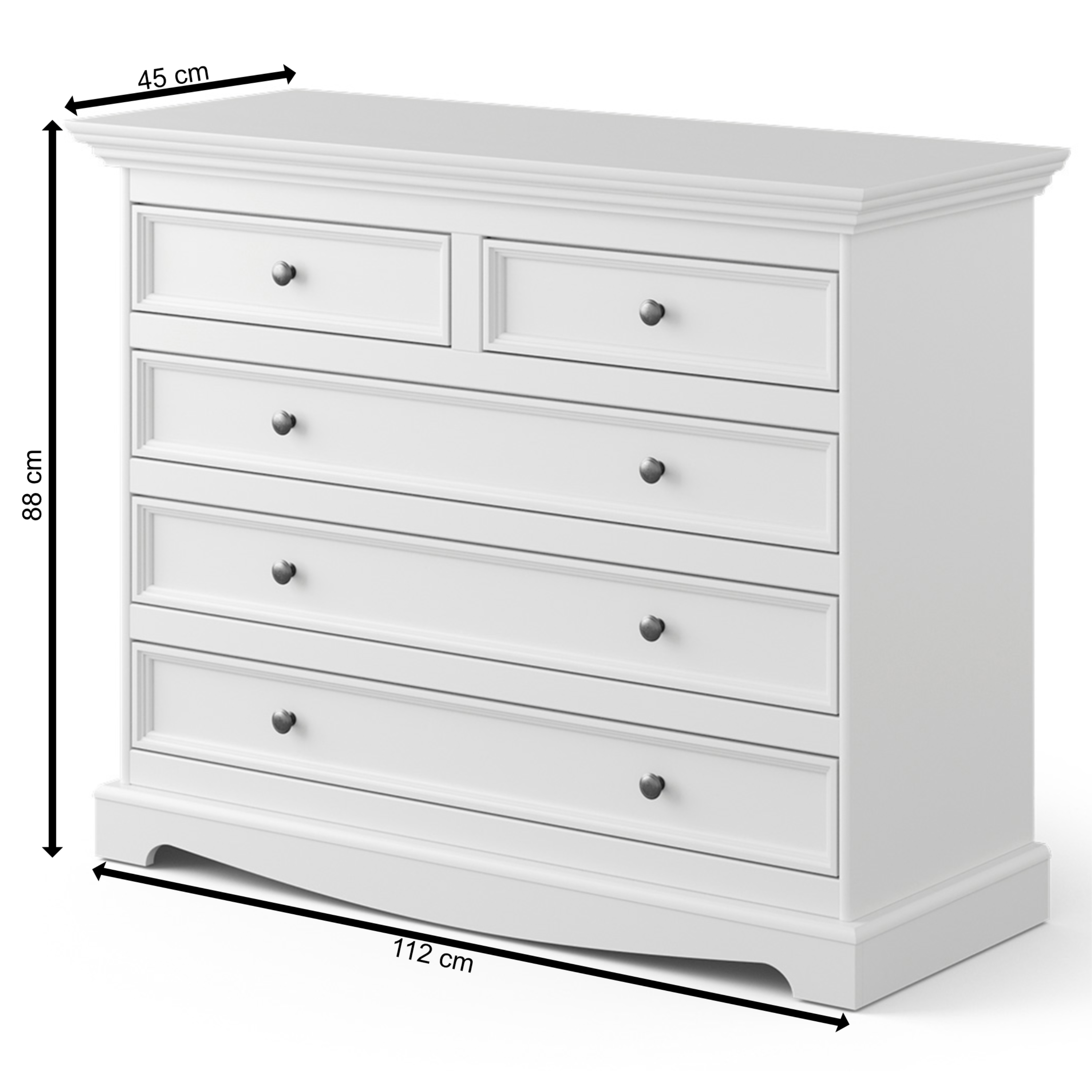Komoda BELLU 5S se vyznačuje ozdobnými prvky zdůrazňují charakter provensálského stylu. Použité dřevo finské borovice se vyznačuje vysokou plasticitou a měkkostí. Ekologické dřevo borovice je snadno zpracovatelné, a přitom odolné.