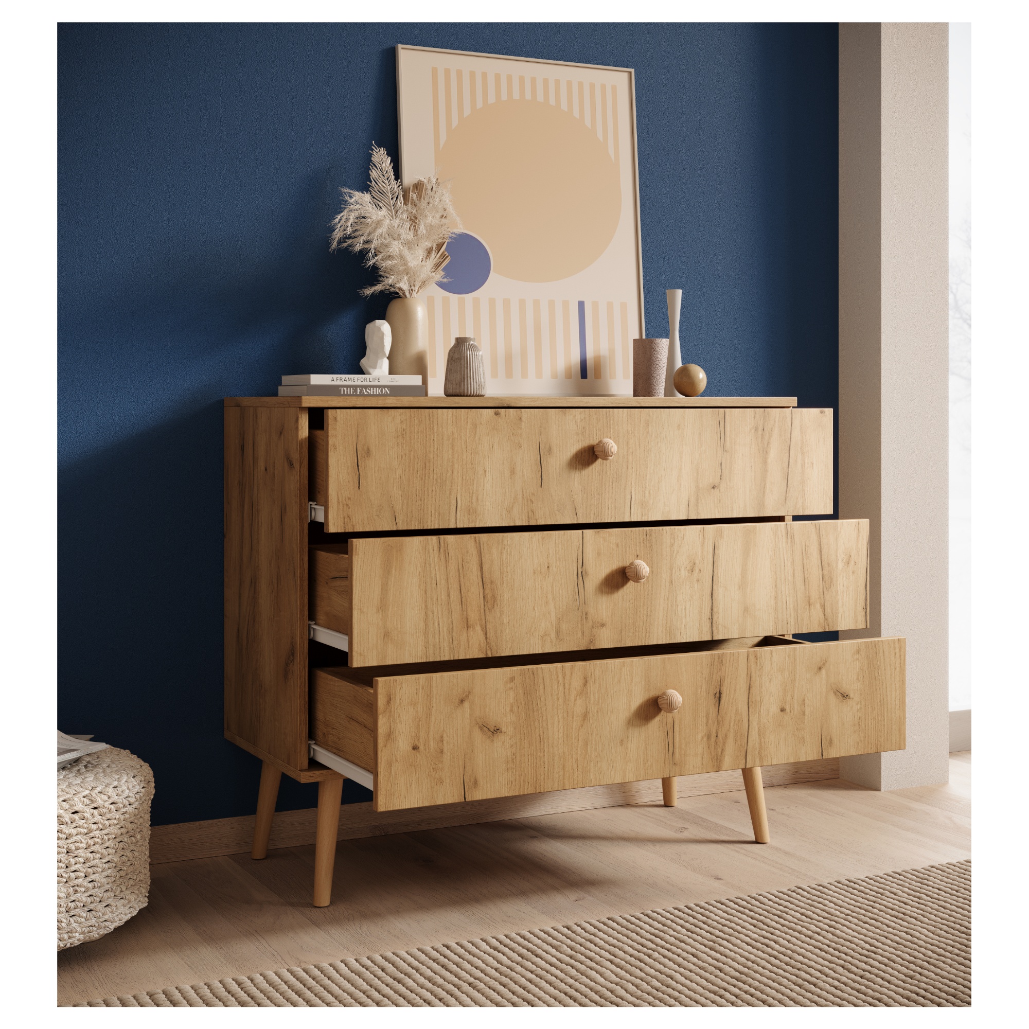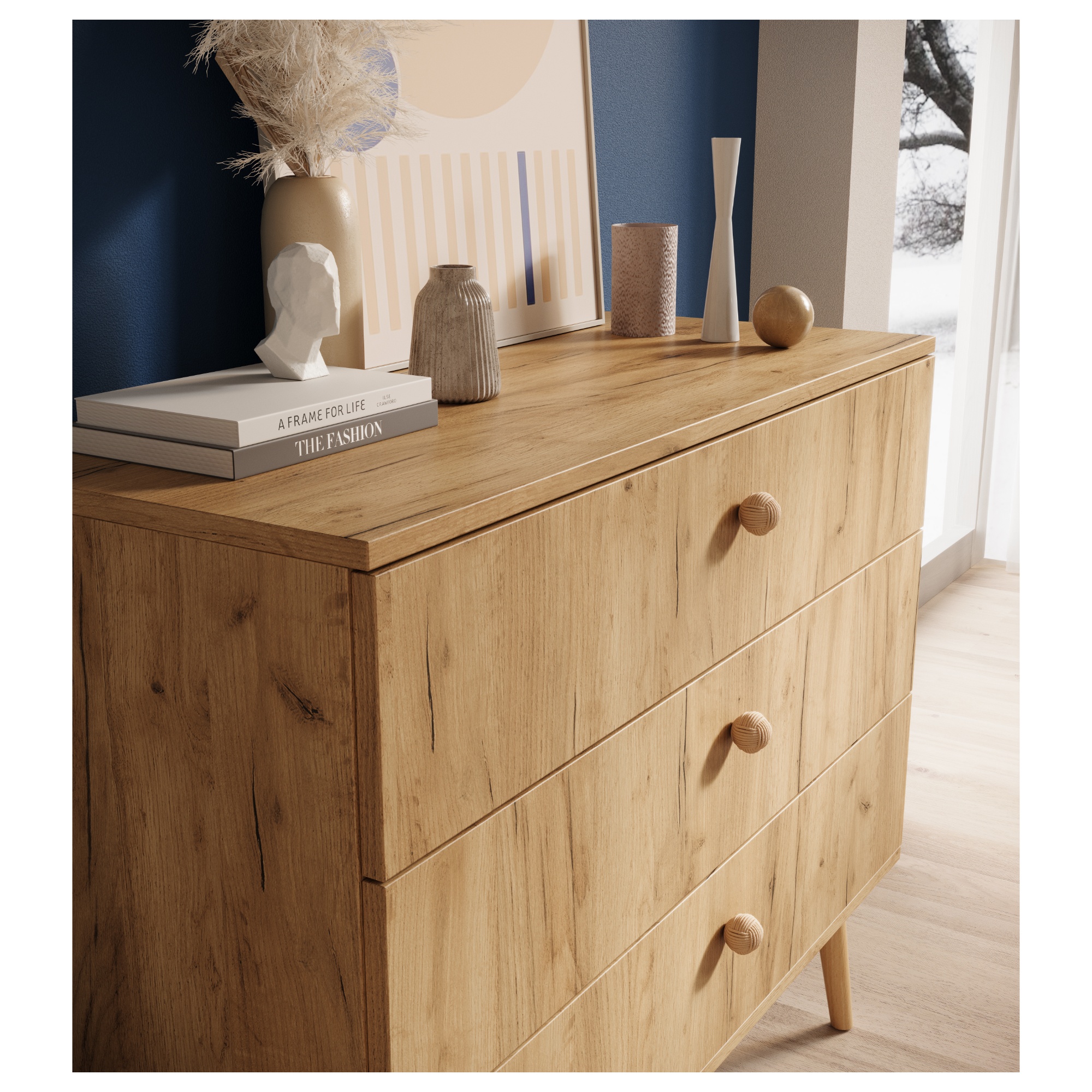 Díky 3 zásuvkám nabízí komoda dostatek úložného prostoru. Aby se se zásuvkami dobře manipulovalo, jsou vybaveny originálními provázkovými jutovými úchyty.