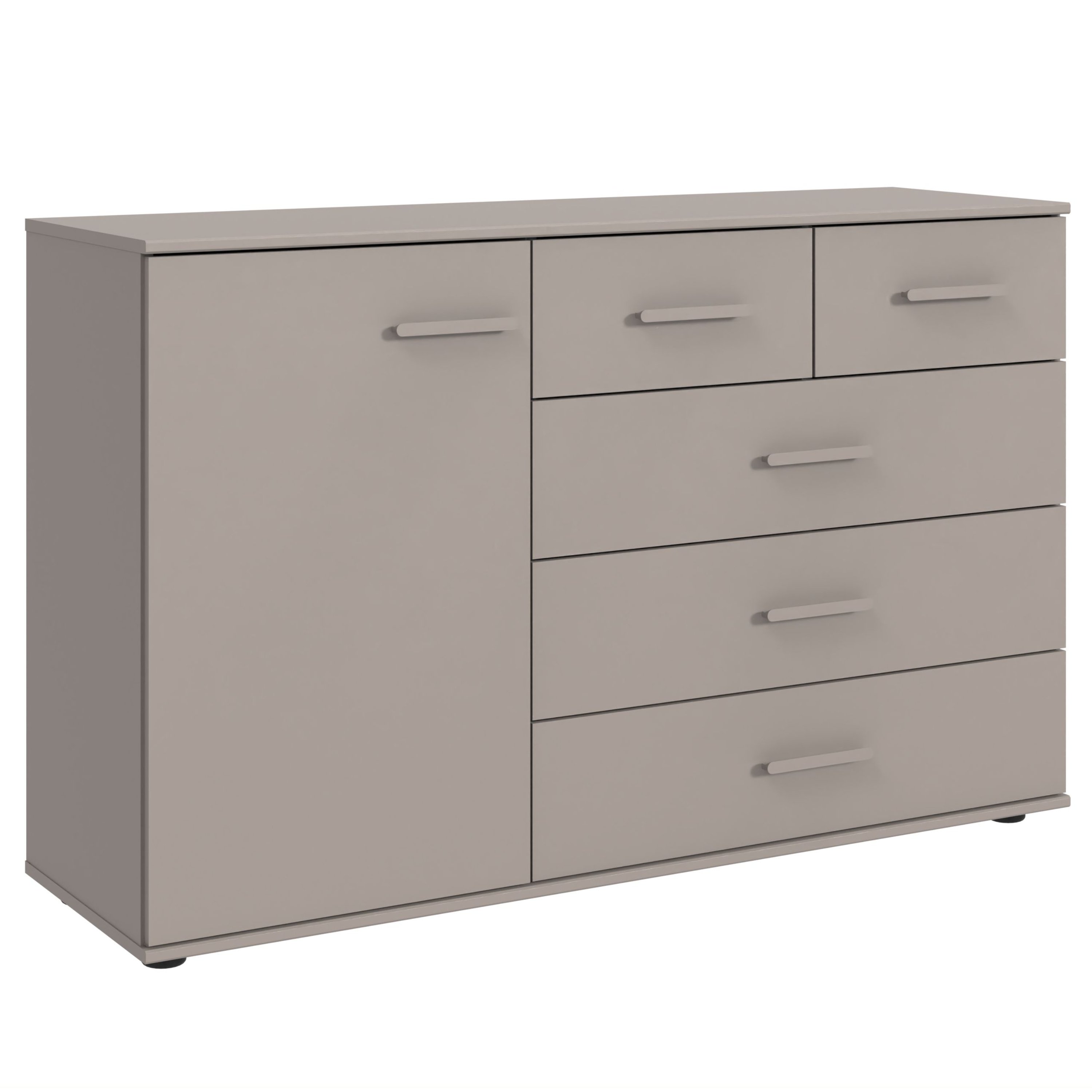 Poskytuje prostor za dvířky a ve pěti zásuvkách, který poslouží nejen k odložení oděvů, ale i pro různé drobnosti. Stylové úchytky usnadňují celkovou manipulaci. Povrch komody se vyznačuje snadnou údržbou.