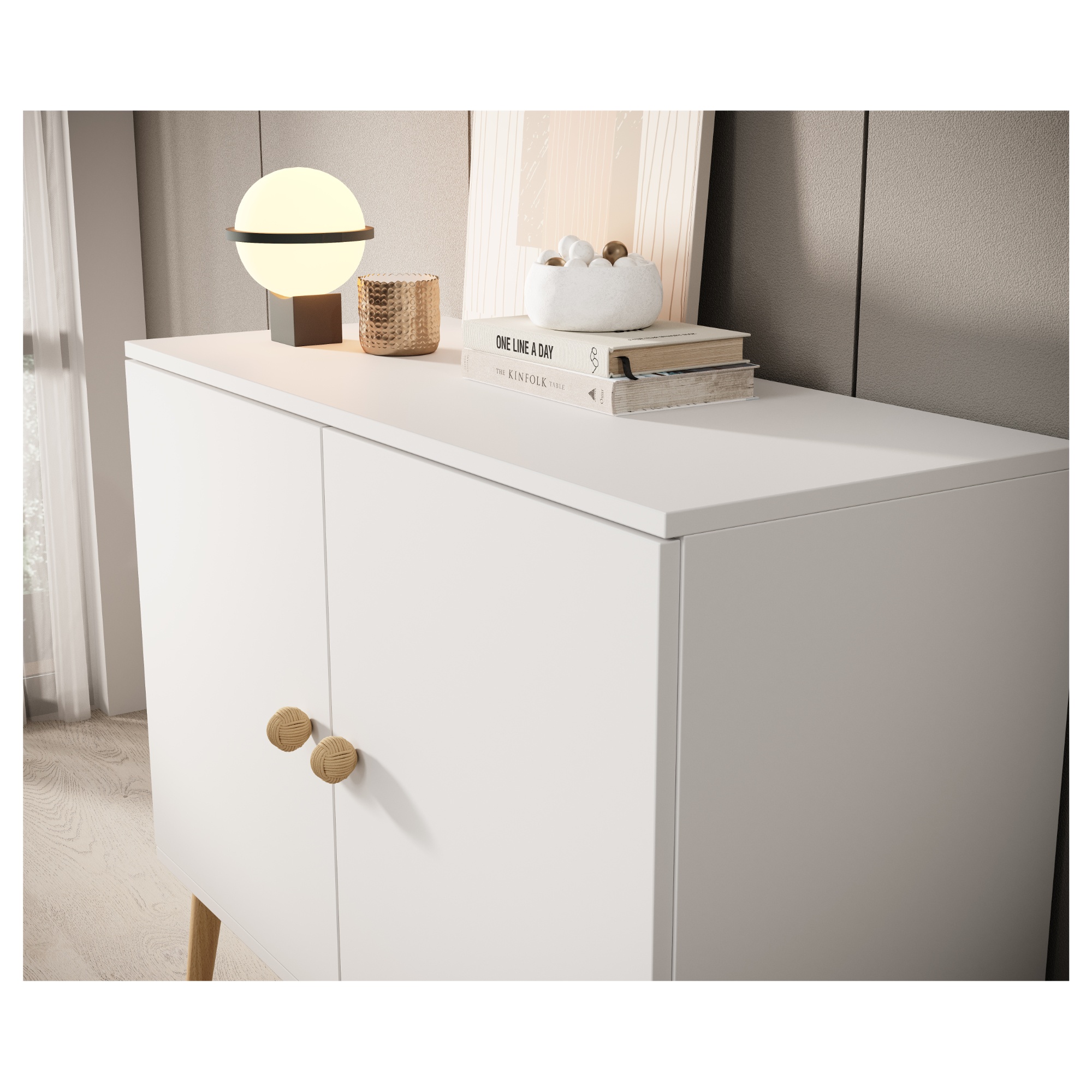 Díky 2 vloženým policím nabízí komoda dostatek úložného prostoru. Aby se s jejími dvířky dobře manipulovalo, jsou vybaveny originálními provázkovými jutovými úchyty.