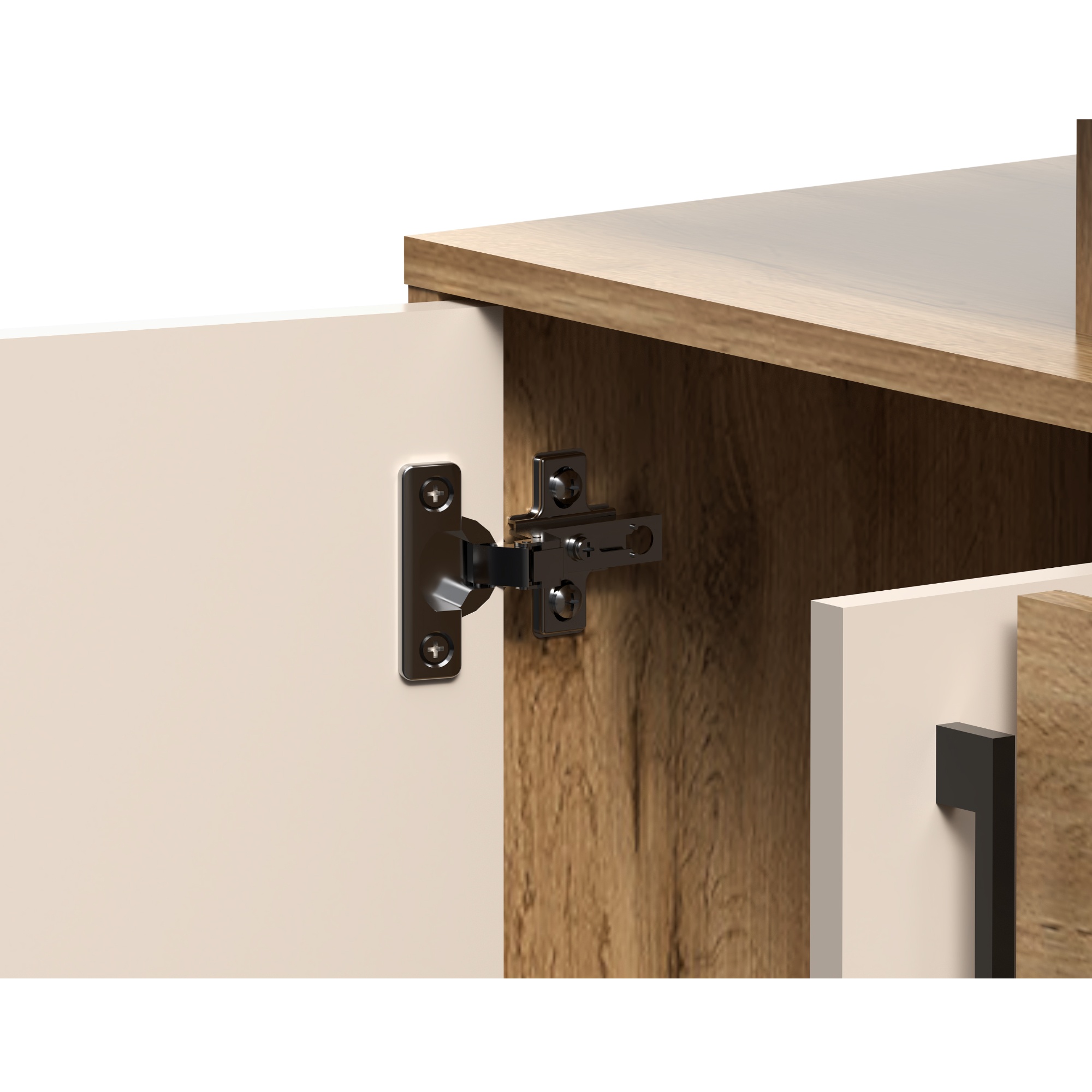 Za jejími dvířky najdete 2 vložené police, které vám umožní přehledné uložení všeho, co se do komody rozhodnete umístit. Nechybí ani 3 zásuvky. Aby se s dvířky a zásuvkami snadněji manipulovalo, jsou vybaveny praktickými úchyty.