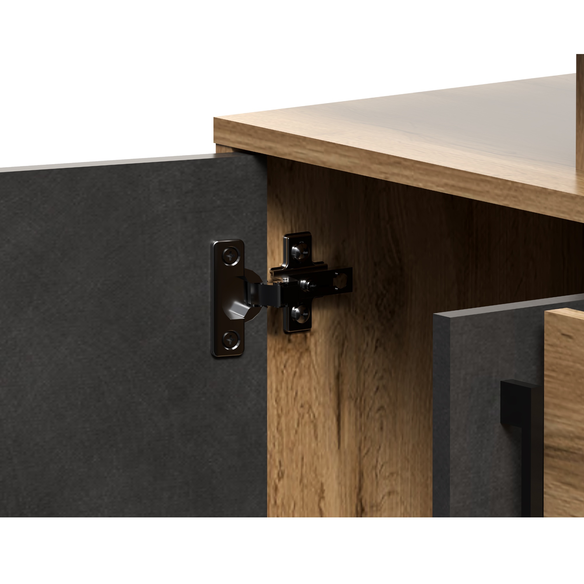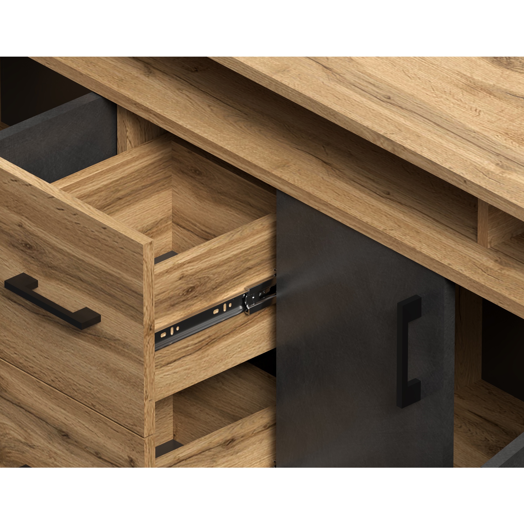 Za jejími dvířky najdete 2 vložené police, které vám umožní přehledné uložení všeho, co se do komody rozhodnete umístit. Nechybí ani 3 zásuvky. Aby se s dvířky a zásuvkami snadněji manipulovalo, jsou vybaveny praktickými úchyty.