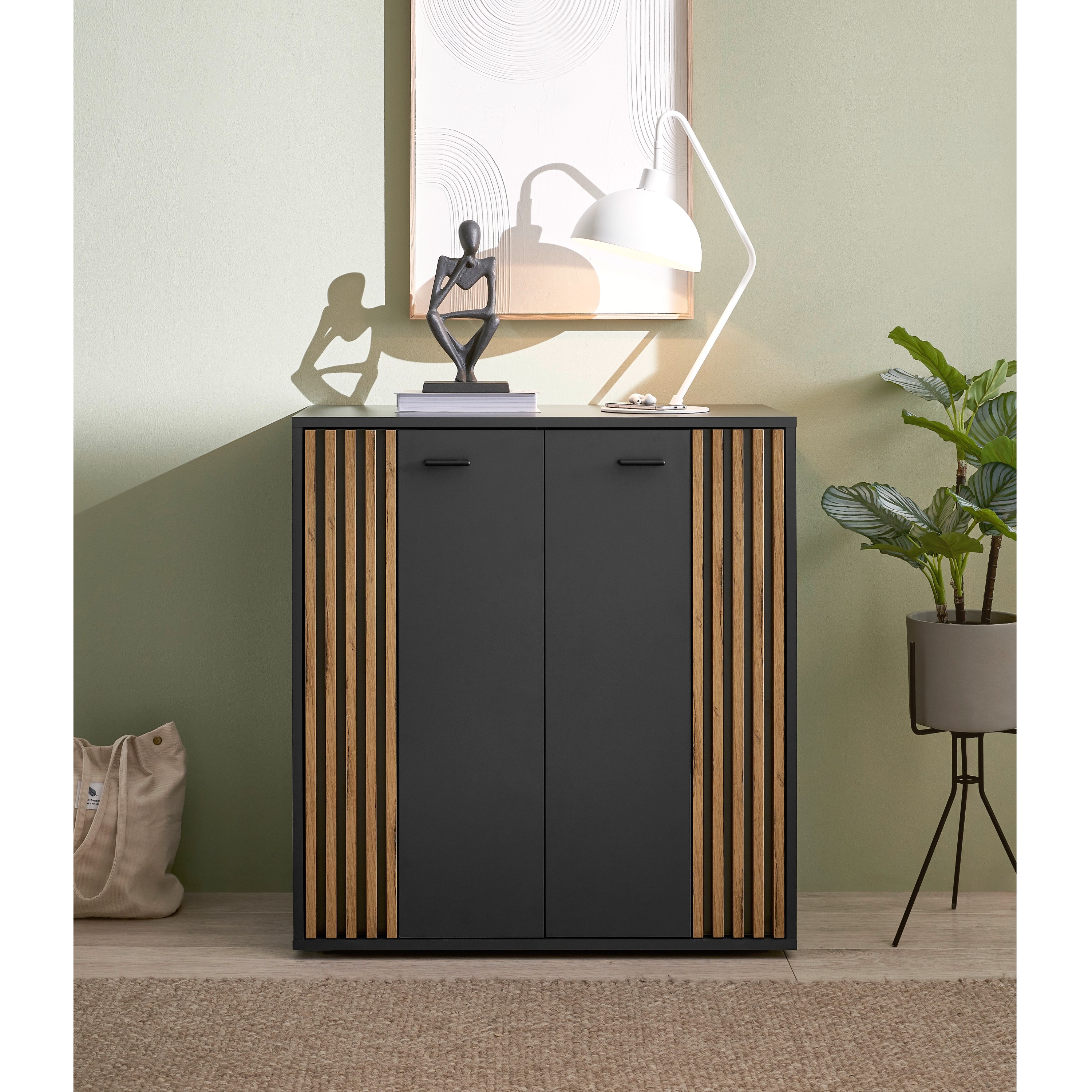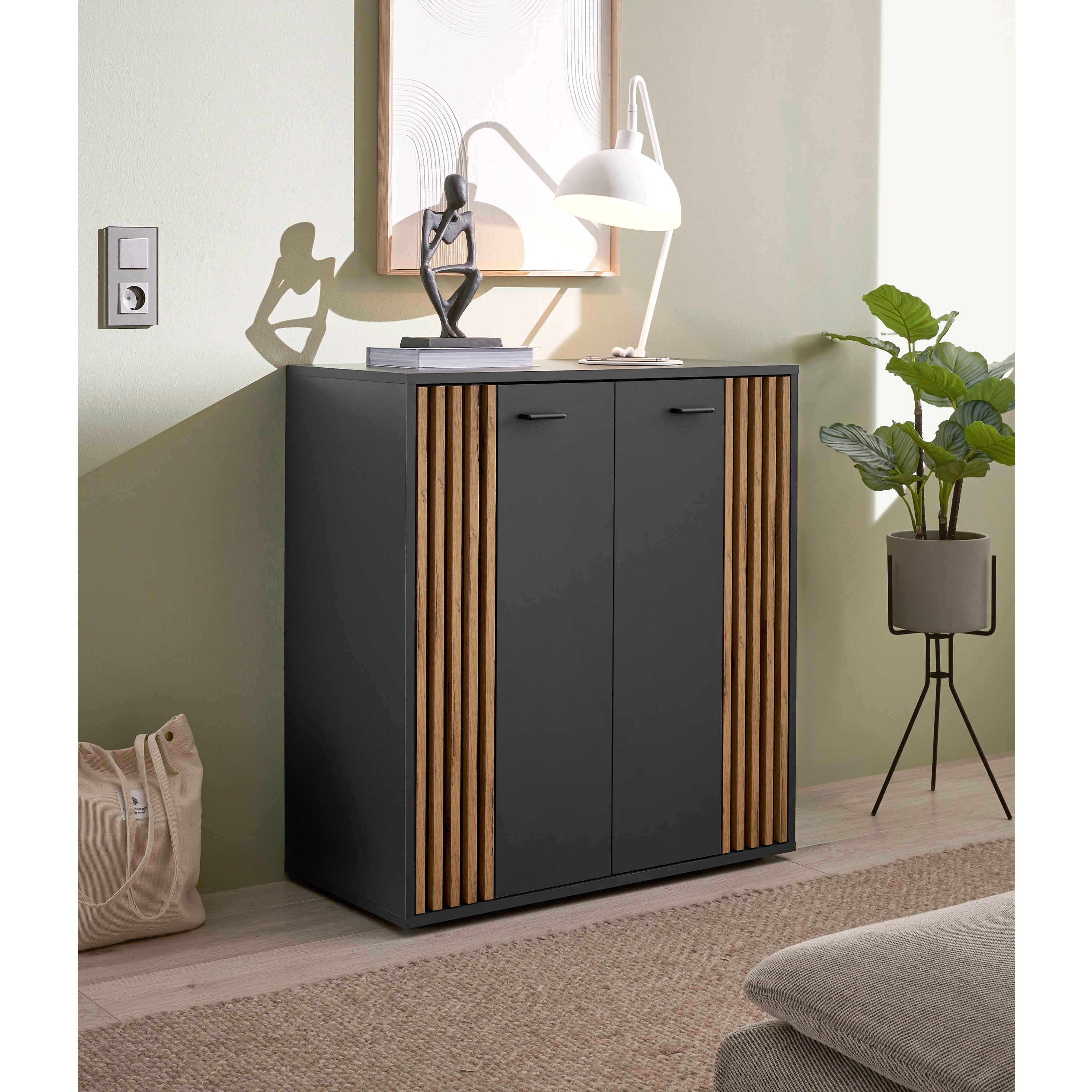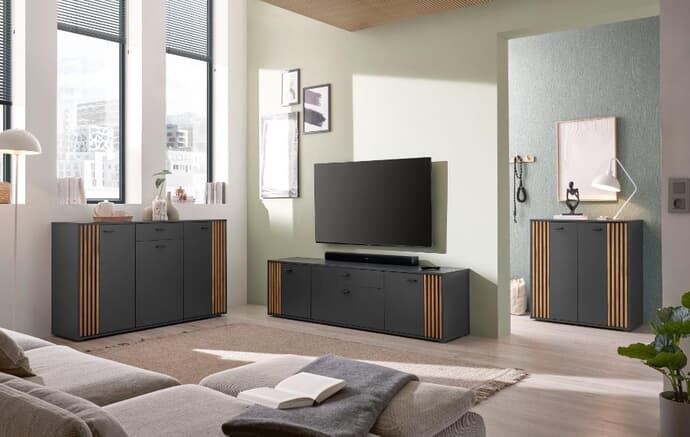 Komoda DUBLIN 2 v moderním designu zaujme výraznou kombinací antracitové barvy a přírodního dekoru dubu evoke, kterou doplňují dekorativní lamely na bocích. Ty dodávají nábytku osobitý charakter a vytvářejí zajímavý vizuální prvek, který oživí každý interiér.