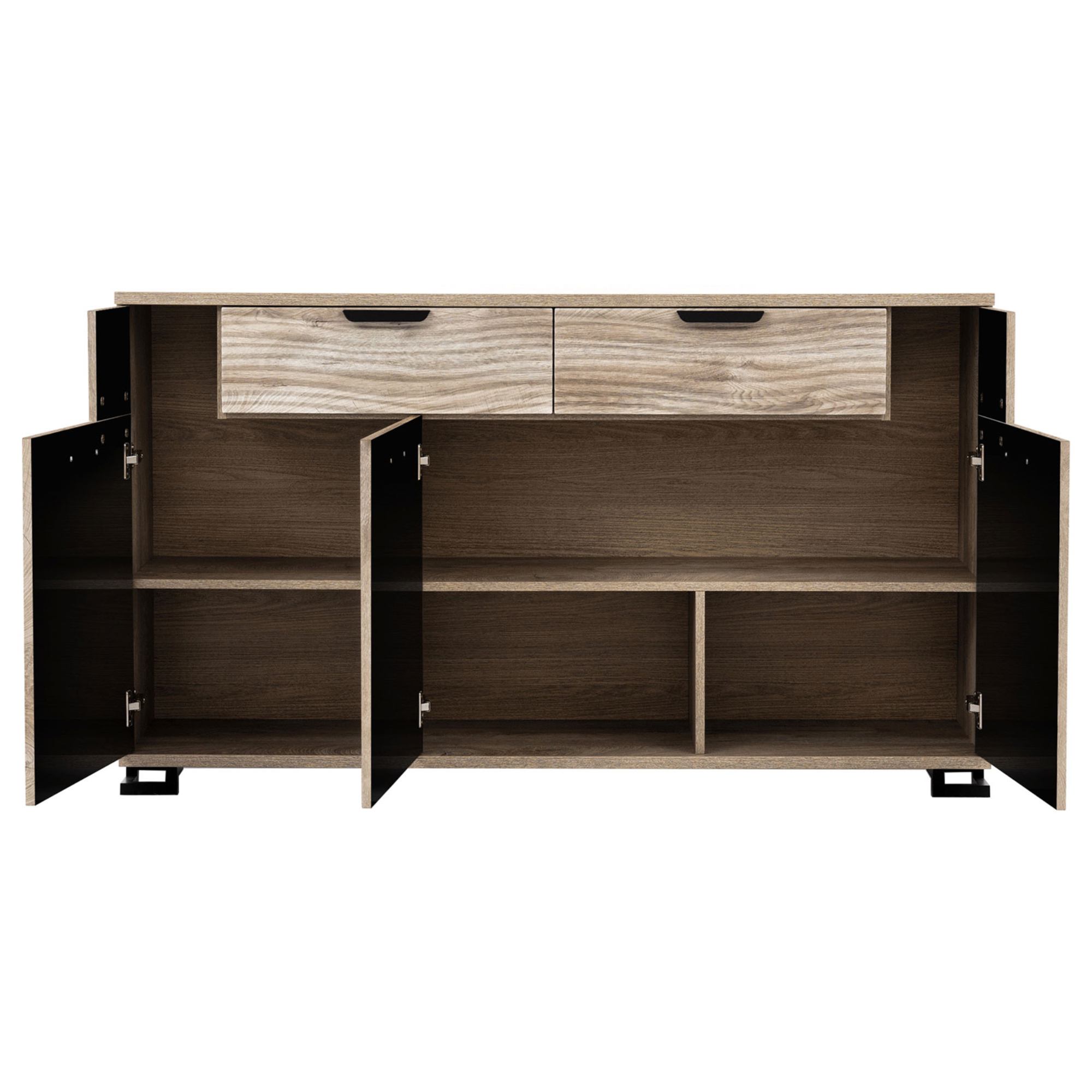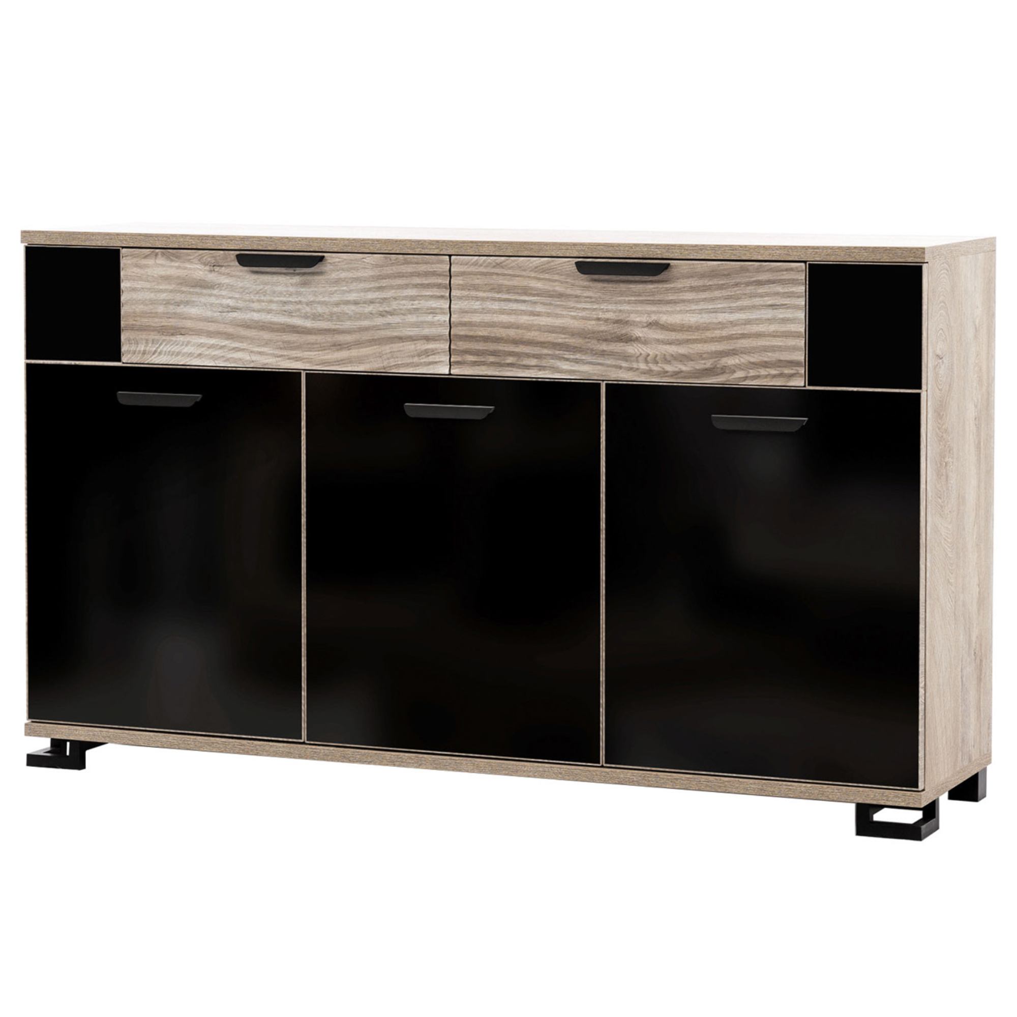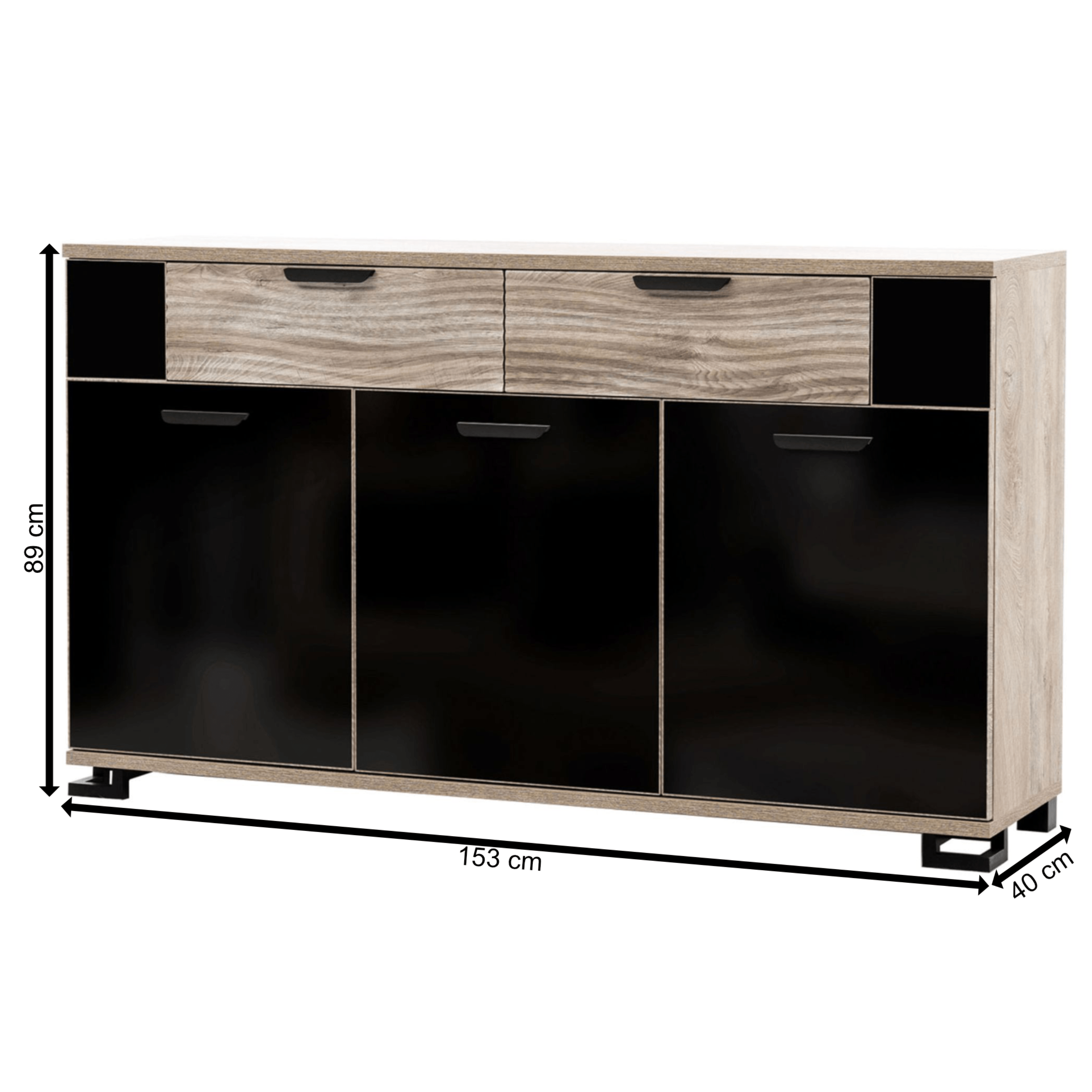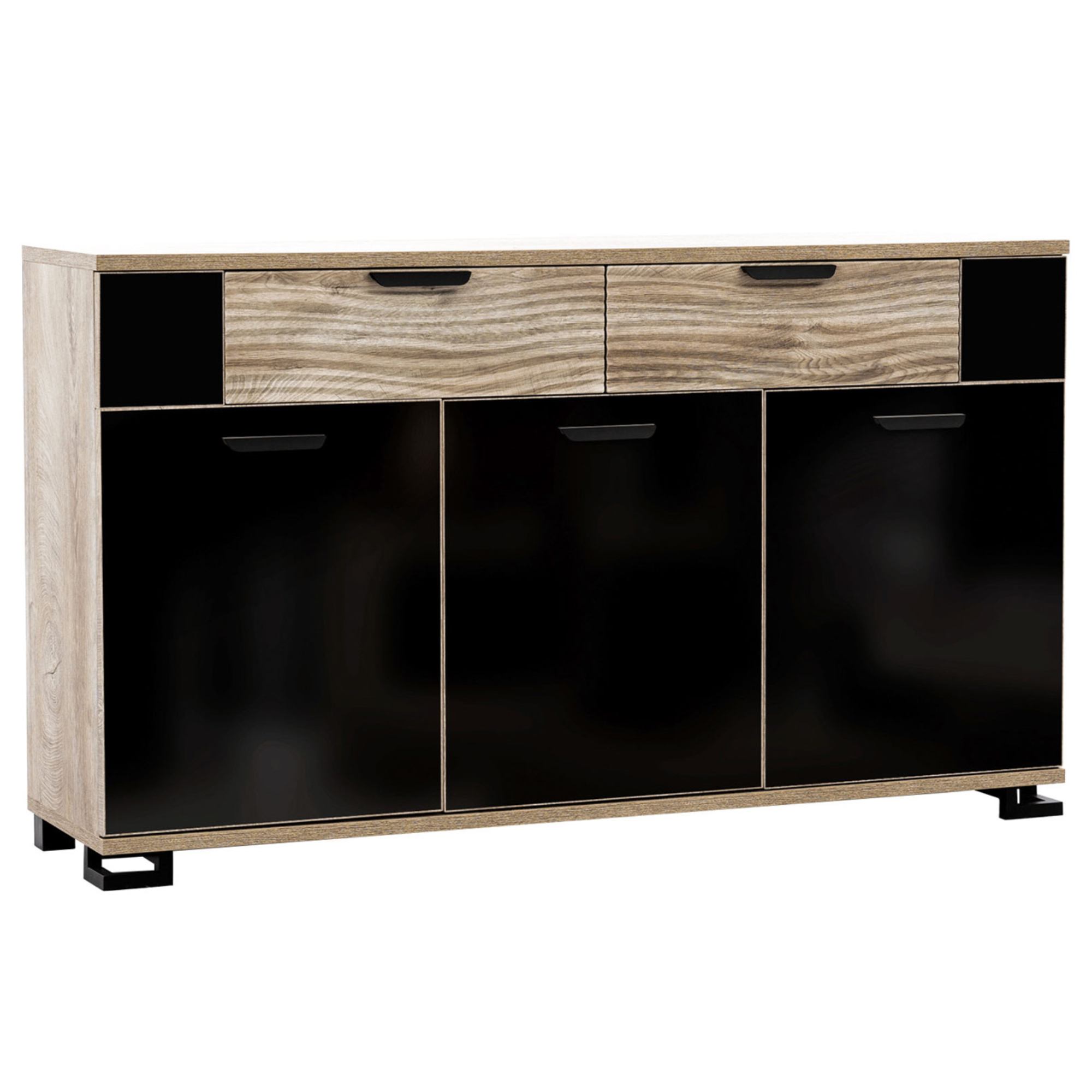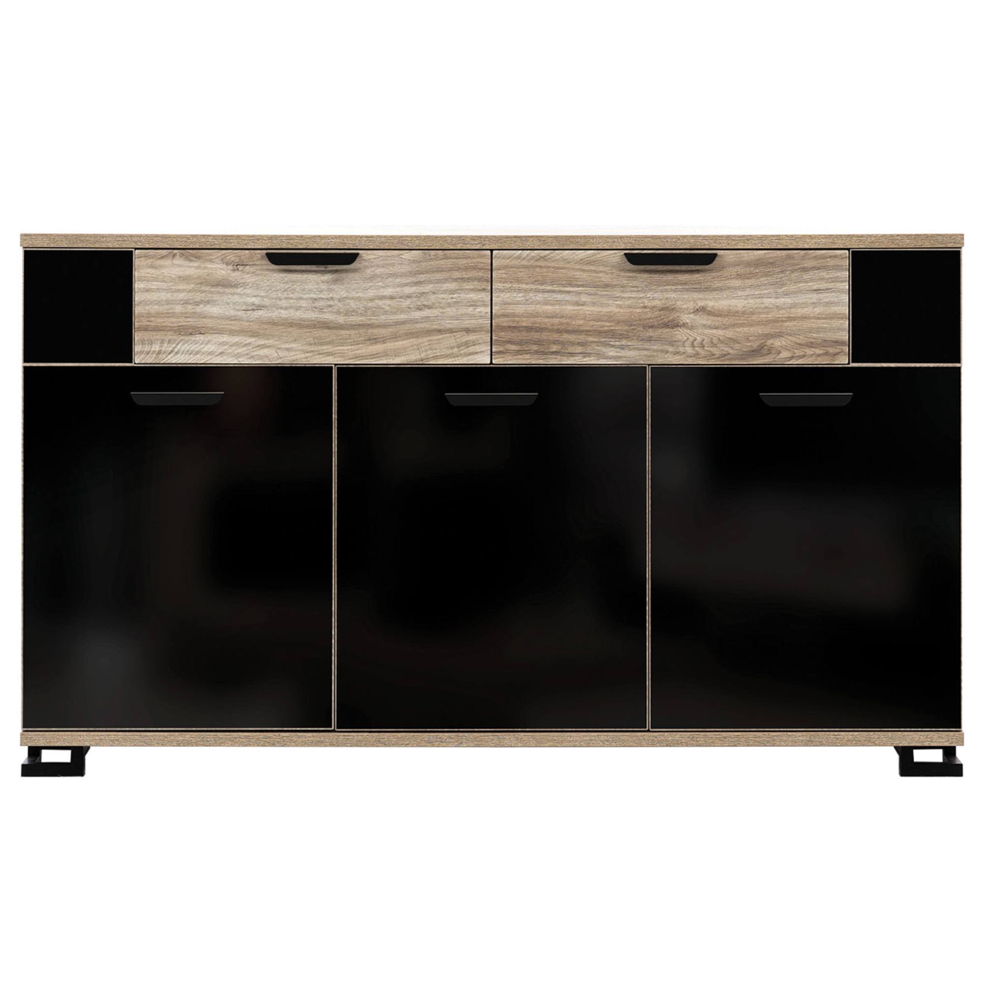 Kombinace přírodního dekoru dubu s lesklými prvky v odstínu černé barvy vytváří útulnou atmosféru. Obdržíte bohatý úložný prostor v podobě tří dvířek s vnitřními policemi a zásuvkami, do kterých umístíte vše potřebné. Manipulaci usnadní decentní plastové úchytky. Veškeré dekorace, co chcete mít na očích umístíte na horní desku. Celou konstrukci podepírají stylové nožky. Povrch komody se vám bude snadno udržovat.