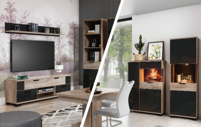- Přírodní dekor dubu v kombinaci s lesklými prvky