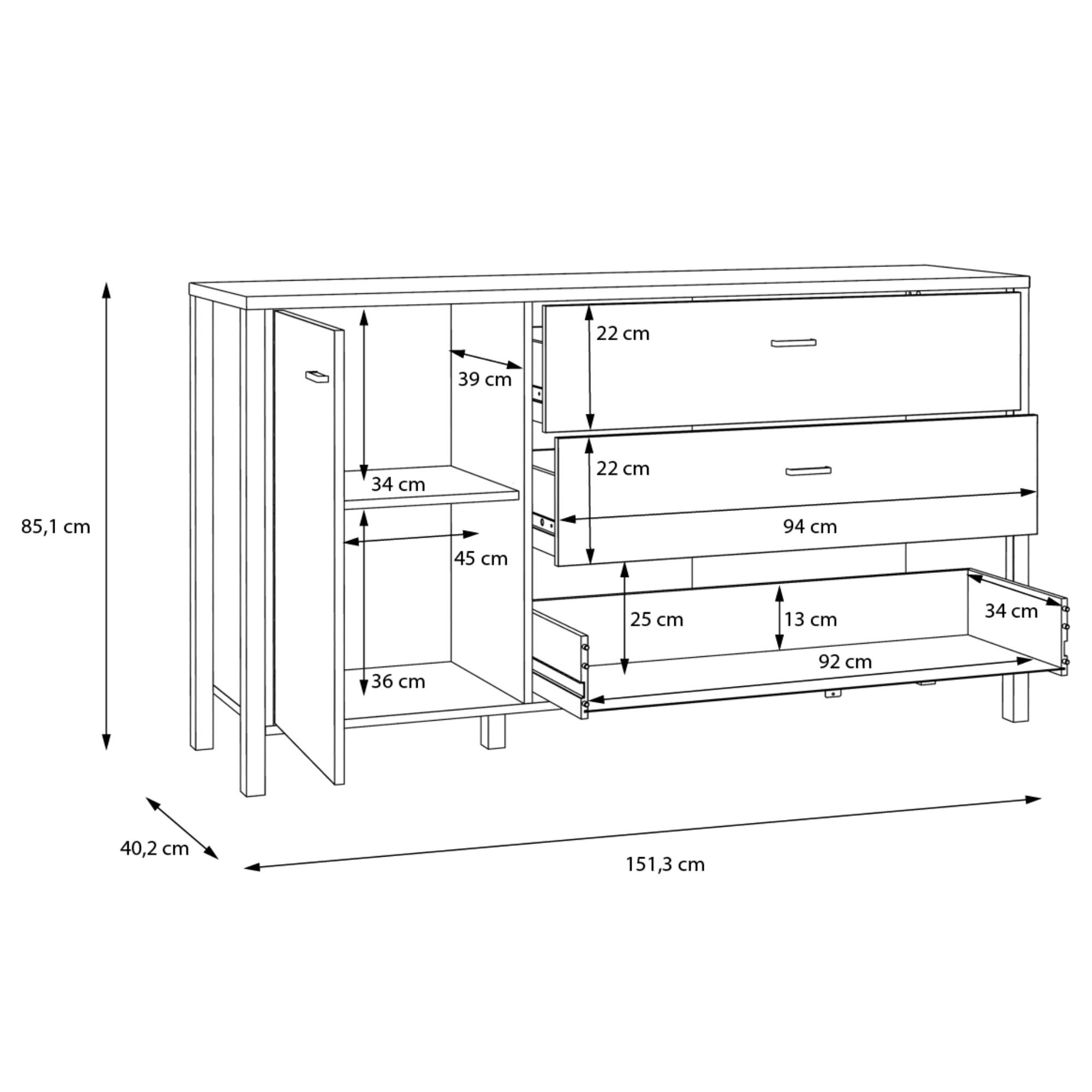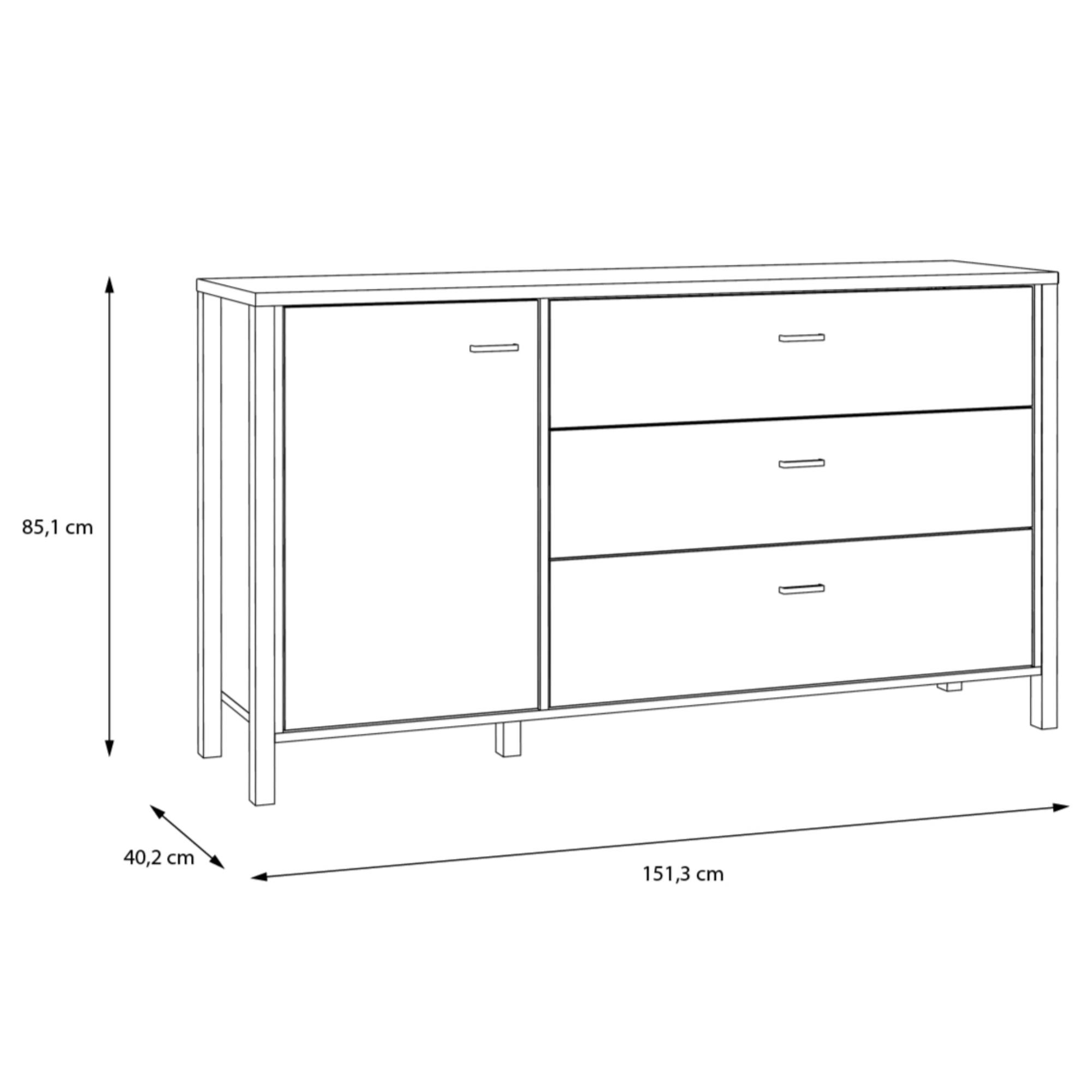 Naleznete zde místo pro vše potřebné, ať už se jedná o vystavení dekorací či odložení předmětů, které nechcete mít na očích. Komoda disponuje uzavíratelným úložným prostorem se třemi zásuvkami a jednou vloženou policí. Decentní kovové úchytky vám usnadní celkovou manipulaci. ABS hrany navíc zvyšují odolnost celého korpusu, který se vám bude zároveň jednoduše udržovat.