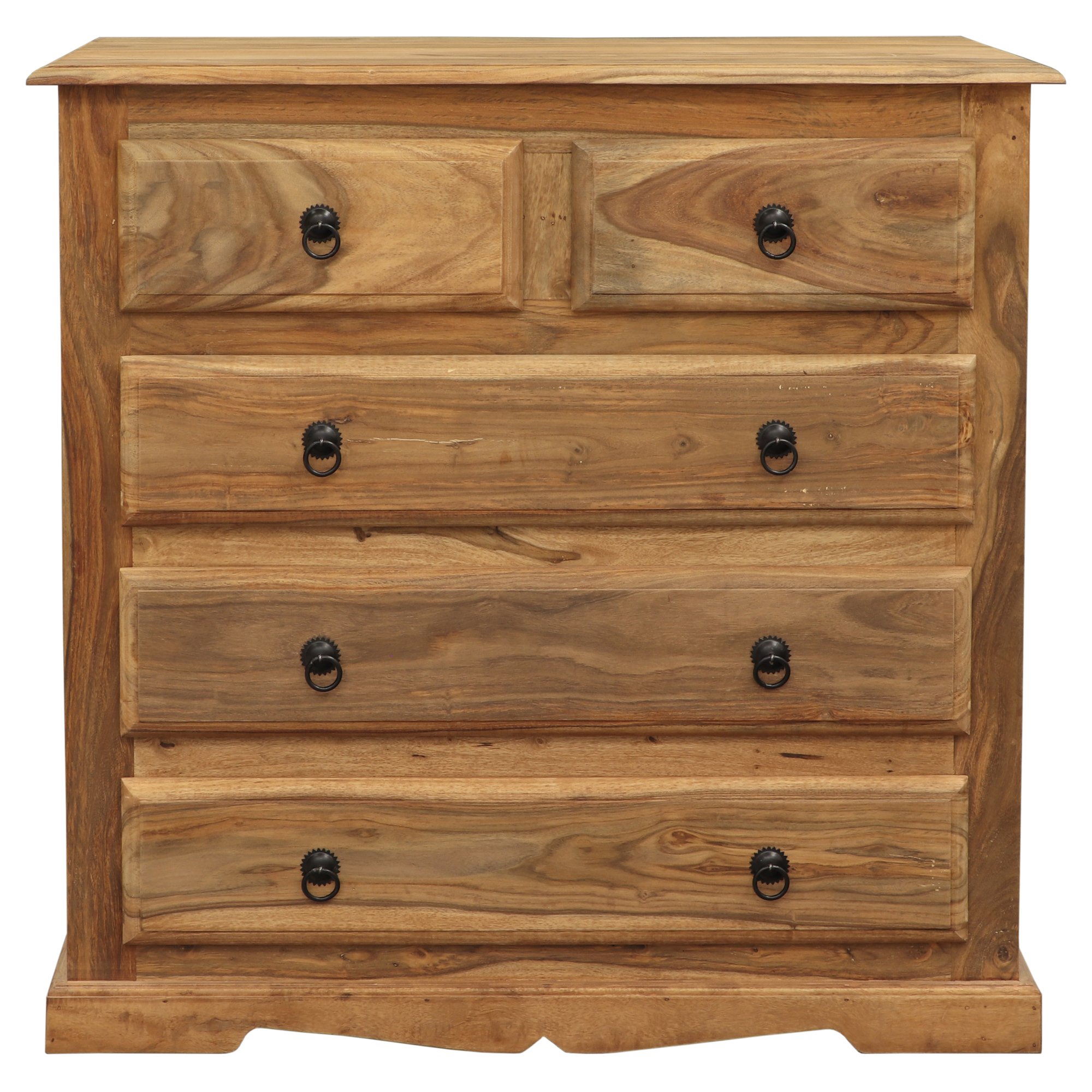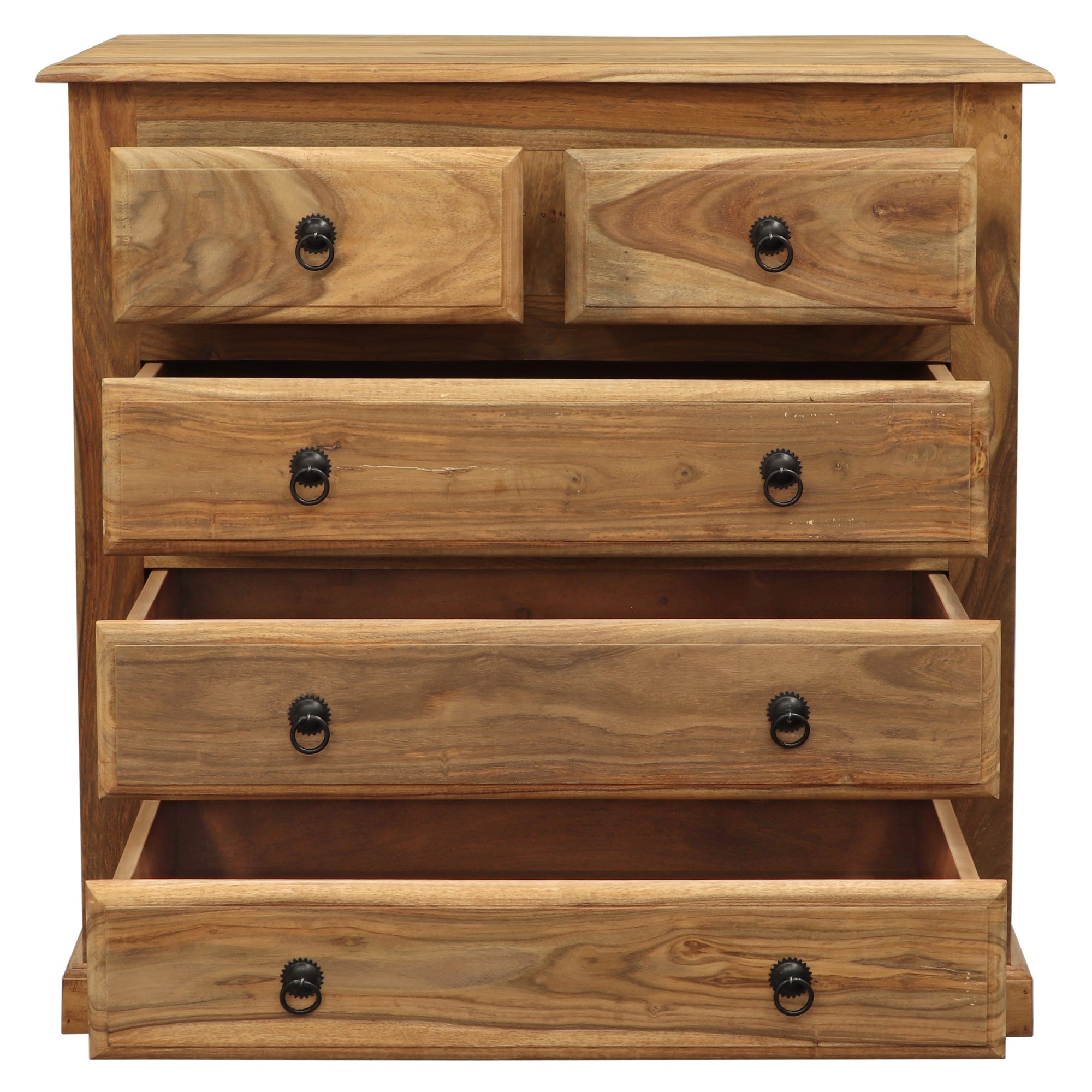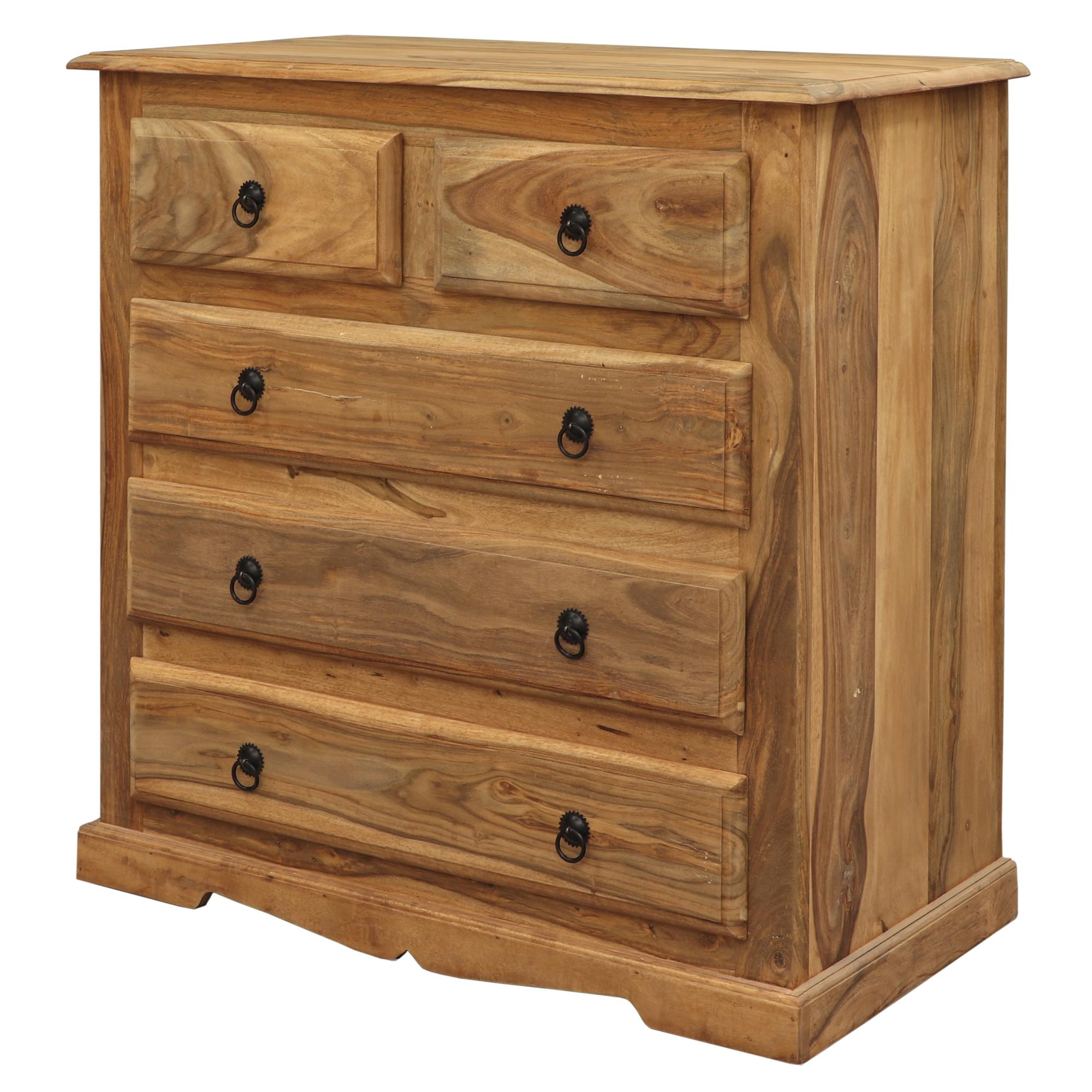Komoda nabízí praktické úložné řešení díky 5 zásuvkám, z nichž dvě horní jsou menší a tři spodní prostornější. Každá zásuvka je opatřena stylovými kovovými úchyty, které podtrhují rustikální charakter nábytku. Robustní konstrukce a precizní zpracování zaručují stabilitu a funkčnost, přičemž komoda skvěle zapadne do moderních i tradičních interiérů.