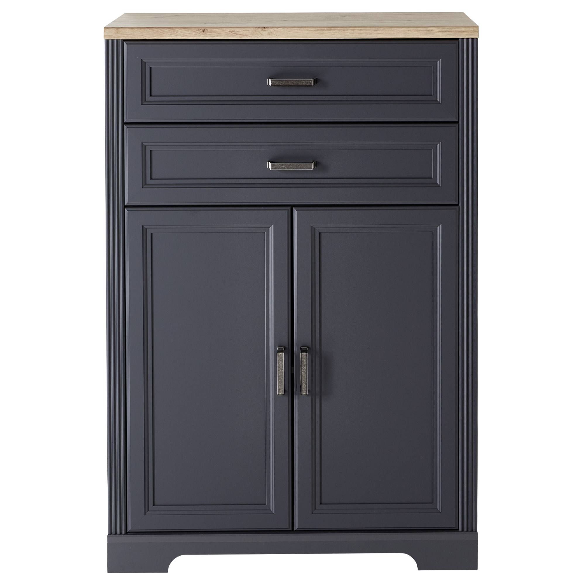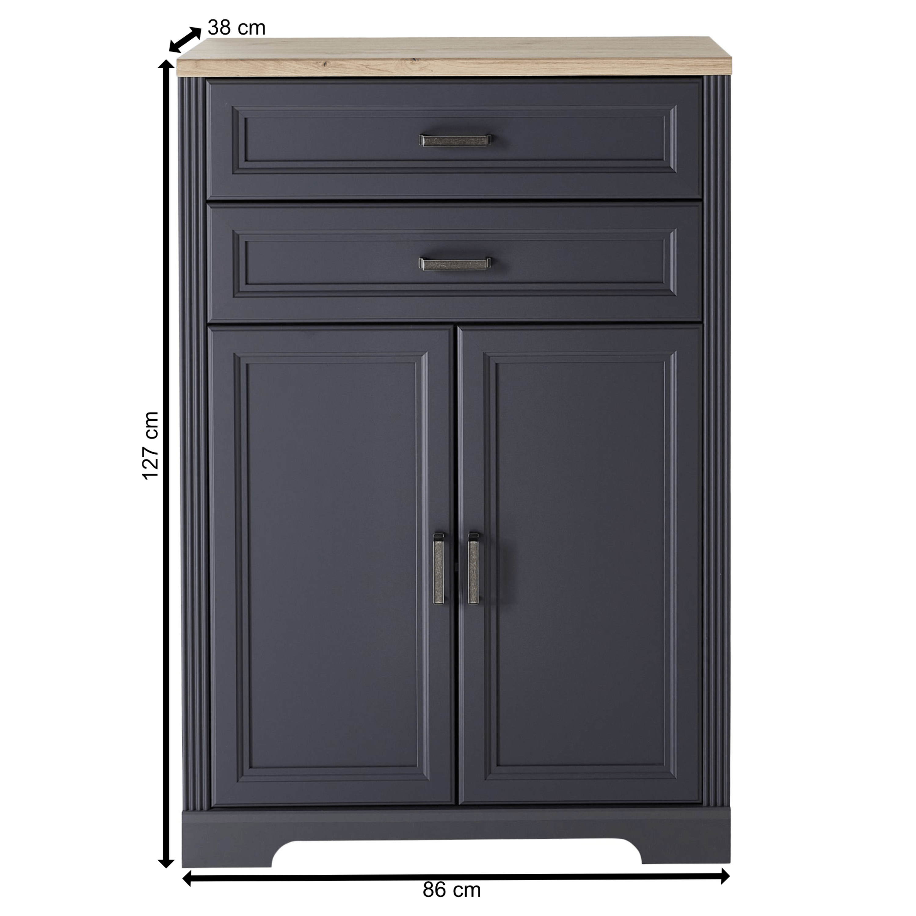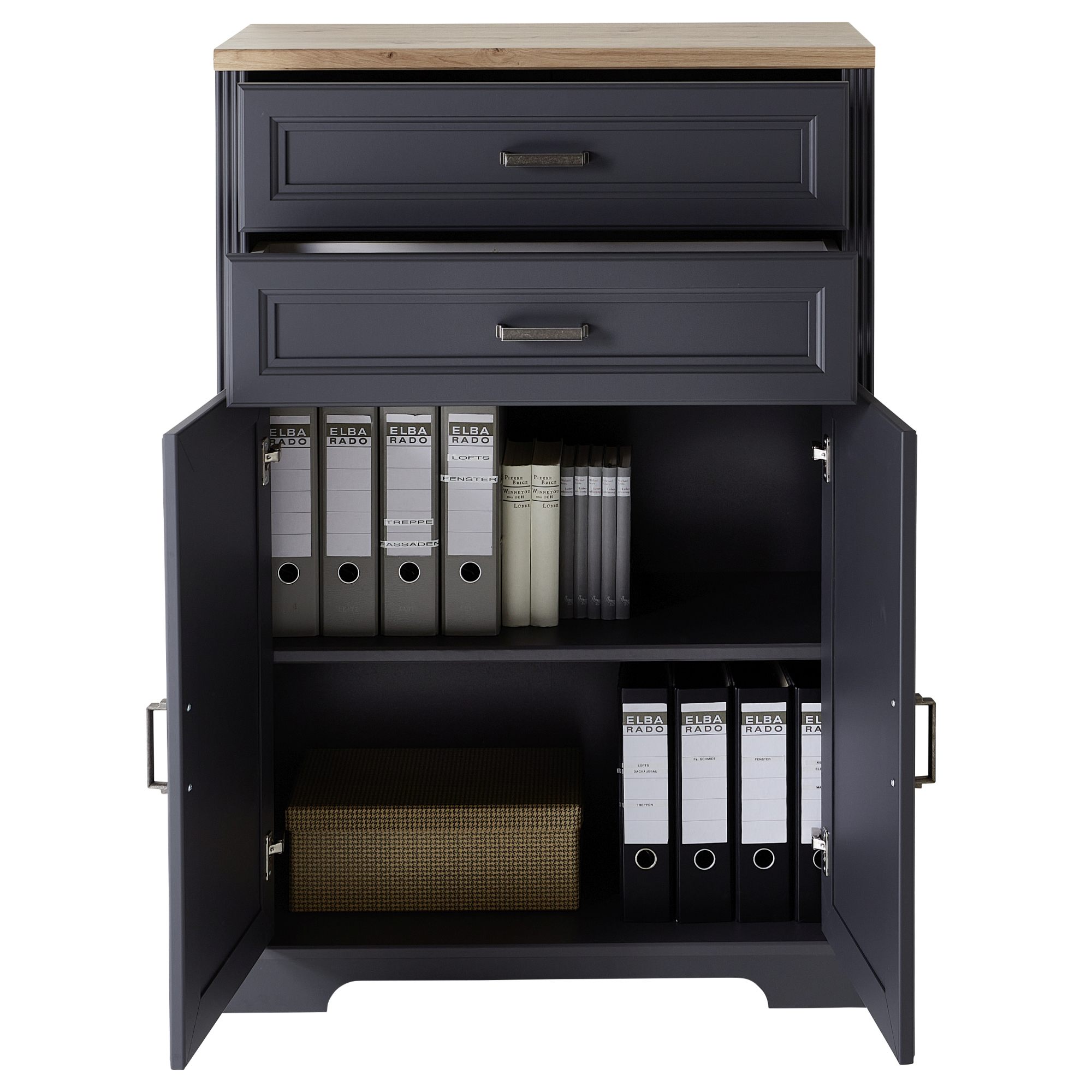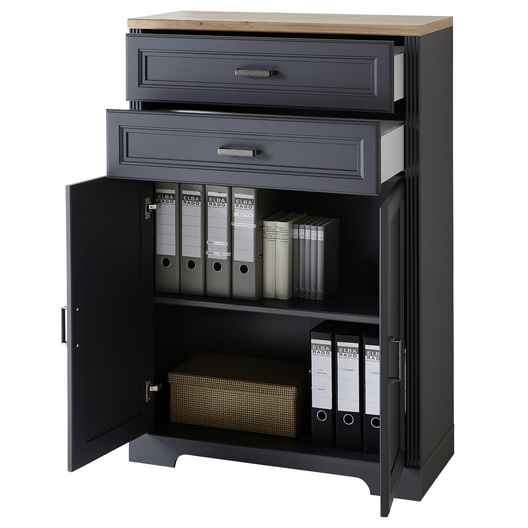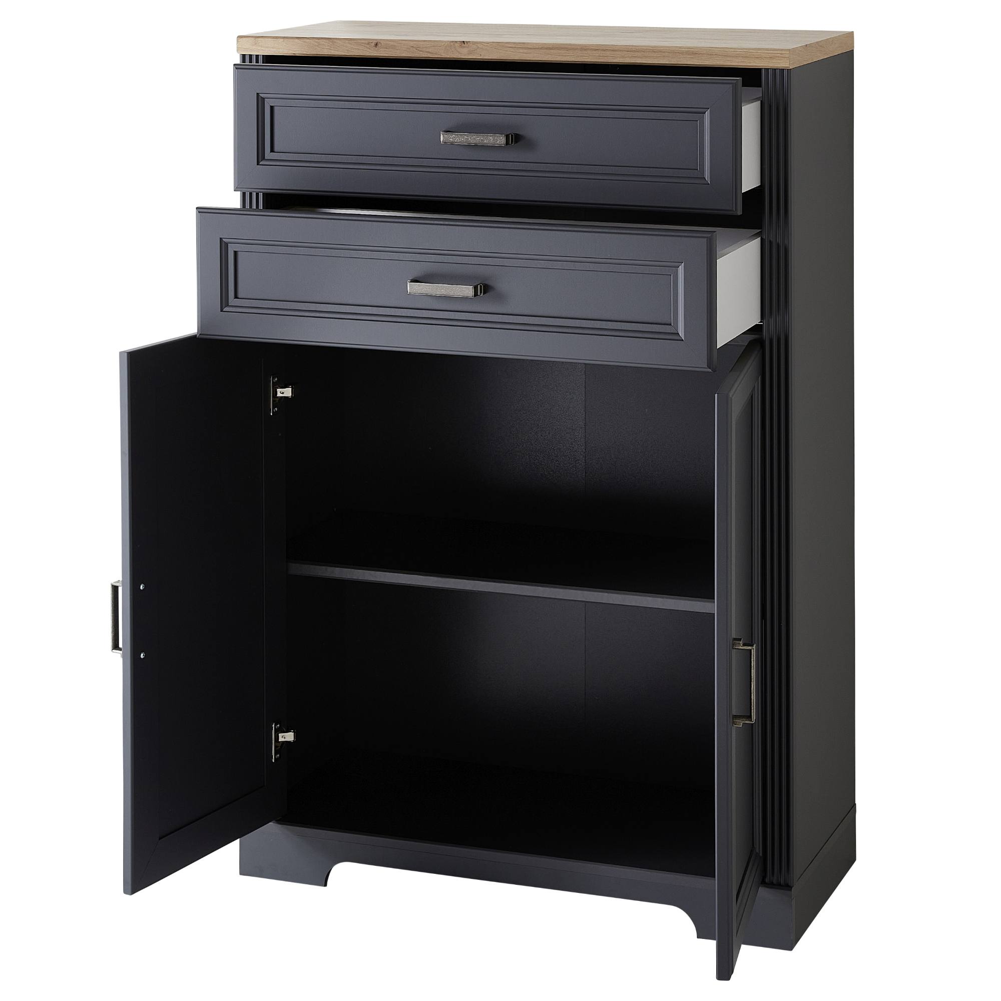 Dostatečný úložný prostor zajišťuje místo za dvířky a dvojce zásuvek s měkkým dovíráním SOFT CLOSE. Ideální místo v nich naleznou všechny potřebné kancelářské pomůcky a nutnosti. Zásuvky a dvířka disponují praktickými kovovými úchyty. Komoda je vyrobena z dřevovláknitých desek MDF s dekorativním frézováním.