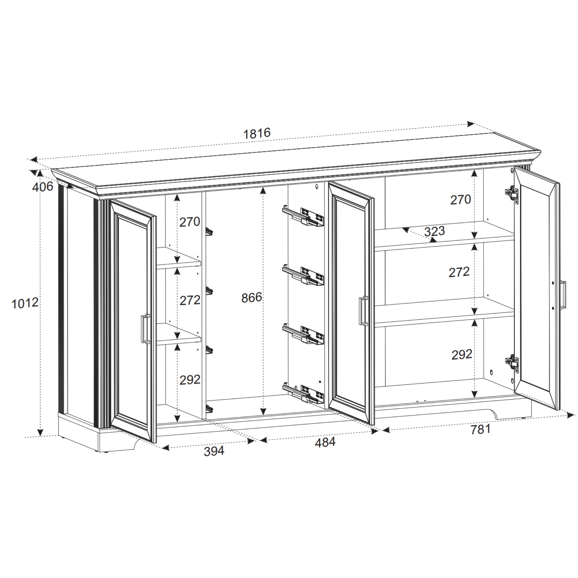 Dostatečný úložný prostor zajišťuje místo za dvířky a zásuvkami s měkkým dovíráním SOFT CLOSE. Uschováte zde vše potřebné, co nechcete mít přímo na očích. Zásuvky a dvířka disponují praktickými kovovými úchyty. Komoda je vyrobena z dřevovláknitých desek MDF s dekorativním frézováním.